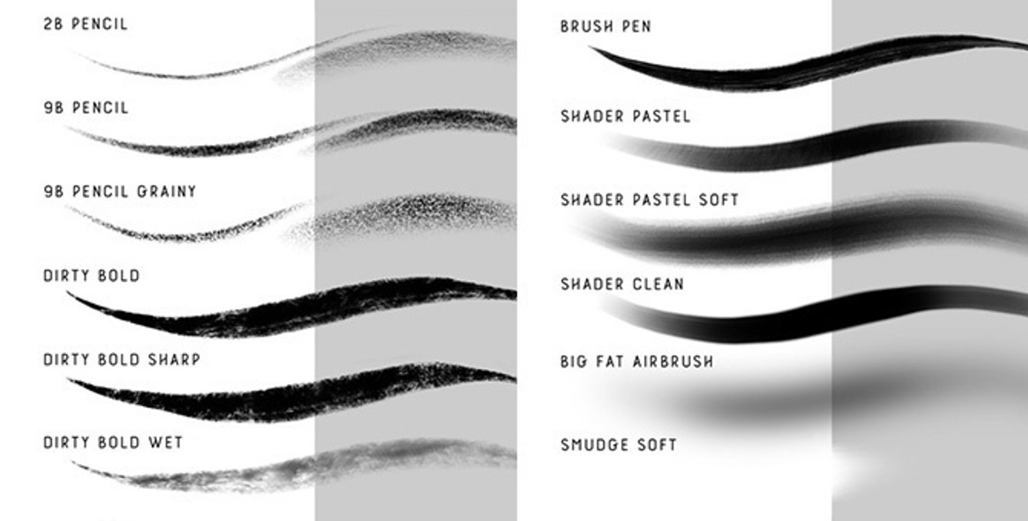 Brushes Included in the Set: - 2B Pencil - 9B Pencil - 9B Pencil Grainy - Dirty Bold - Dirty Bold Sharp - Dirty Bold Wet - Brush Pen - Shader Pastel - Shader Pastel Soft - Shader Clean - Big Fat Airbrush