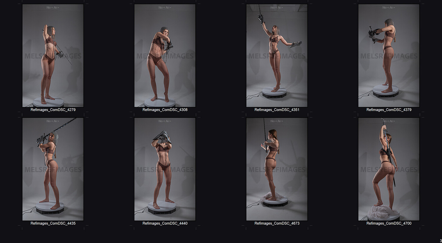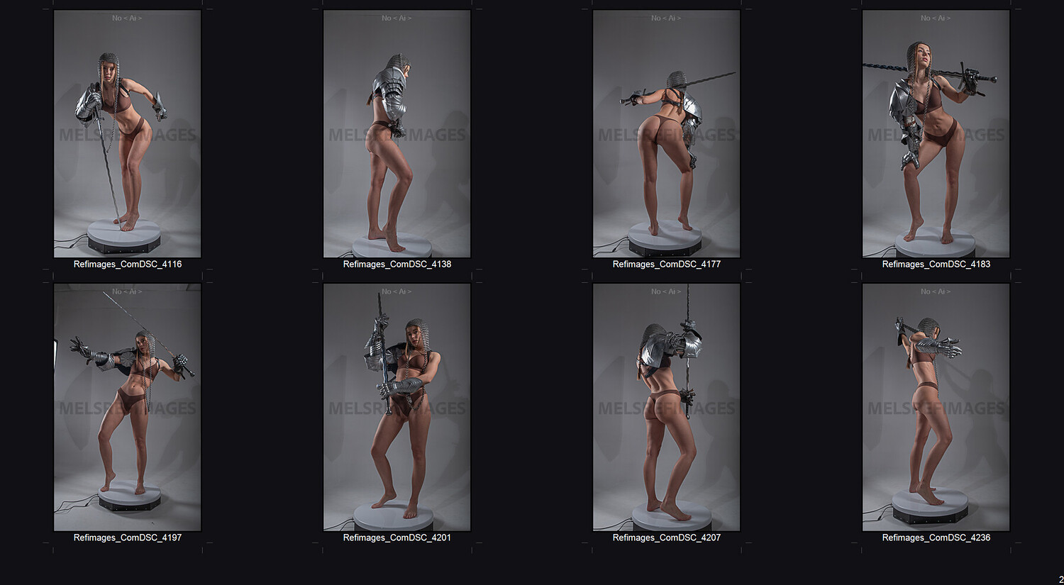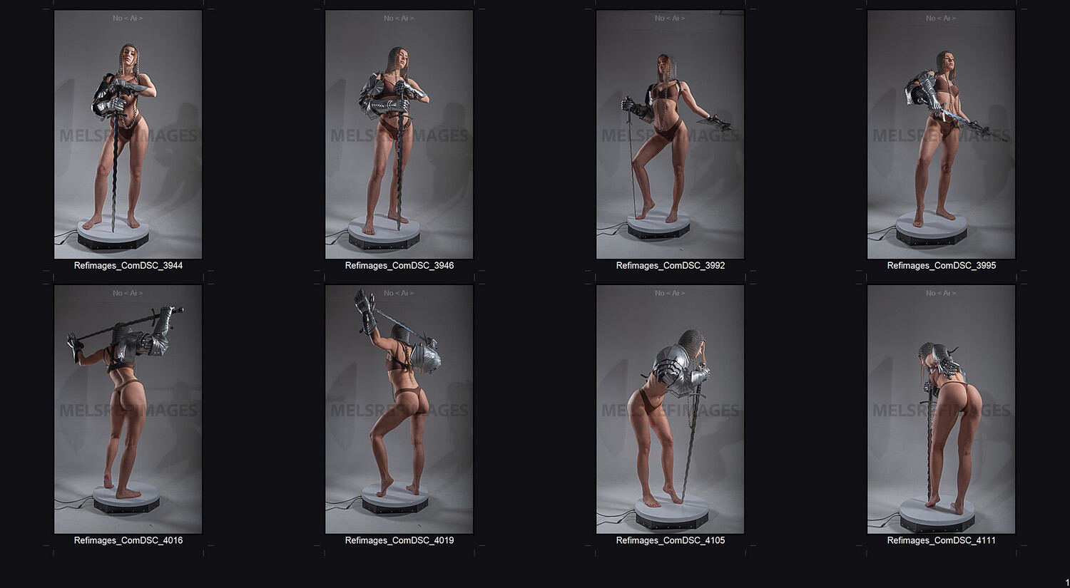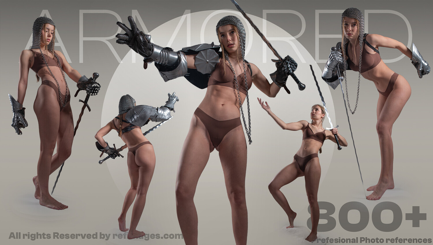 This epic reference pack features over 800 professional photos of a female model styled as a fantasy warrior—equipped with medieval-style armor, sword, chainmail, and expressive pose variety.