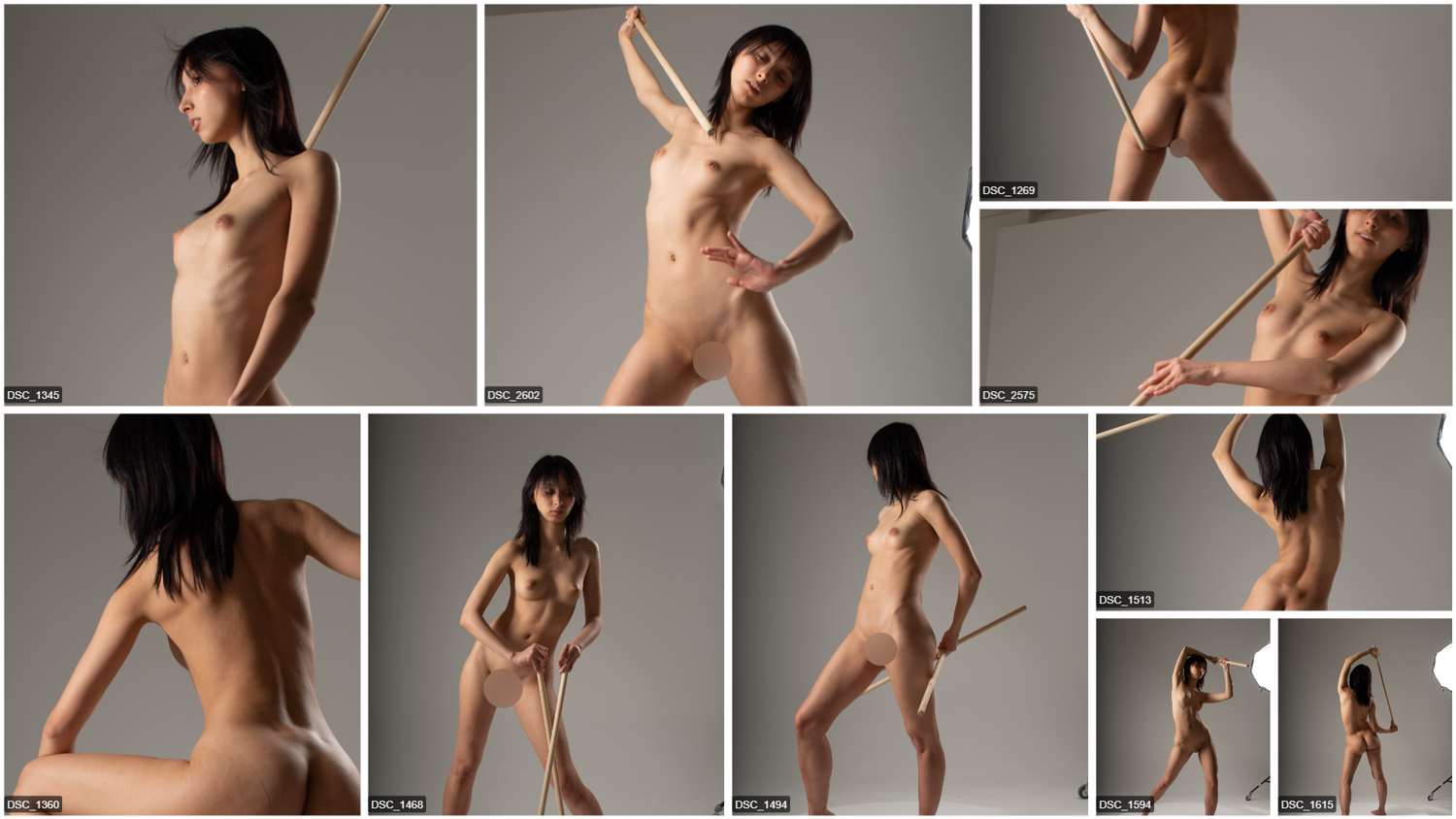 The model performs a wide range of A&T expressive poses, including sequences with a wooden stick prop, creating dramatic lines, twists, and tension in the body. These poses highlight balance, motion, weight shift, and natural body flow, making them ideal for gesture studies and character design.