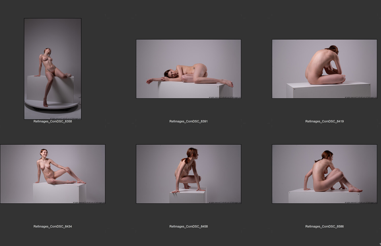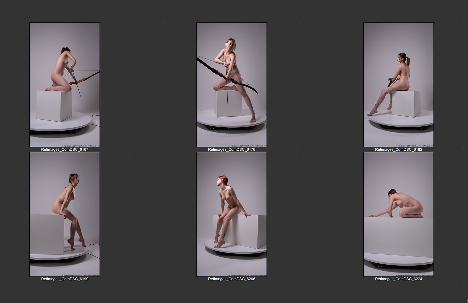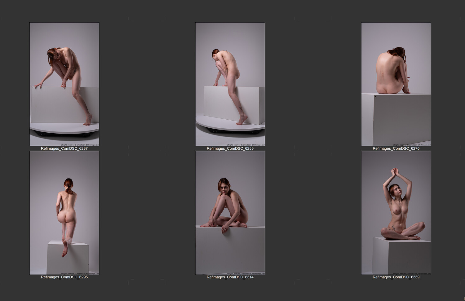 The collection features a red-haired model captured in a wide range of dynamic, balanced, and natural poses — from standing and seated compositions to grounded, low-center stances and expressive close-ups.
