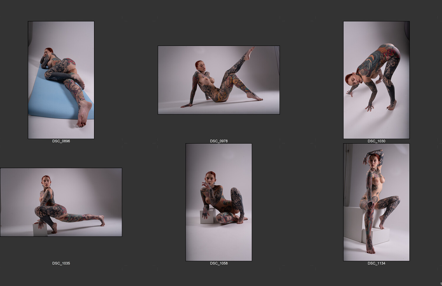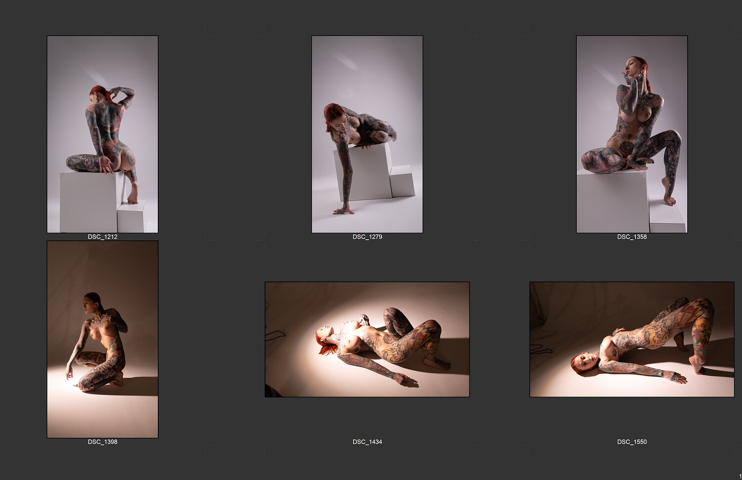 Shot across multiple lighting setups, including soft studio light and dramatic directional lighting, the pack highlights both anatomy and ink details with incredible clarity. Perfect for illustrators, concept artists, painters, 3D modelers, and anyone studying tattoos, form, gesture, and feminine anatomy.