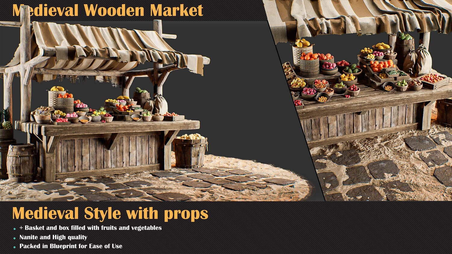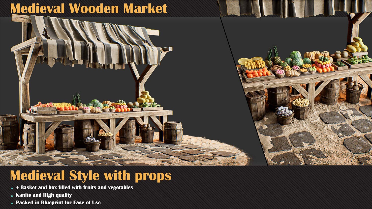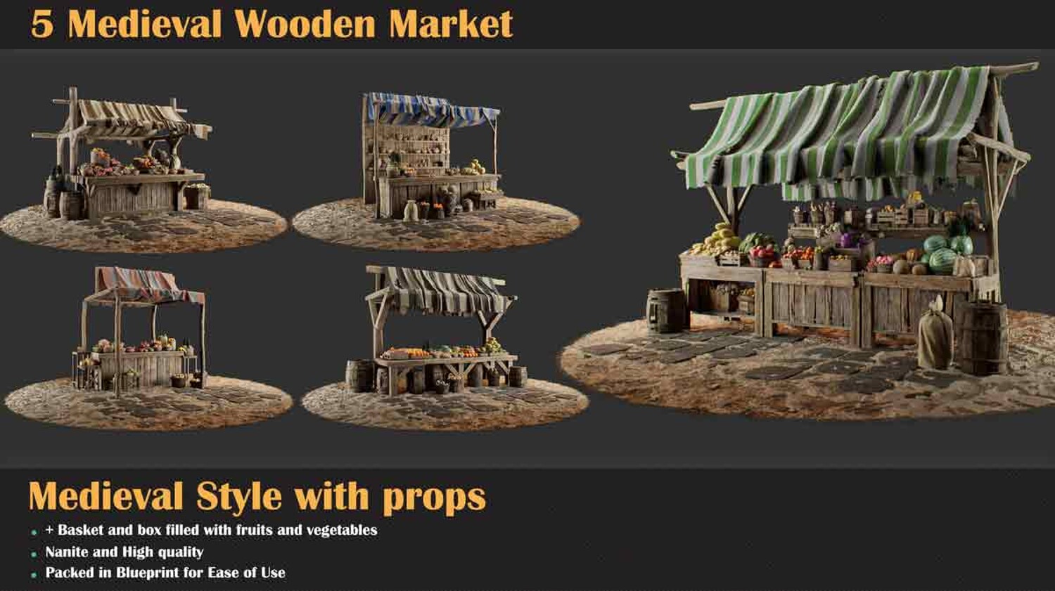 Build a rich and detailed market scene with this Wooden Market Pack – includes 5 complete stalls filled with baskets, fruits, crates, and other props.