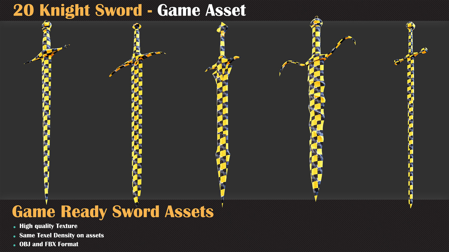 Elevate your projects with our stunning collection of 20 sword models, designed for maximum realism and detail. Each sword is meticulously crafted with polygon counts ranging from 6,000 to 24,000 triangles, ensuring both beauty and performance.