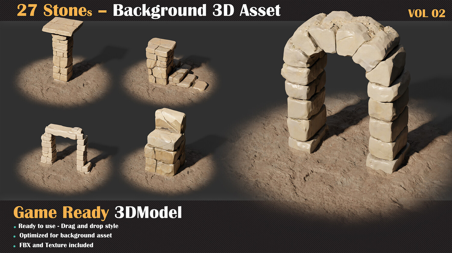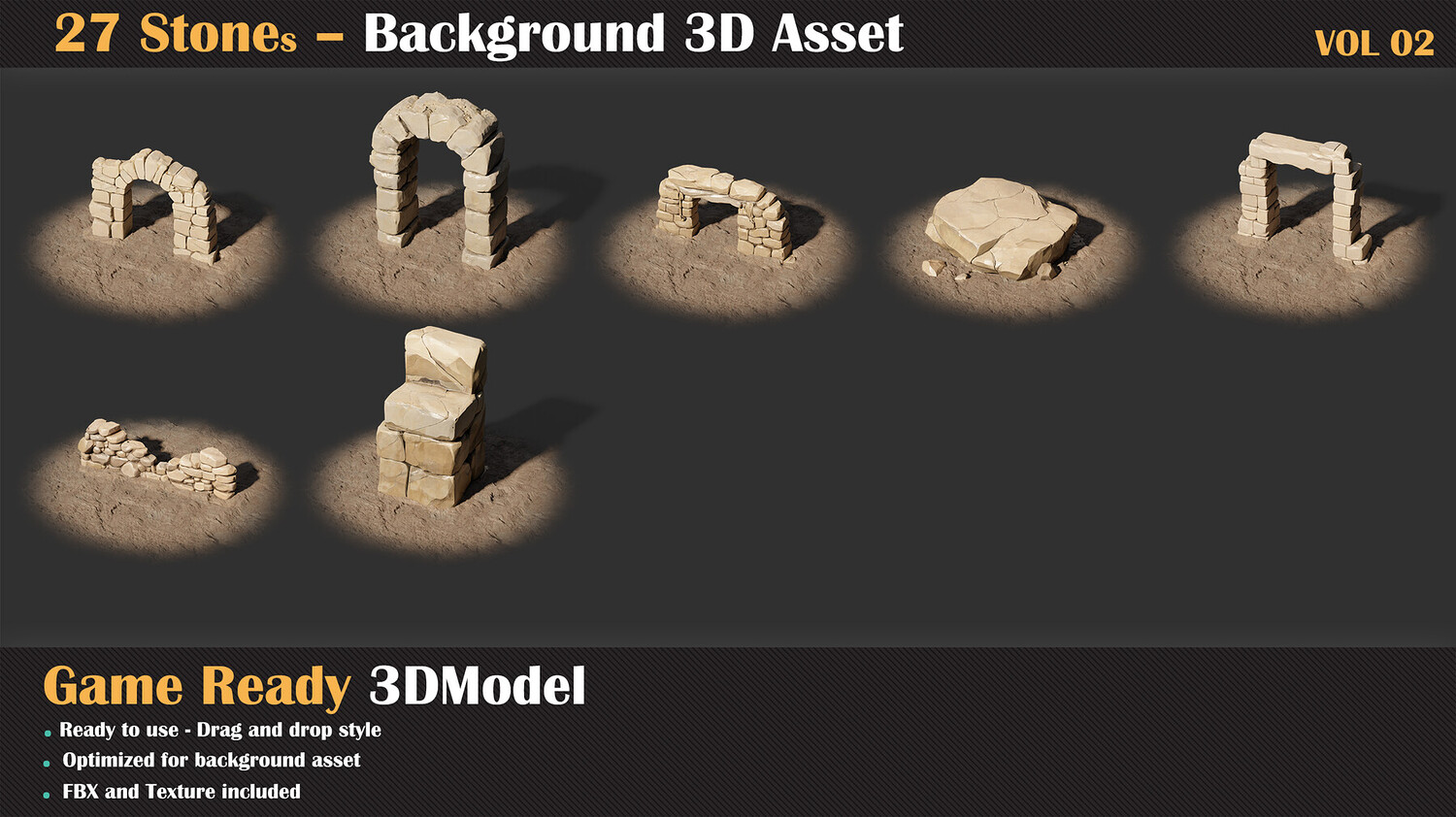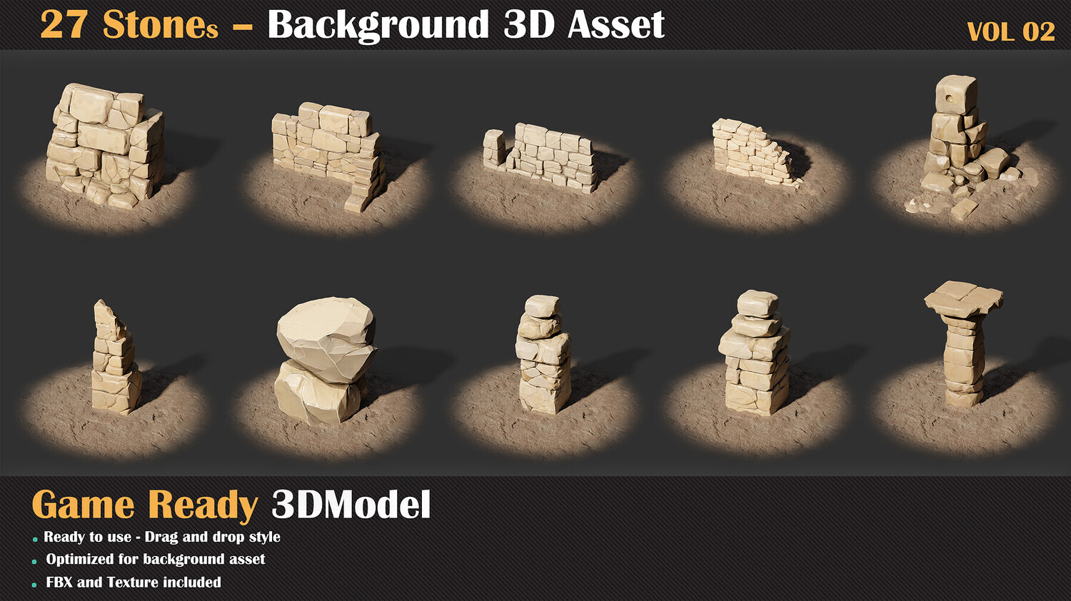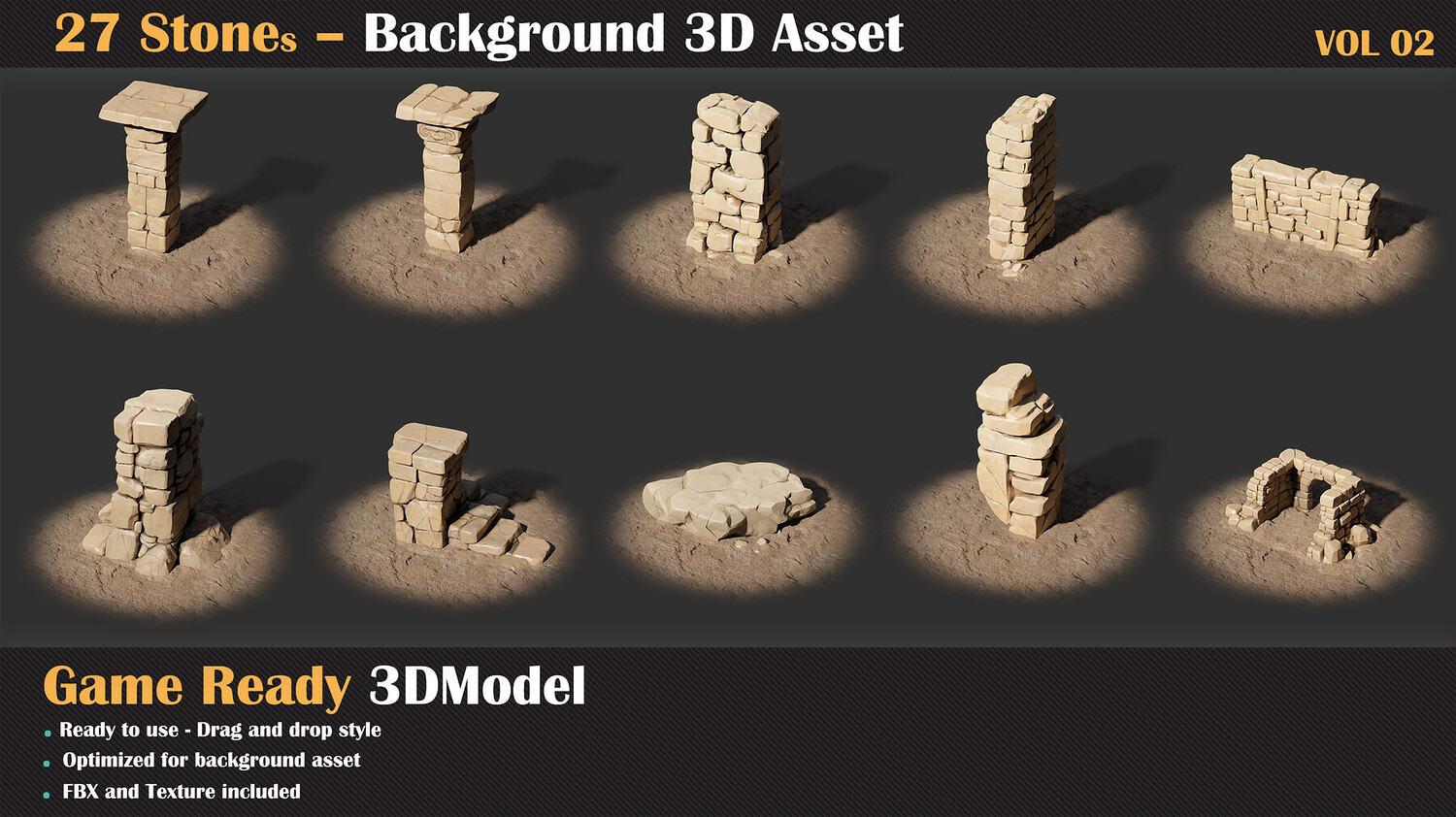 A set of 27 unique stone assets, perfect for enriching your game environments and giving them a sense of age, mystery, and natural history. The Stone Background Collection VOL 02 features handcrafted stone models designed to serve as environmental details, decorative elements, or world-building background pieces.