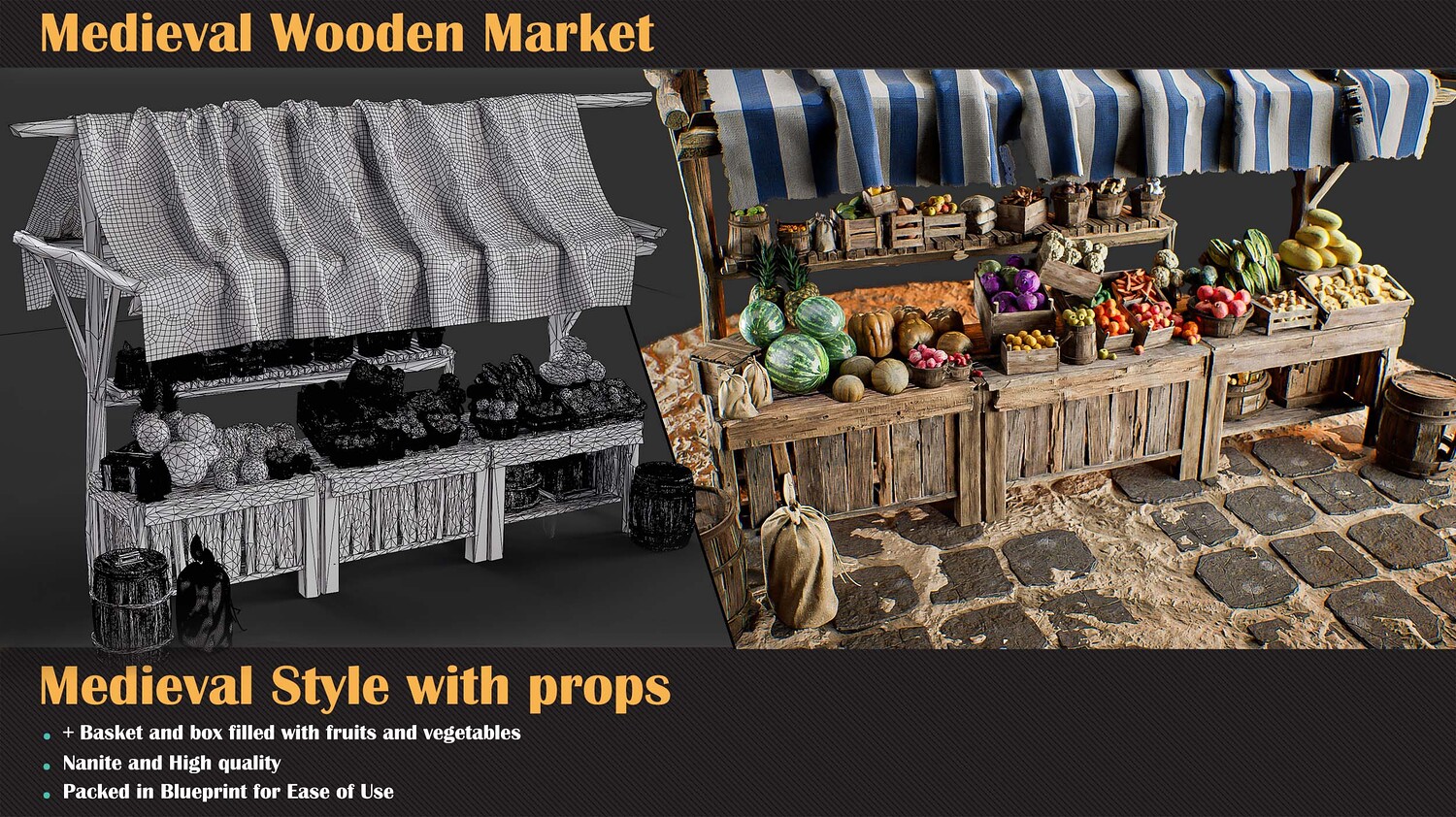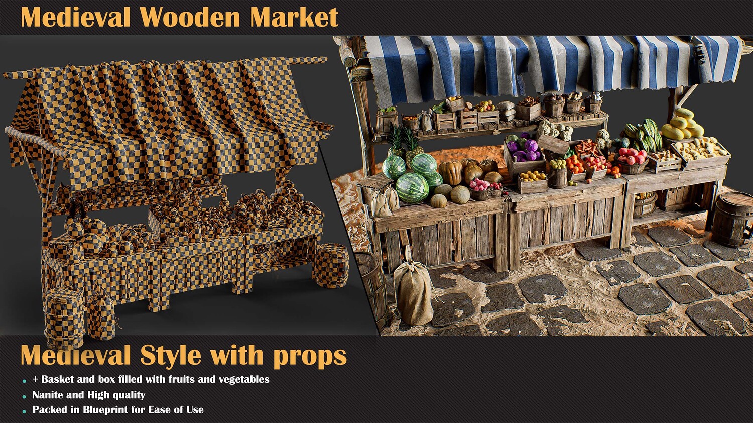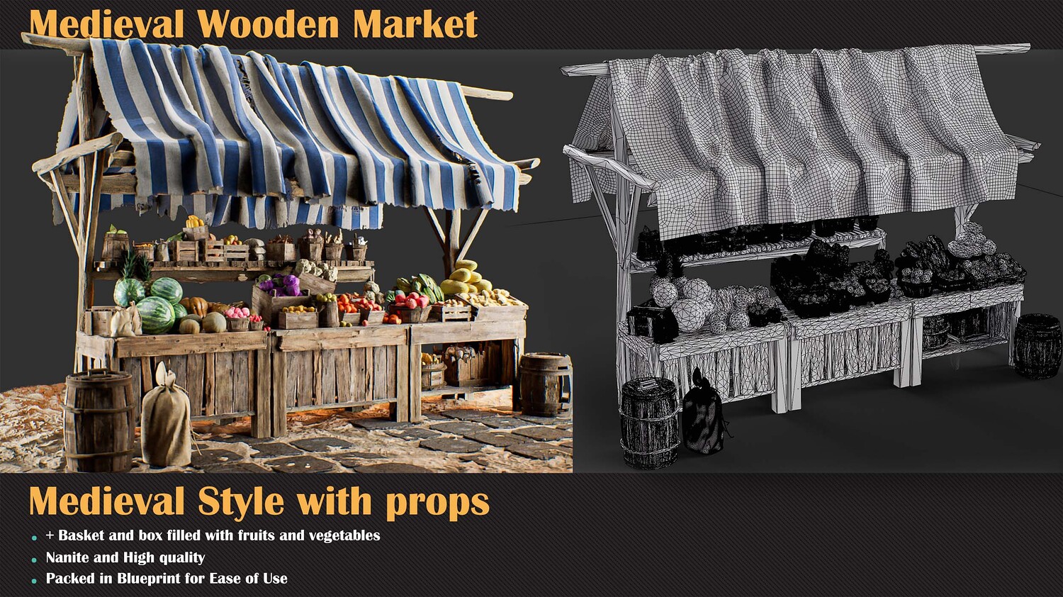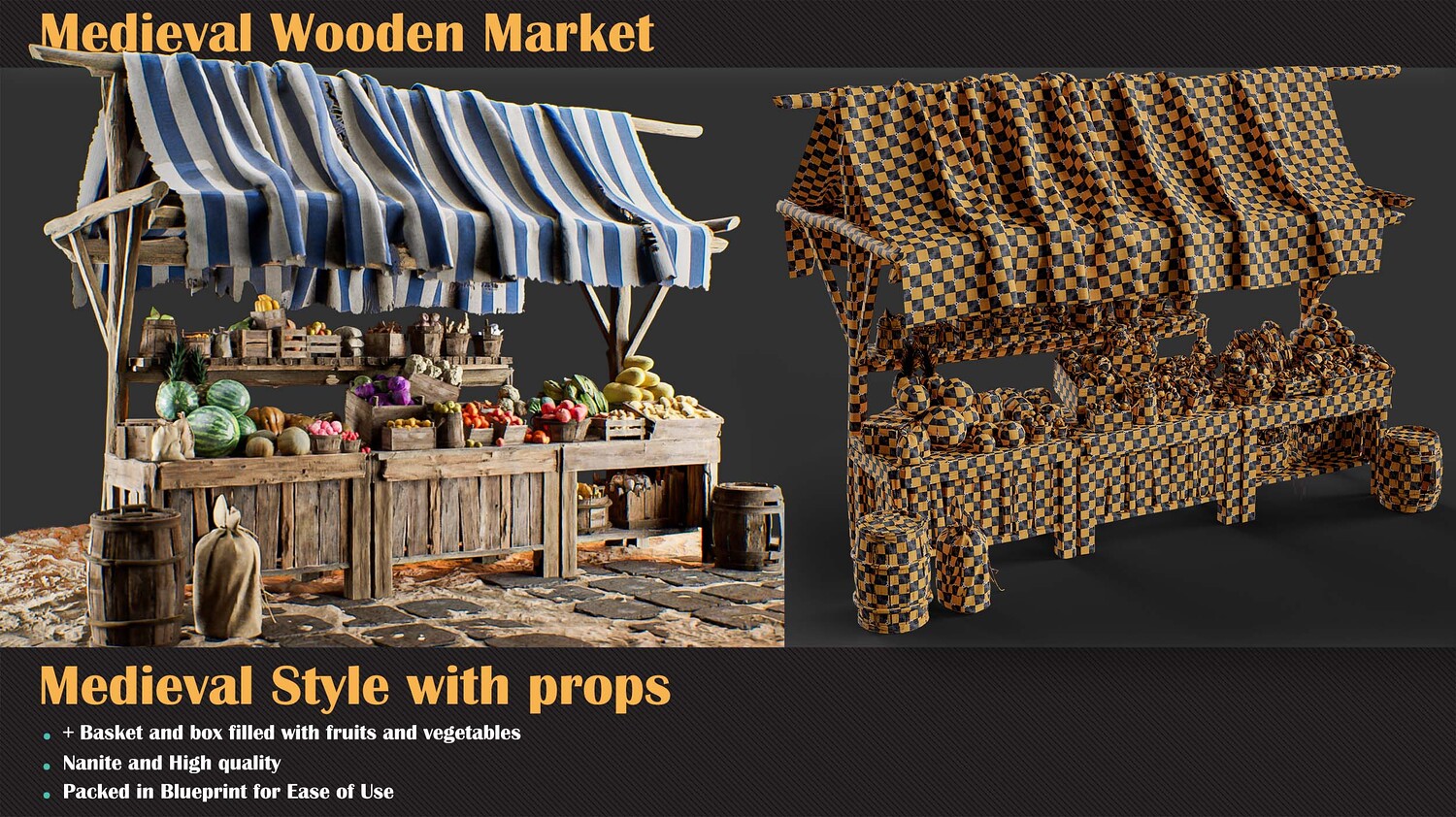 Build a rich and detailed market scene with this Wooden Market Pack – includes 5 complete stalls filled with baskets, fruits, crates, and other props.