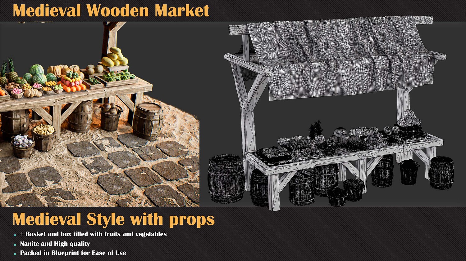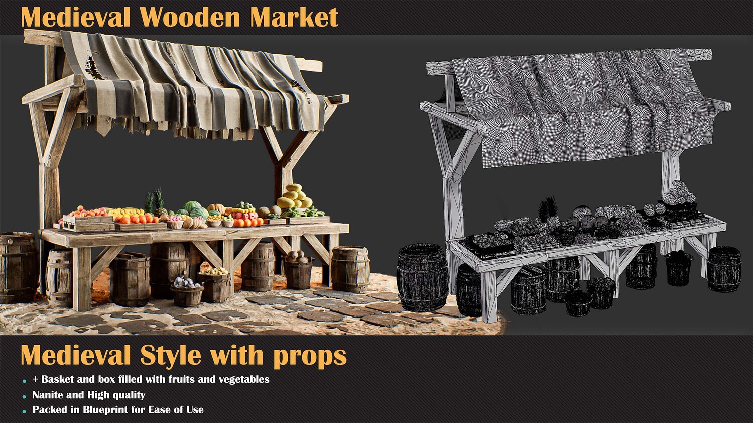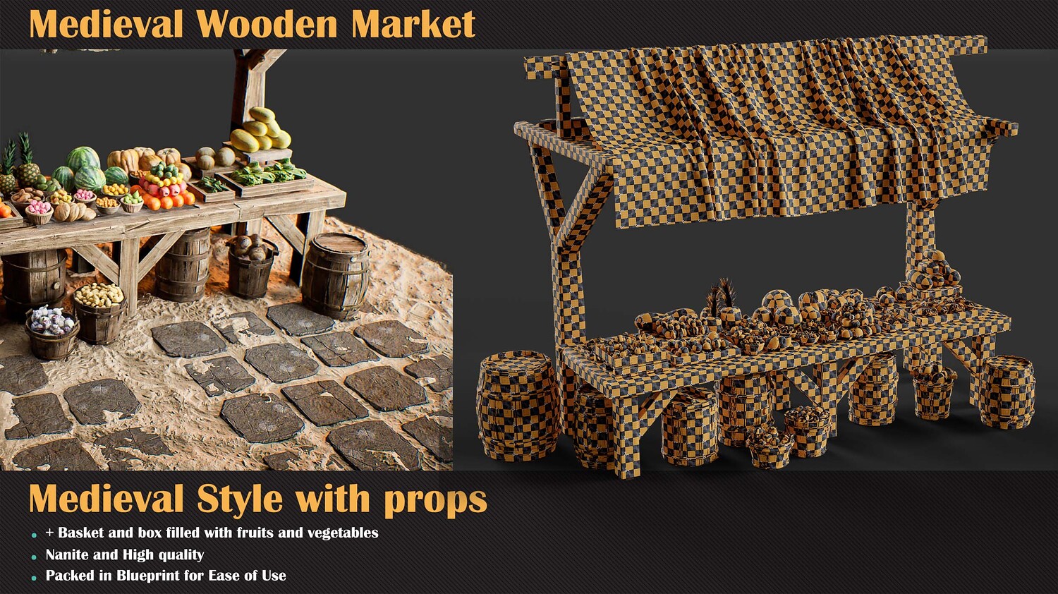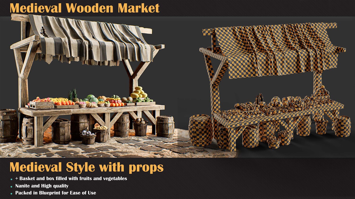 Build a rich and detailed market scene with this Wooden Market Pack – includes 5 complete stalls filled with baskets, fruits, crates, and other props.
