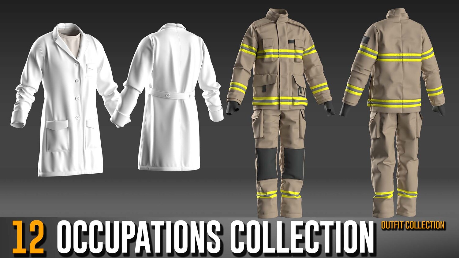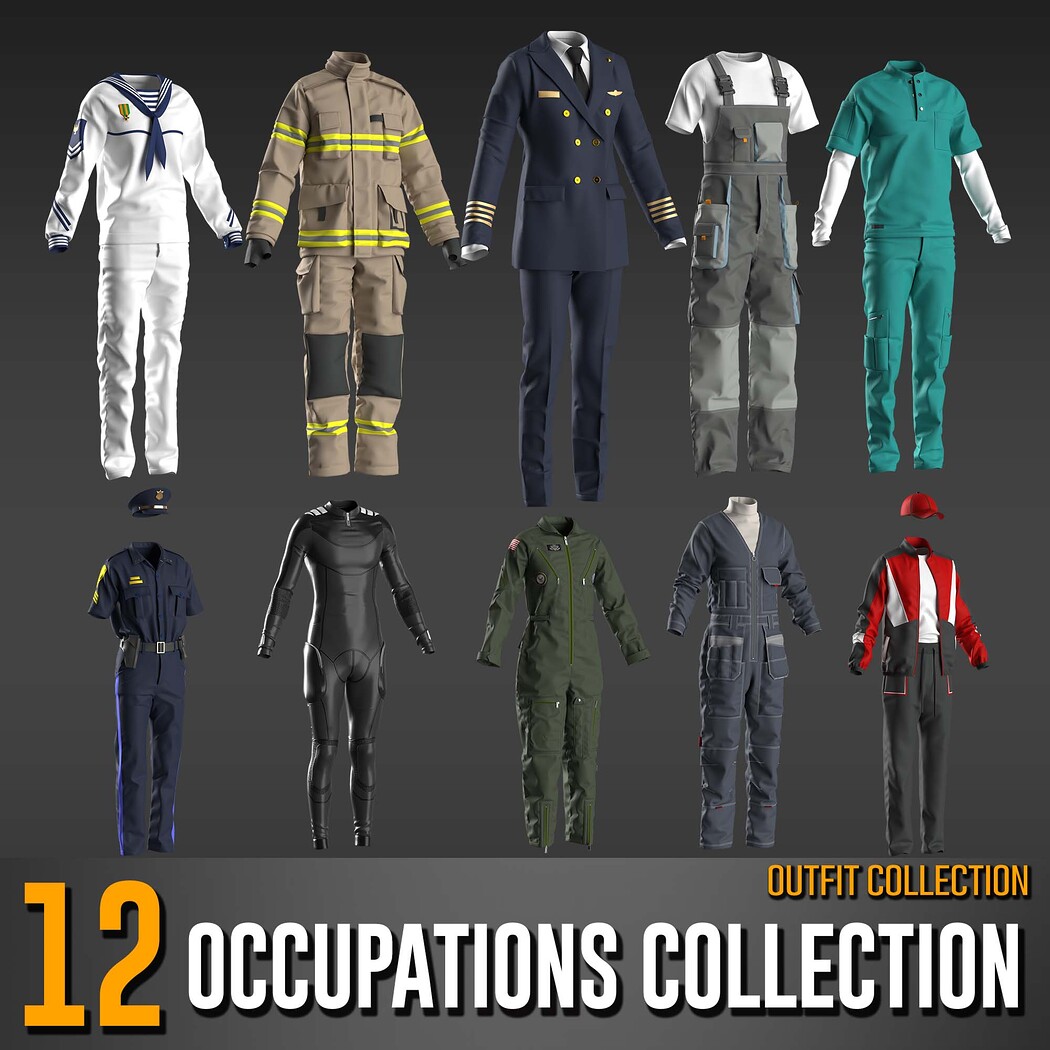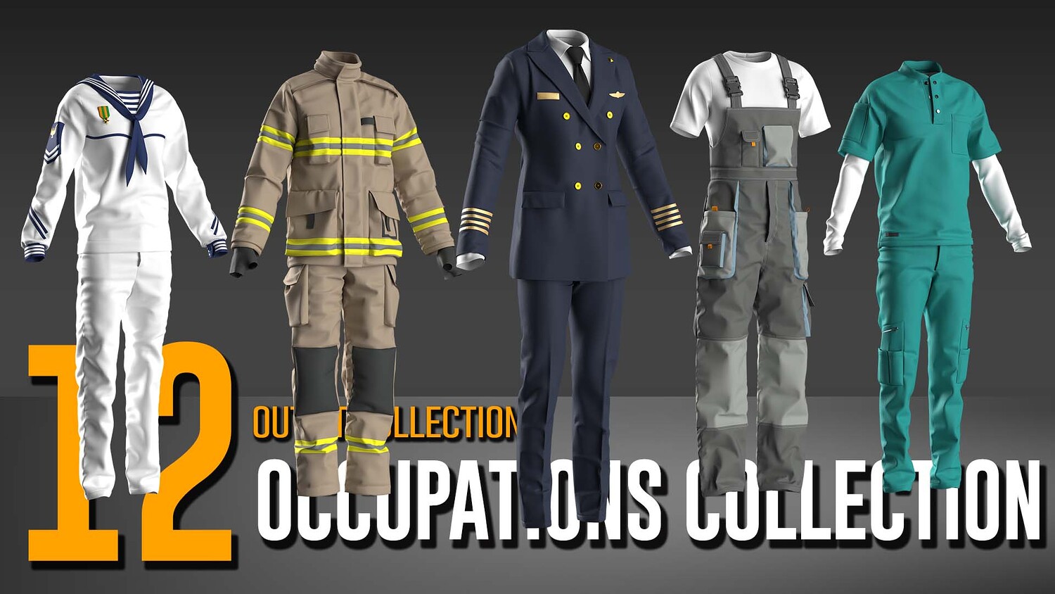 🎨Our product is tailored to enhance the style of Occupations Collection enthusiasts with a collection of 12 unique base meshes for Occupations Collection.🎨 Crafted to simplify the creation and prototyping process, our offering includes FBX files for easy use in prototyping or texturing to achieve your desired look. In addition, Marvelous Designer/CLO 3D projects are also included, giving you the flexibility to re-simulate or add extra details as needed. These assets are perfect for those involved in fashion design and offer neatly organized garment arrangements alongside 12 previews for each Occupations Collection Style.