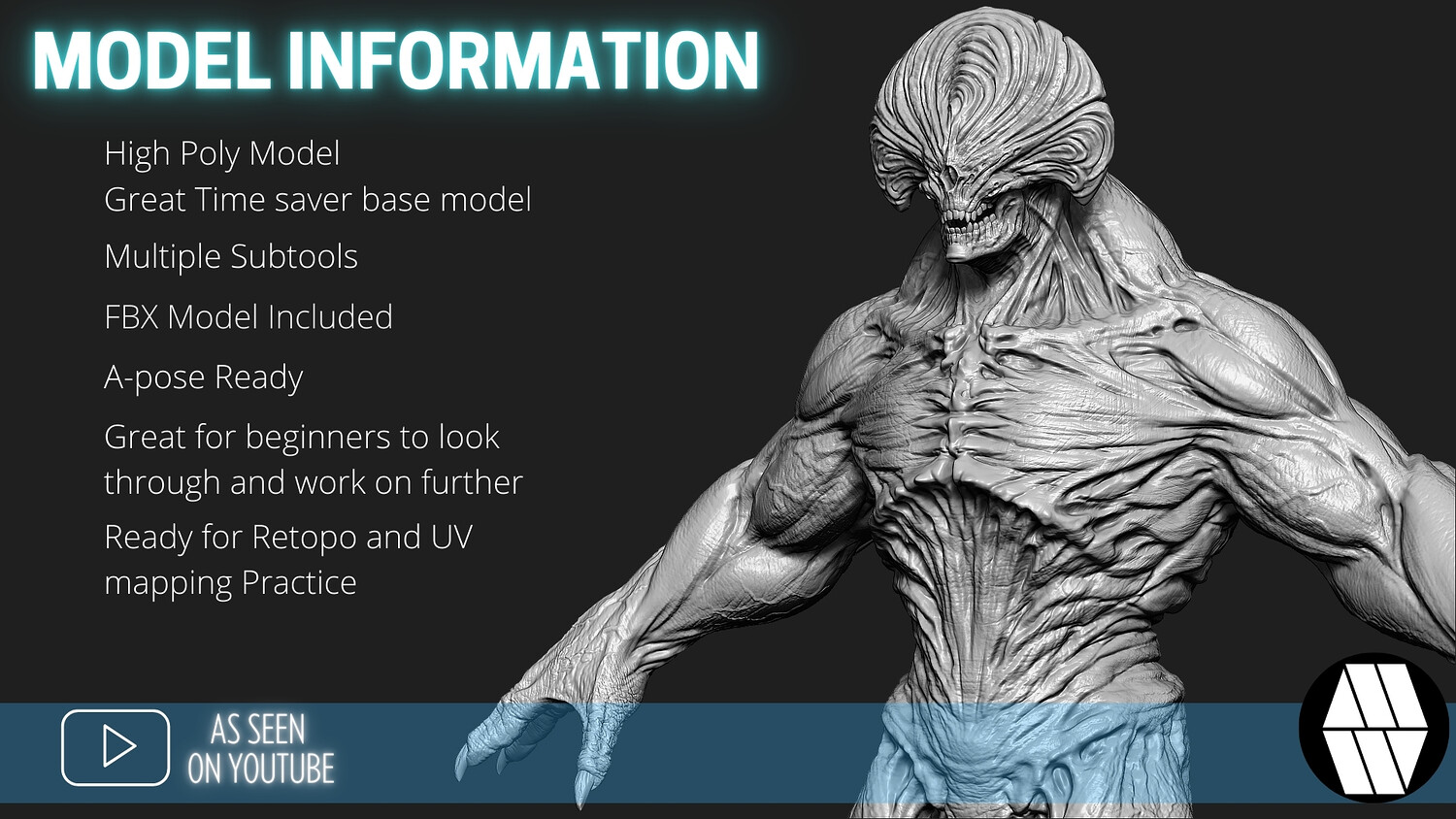 An excellent model to use for Practicing and referring back to. Take this base model further with detailing inside of ZBrush or use the FBX model in Blender or other 3D softwares.