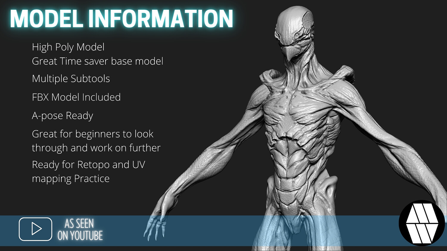 An excellent model to use for Practicing and referring back to. Take this base model further with detailing inside of ZBrush or use the FBX model in Blender or other 3D softwares.