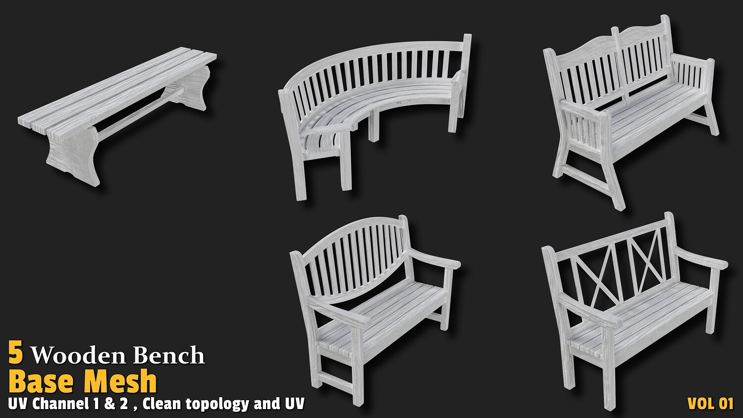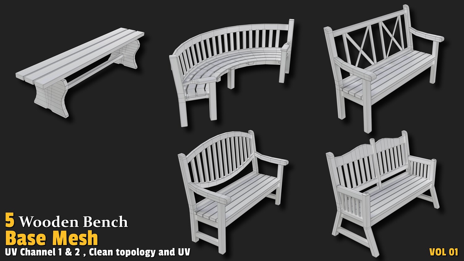 Add a natural and inviting touch to your 3D environments with this delightful collection of 5 wooden bench base mesh models! Designed for artists and developers, this "Wooden Bench" set features designs with polygon counts ranging from 1,000 to 2,000, offering an excellent balance of detail and performance. Each model showcases a clean, quad-based topology and is UV-unwrapped with 2 texture channels (Channel 1 and 2), providing a solid foundation for texturing, material application, and customization. Perfect for parks, gardens, historical scenes, or game environments, these assets are highly versatile. Whether you're creating a serene landscape, designing a nature-themed game, or crafting a detailed visualization, this collection delivers high-quality base meshes ready for seamless integration into your projects.