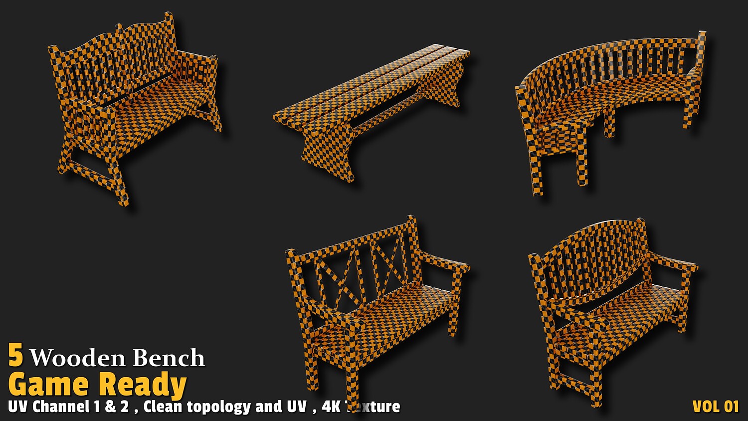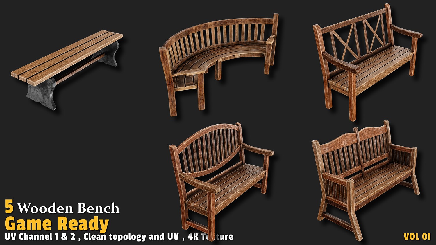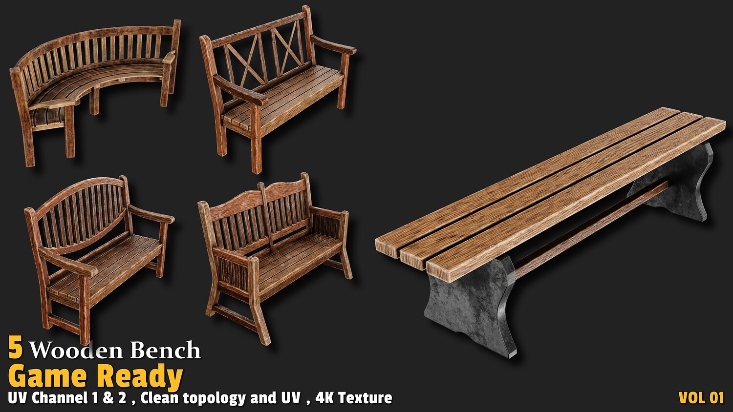 Polygon count: 1,000 to 2,000 per model Clean quad-based topology UV-unwrapped with 2 texture channels 4K textures (Base Color, Normal, ORM) Includes 5 unique wooden bench designs Usage: