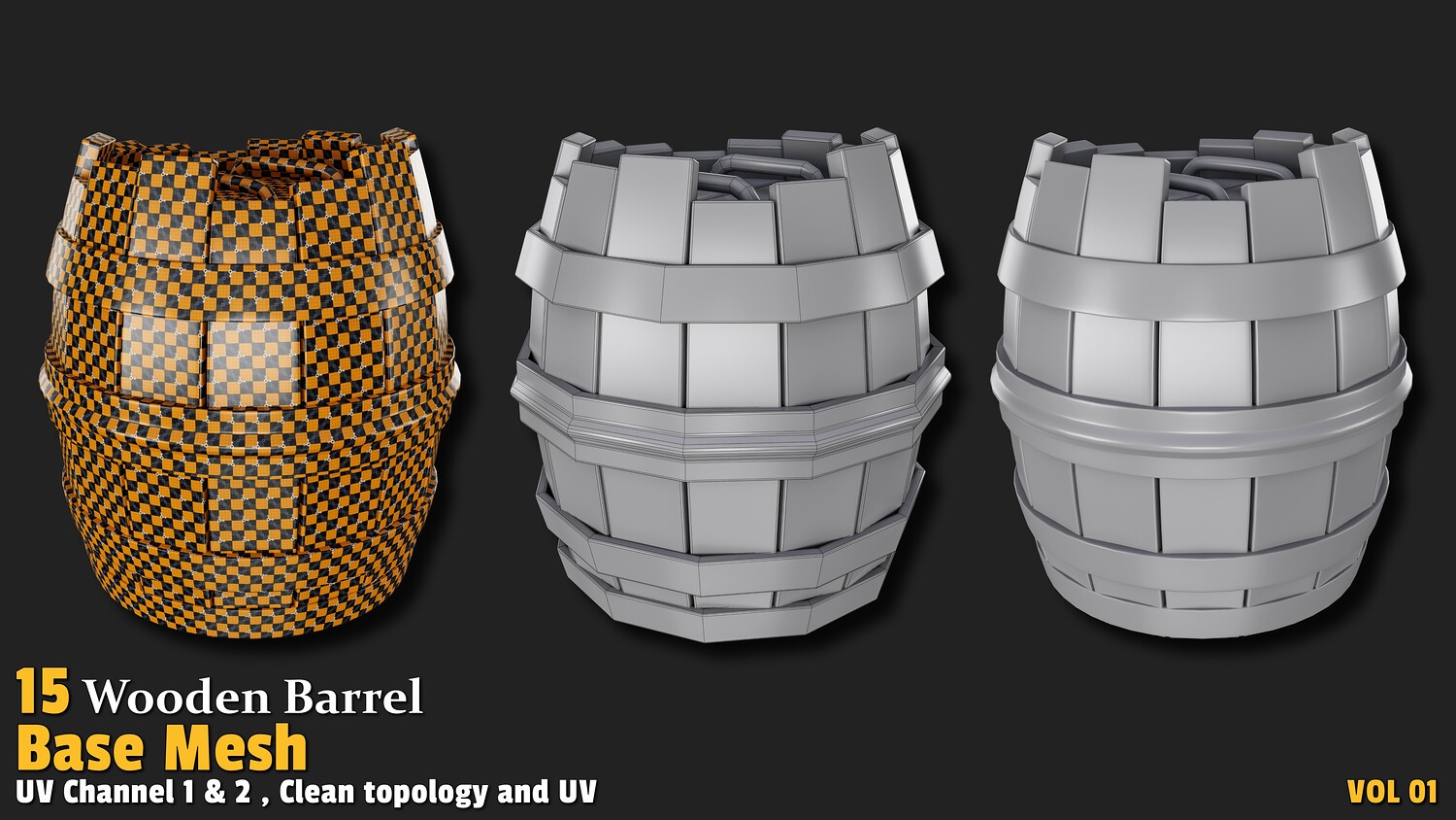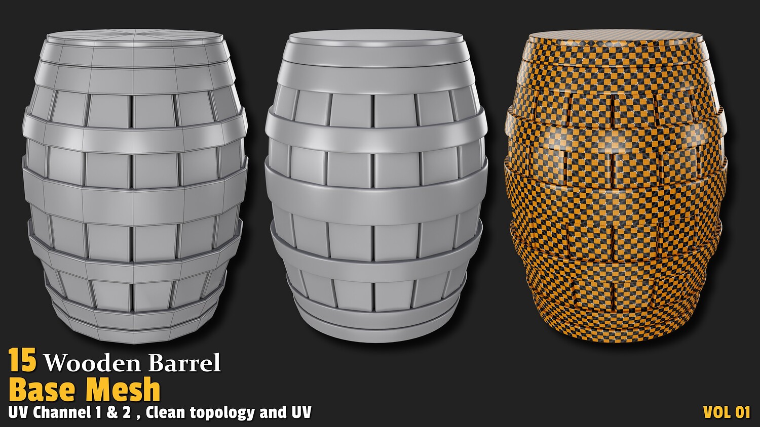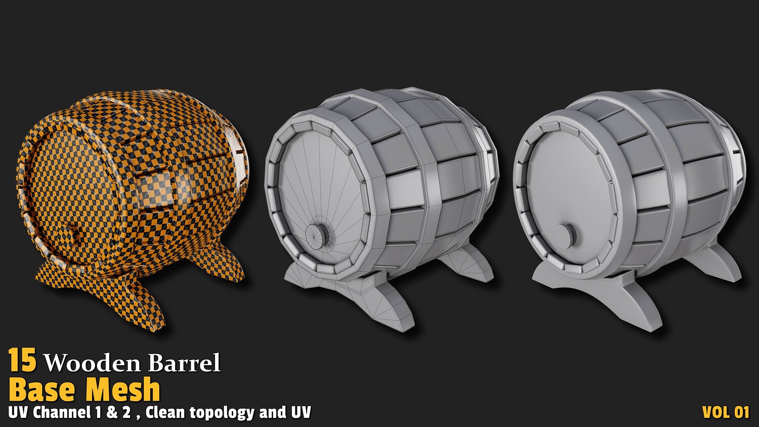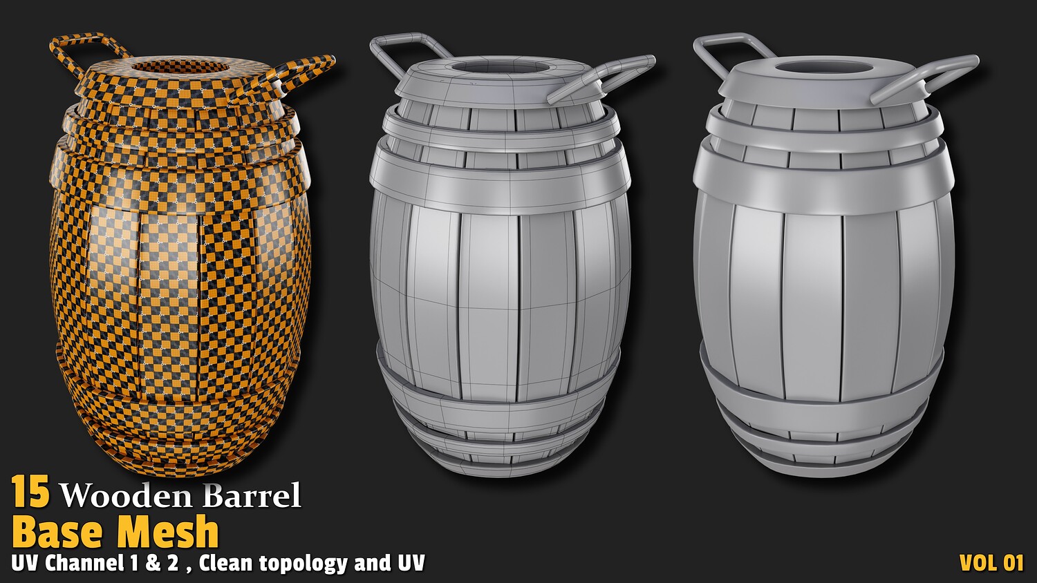 Add a classic and natural touch to your 3D projects with this captivating collection of 15 wooden barrel base mesh models! Designed for artists and developers, this "Wooden Barrel" set features designs with polygon counts ranging from 1,000 to 3,000, offering an excellent balance of detail and performance. Each model showcases a clean, quad-based topology and is UV-unwrapped with 2 texture channels (Channel 1 and 2), providing a solid foundation for texturing, material application, and customization. Perfect for historical scenes, game environments, warehouses, or detailed renderings, these assets are highly versatile. Whether you're building an old tavern, designing a nautical-themed game, or creating professional visualizations, this collection delivers high-quality base meshes ready for seamless integration into your projects.