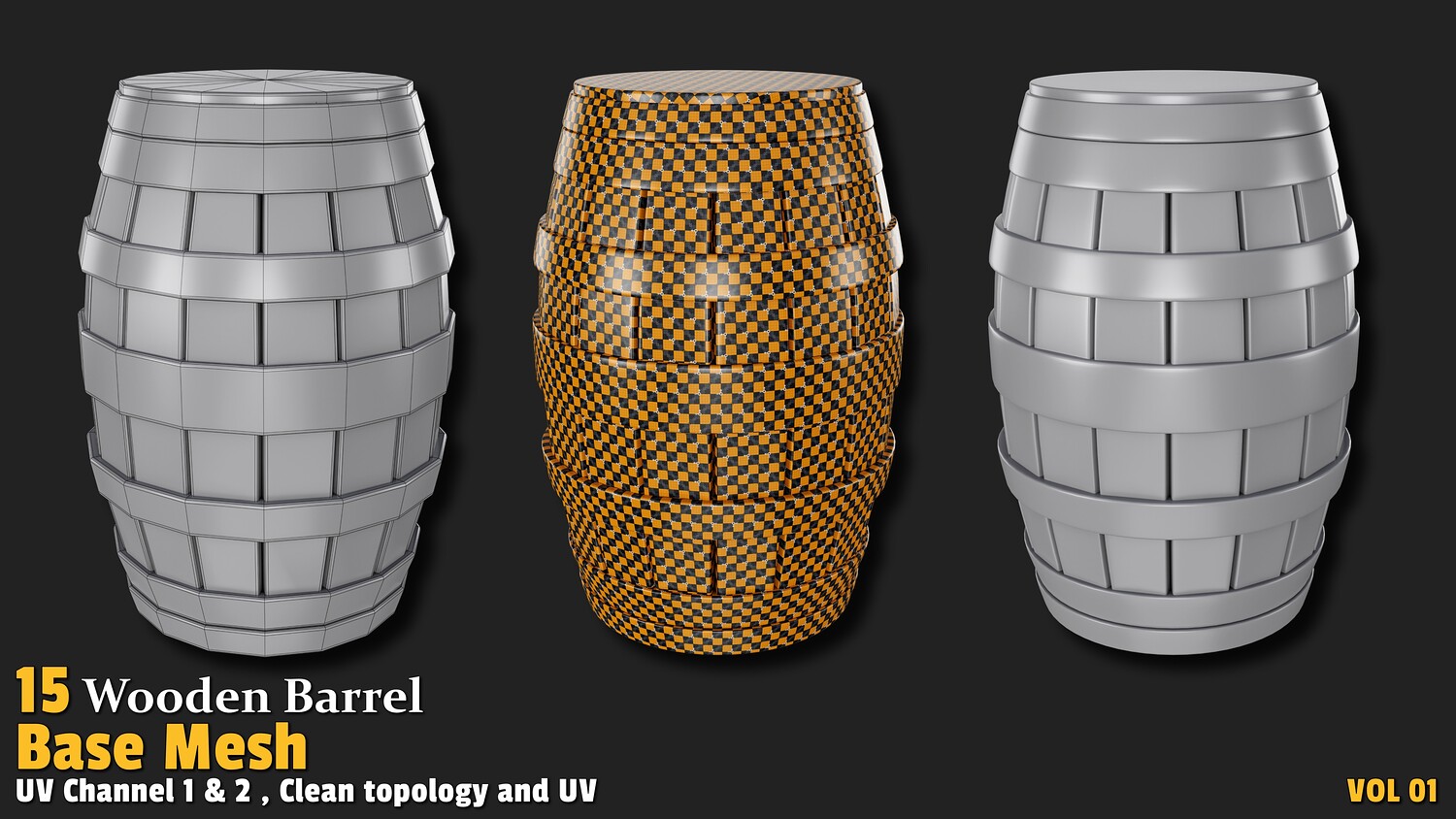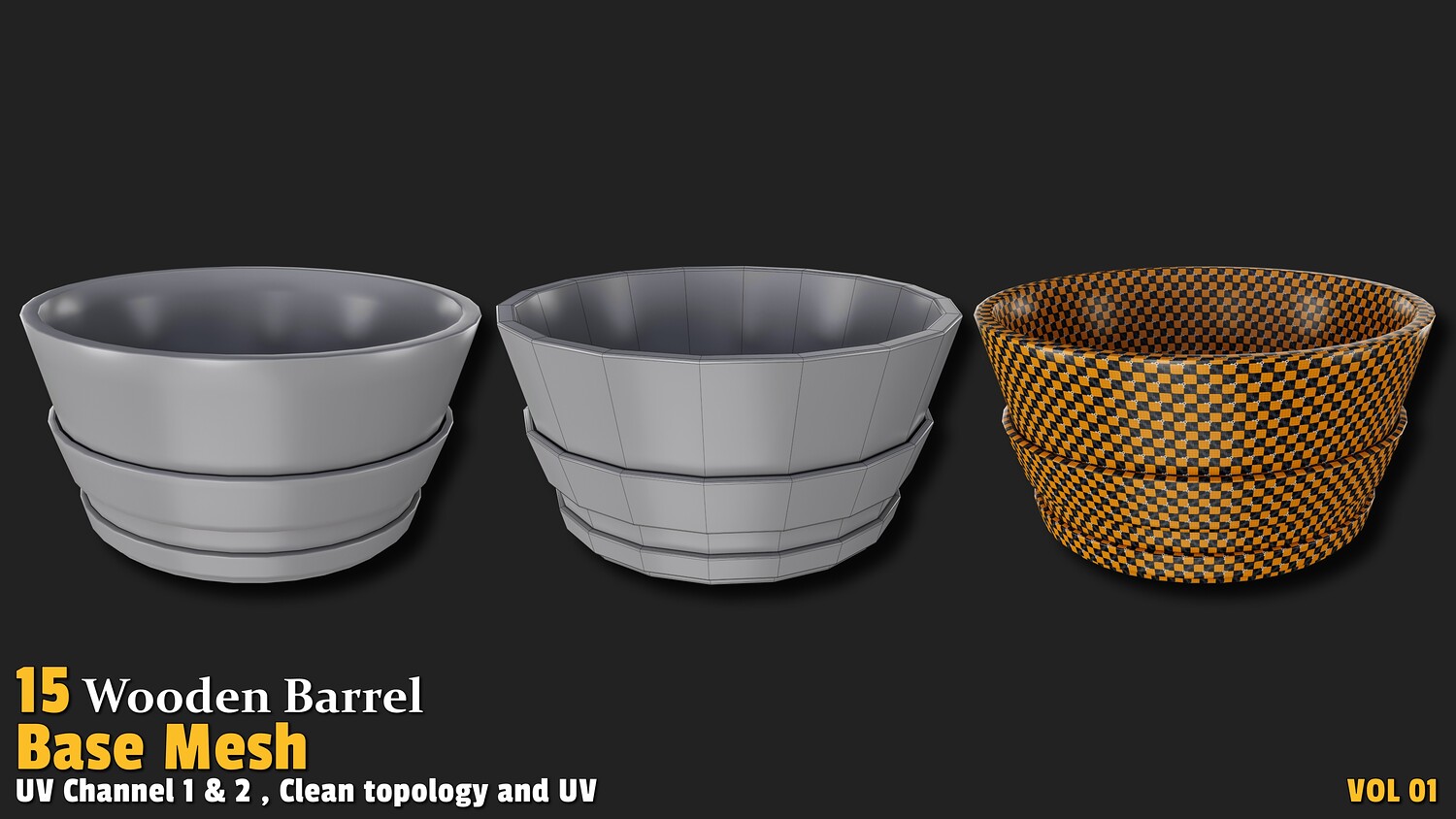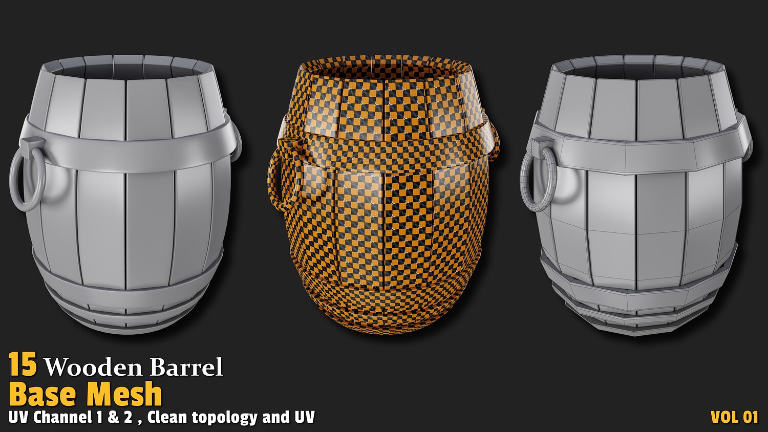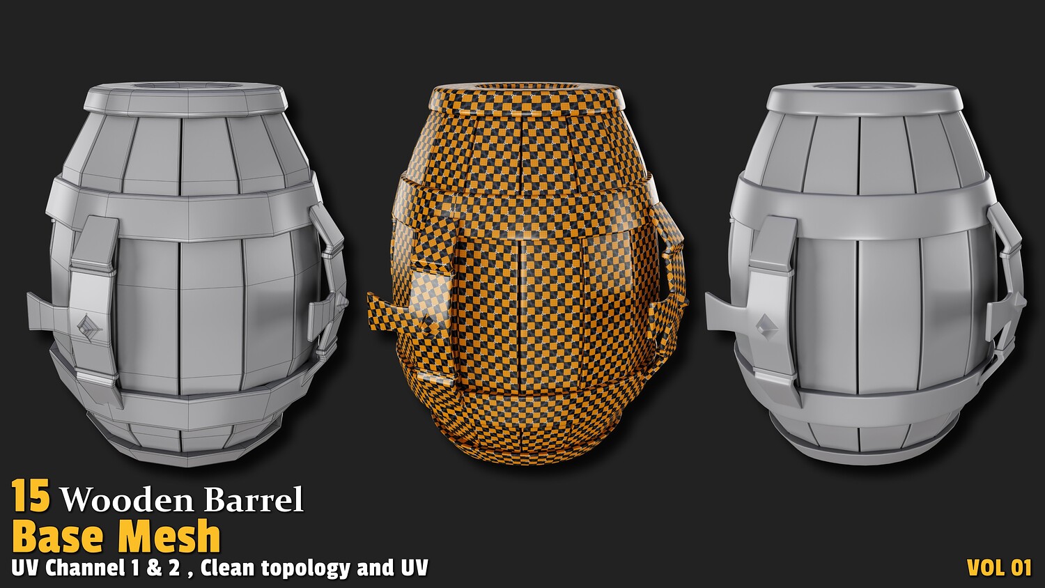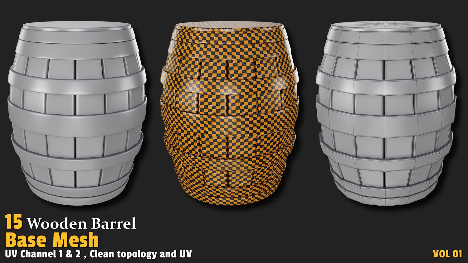 Add a classic and natural touch to your 3D projects with this captivating collection of 15 wooden barrel base mesh models! Designed for artists and developers, this "Wooden Barrel" set features designs with polygon counts ranging from 1,000 to 3,000, offering an excellent balance of detail and performance. Each model showcases a clean, quad-based topology and is UV-unwrapped with 2 texture channels (Channel 1 and 2), providing a solid foundation for texturing, material application, and customization. Perfect for historical scenes, game environments, warehouses, or detailed renderings, these assets are highly versatile. Whether you're building an old tavern, designing a nautical-themed game, or creating professional visualizations, this collection delivers high-quality base meshes ready for seamless integration into your projects.