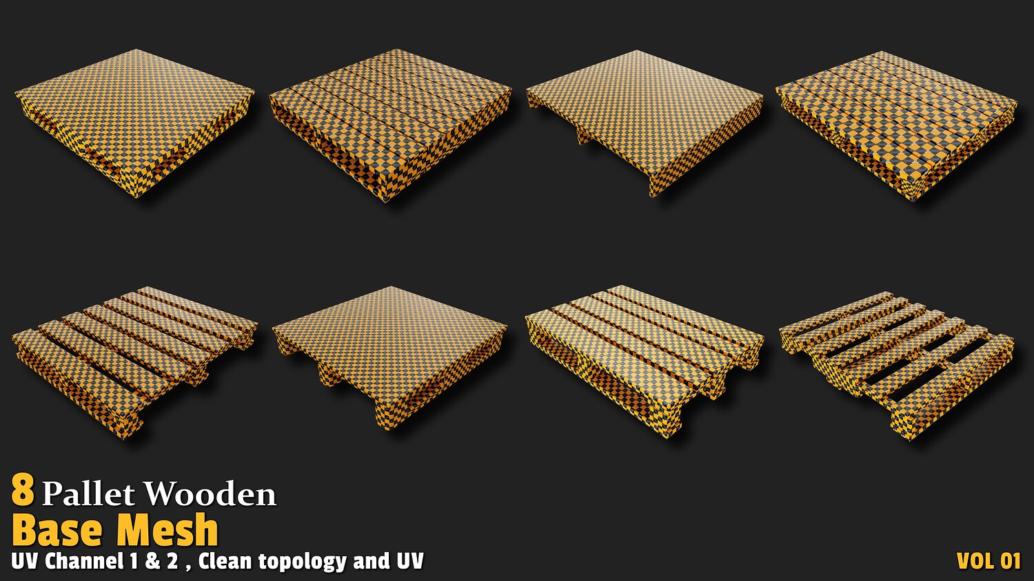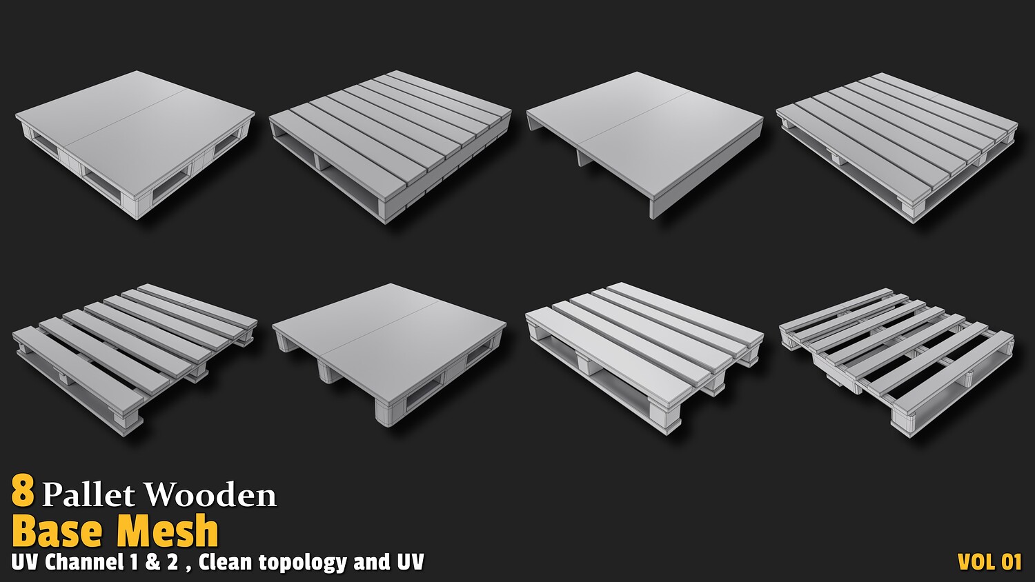Polygon count: 200 to 2,000 per model Clean quad-based topology UV-unwrapped with 2 texture channels Ready for texturing, material application, and customization Includes 8 unique wooden pallet designs ⚡️Usage: These models offer a wide range of applications across various projects: