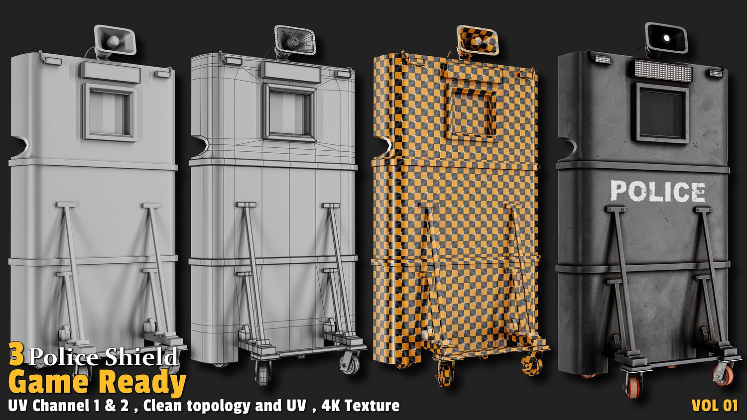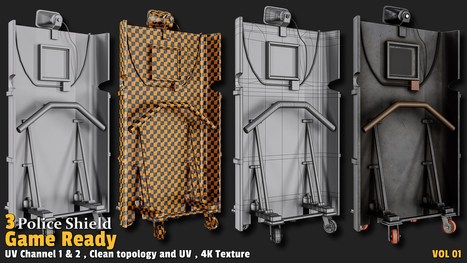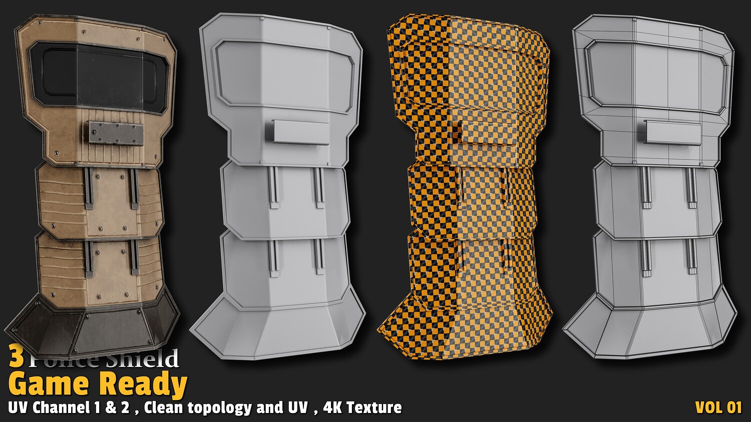 Polygon count: 5,000 to 23,000 per model Clean quad-based topology UV-unwrapped with 2 texture channels 4K textures (Base Color, Normal, ORM) Includes 3 unique police shield designs Usage: Perfect for game development, real-time rendering, or game environment design. Easily import and use.