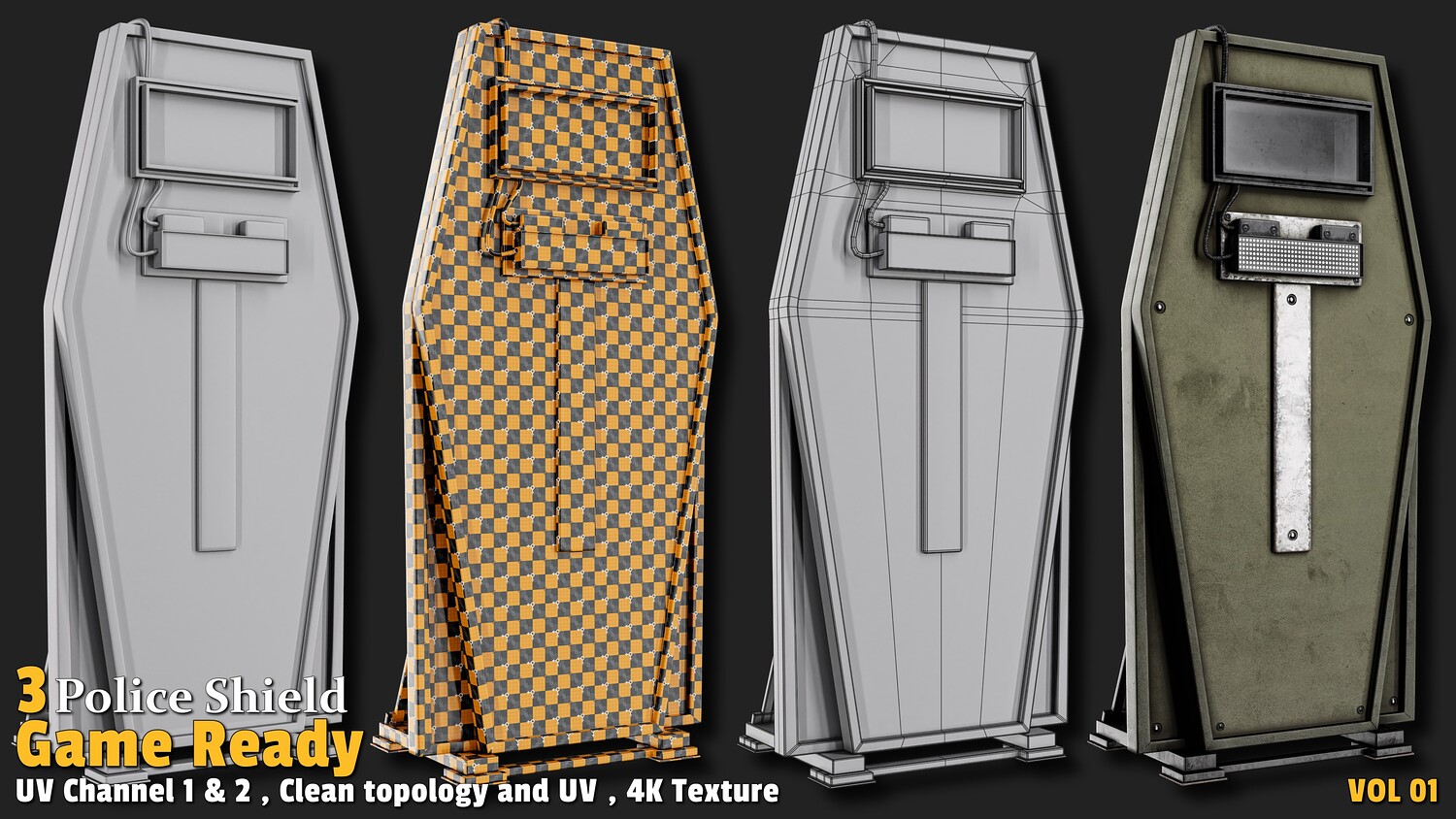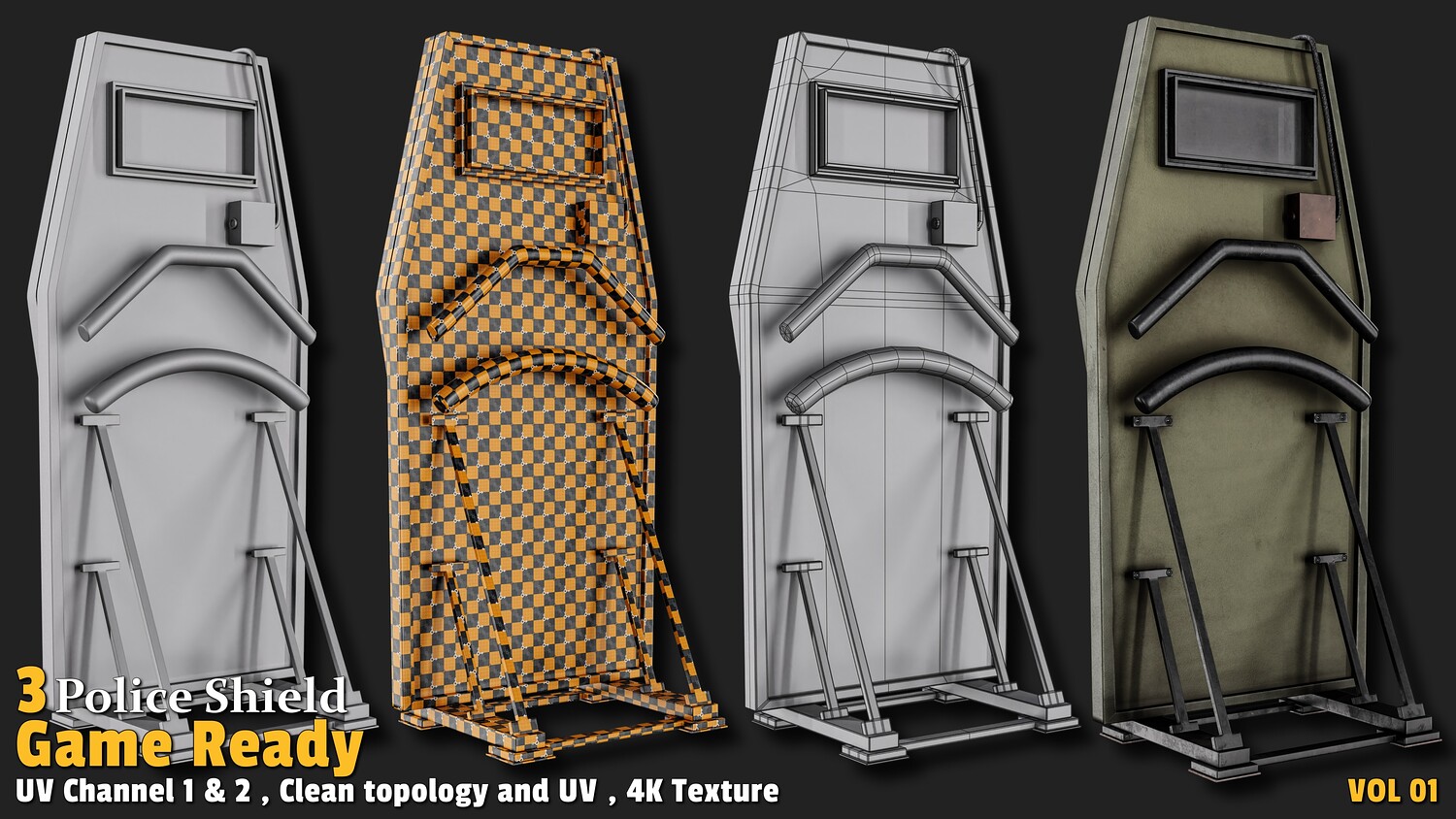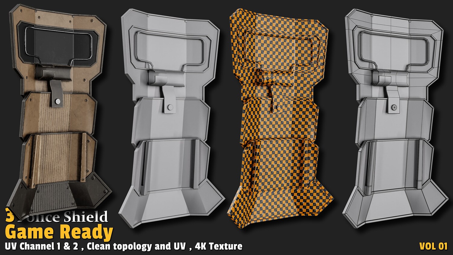 Polygon count: 5,000 to 23,000 per model Clean quad-based topology UV-unwrapped with 2 texture channels 4K textures (Base Color, Normal, ORM) Includes 3 unique police shield designs Usage: Perfect for game development, real-time rendering, or game environment design. Easily import and use.