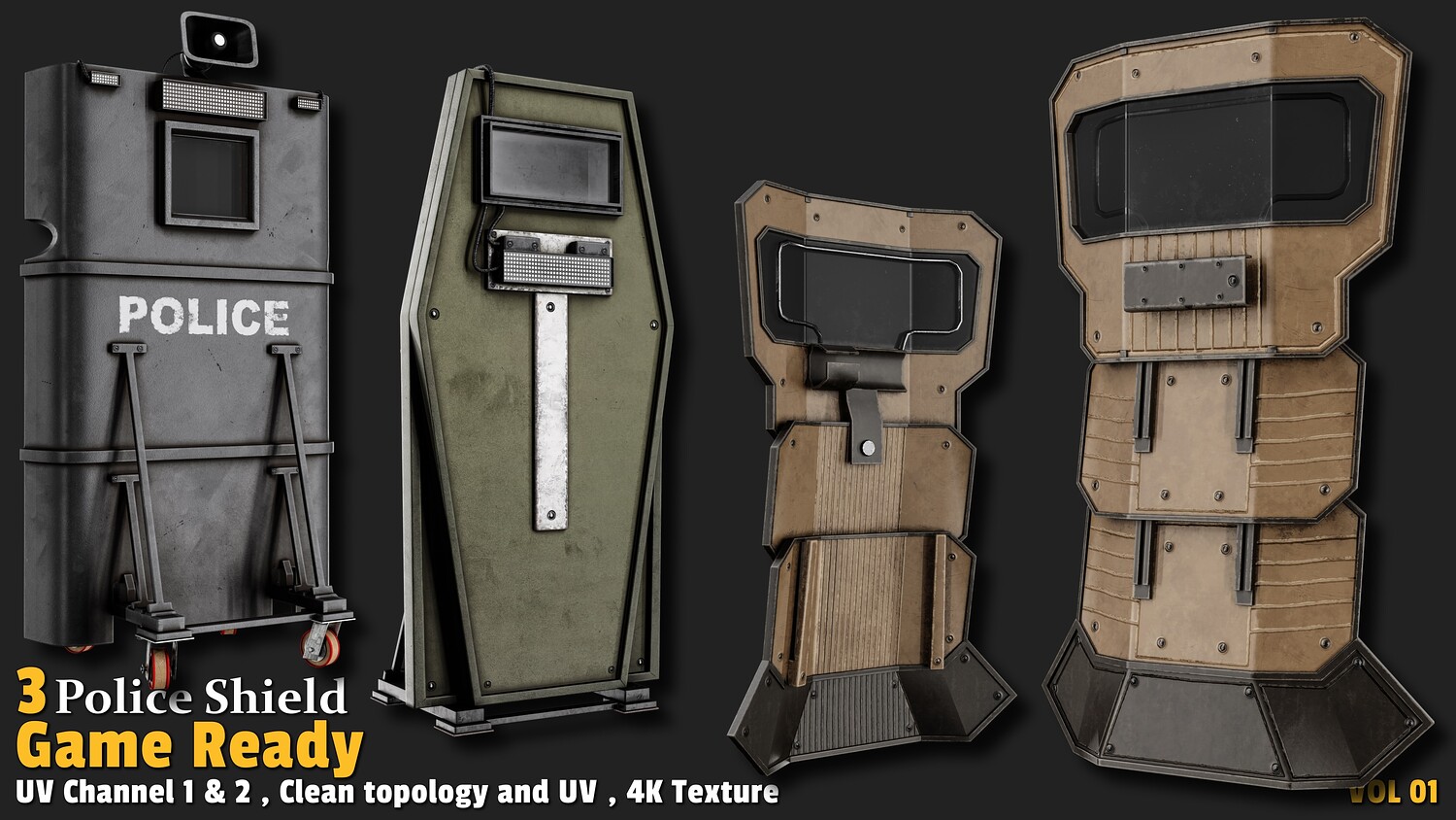 Ready to elevate the security and excitement of your game world with ready-to-use police shields? This collection of 3 textured 3D police shield models, crafted with professional materials and 4K textures (including Base Color, Normal, and ORM), is designed to shine instantly in your game development projects! Whether you're building a tense police operation or designing an action-packed street combat game, these models deliver unmatched quality and realistic detail for an immersive gaming experience. Each model features a clean, quad-based topology with polygon counts ranging from 5,000 to 23,000, offering a perfect balance between performance and detail. UV-unwrapped with 2 texture channels, this set is fully optimized for seamless integration into your game environment without any additional adjustments.