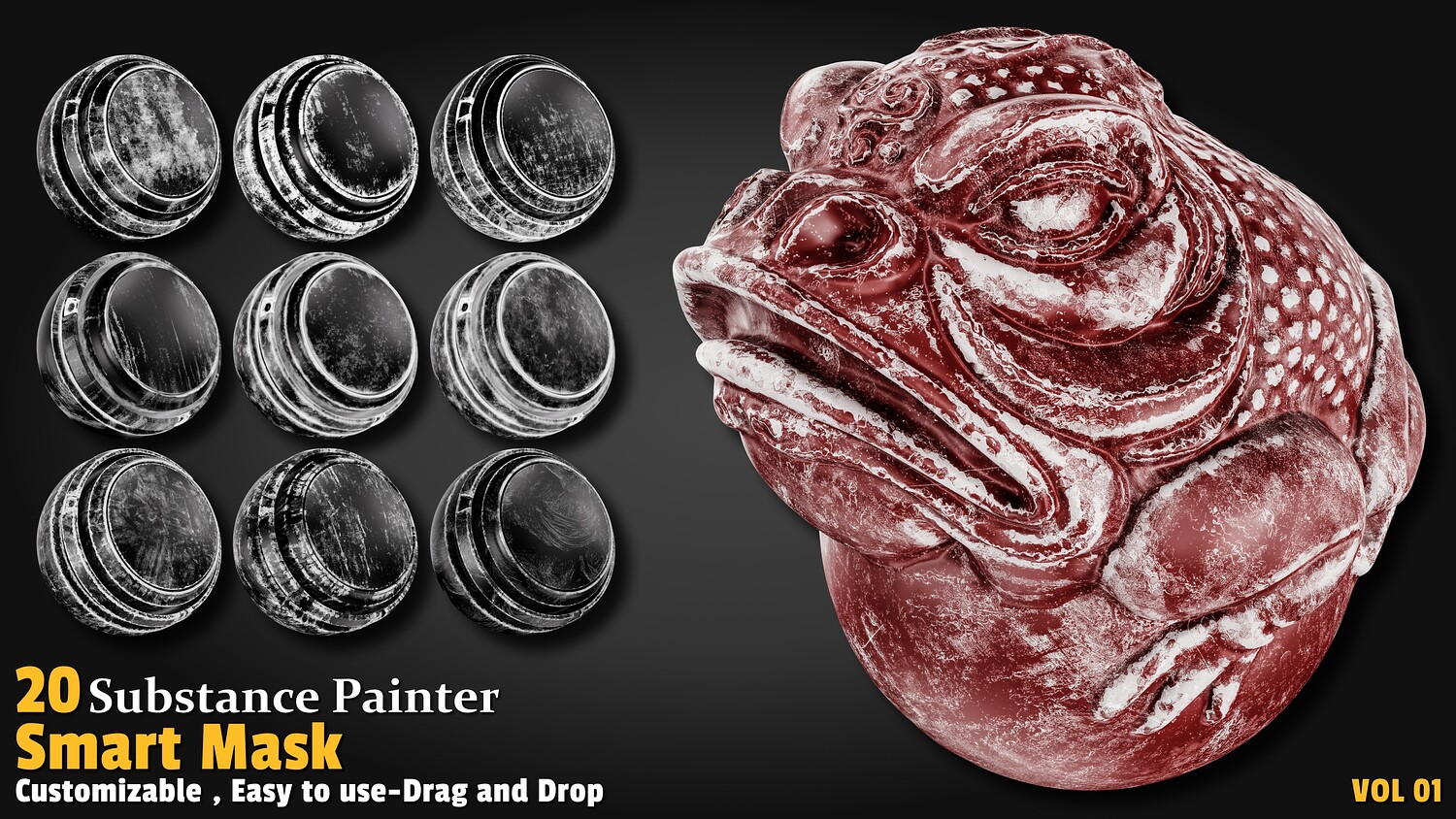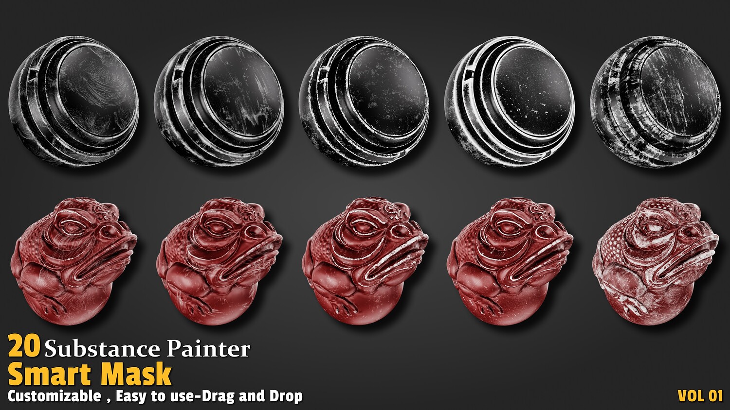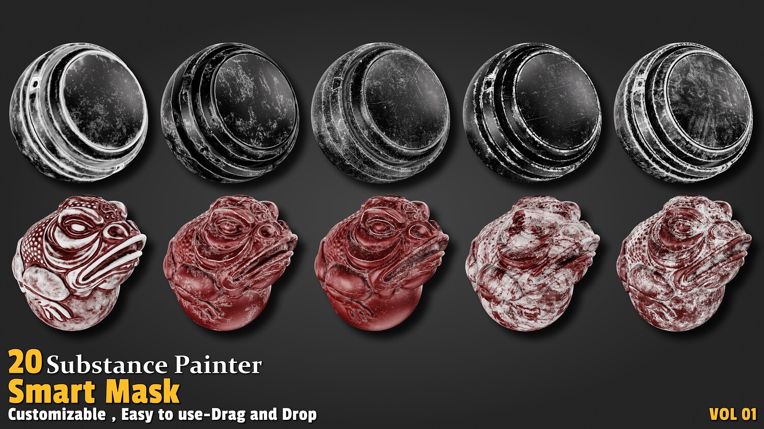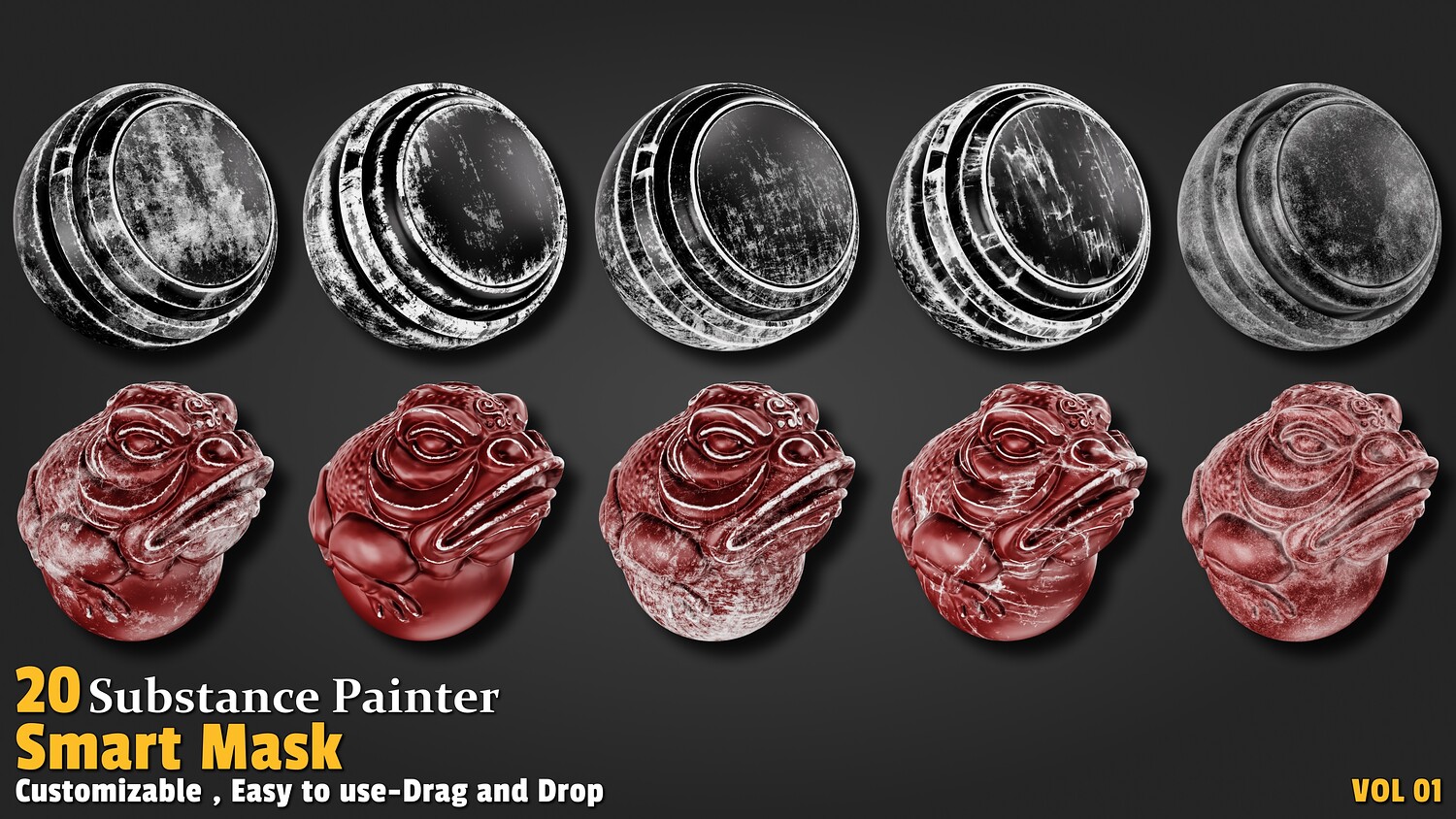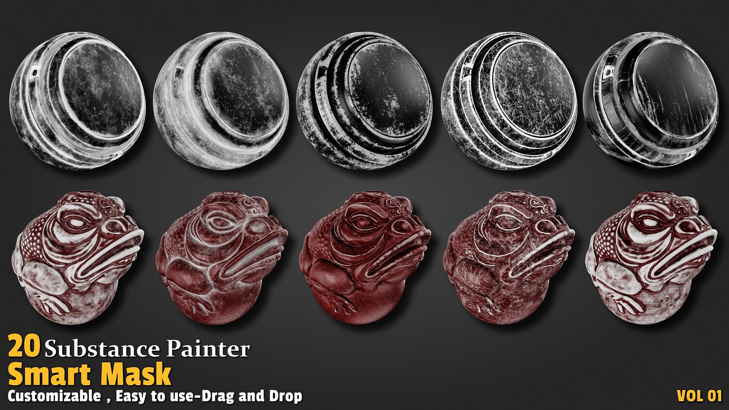 Features: High-quality preview 20 smart dirt edge masks (Smart Mask) Each mask has a proper name Lightweight and optimized 100% created with Substance Painter All masks validated with PBR standards Compatible with Substance 3D Painter version 11.00 and higher Easy drag & drop Applications: Ideal for adding realistic edge wear to models Perfect for industrial, ancient, and weathered objects Great for post-industrial and fantasy scenes in game development Suitable for animation, visual effects, and concept design Ideal for statues, equipment, and weathered architecture How to Use: