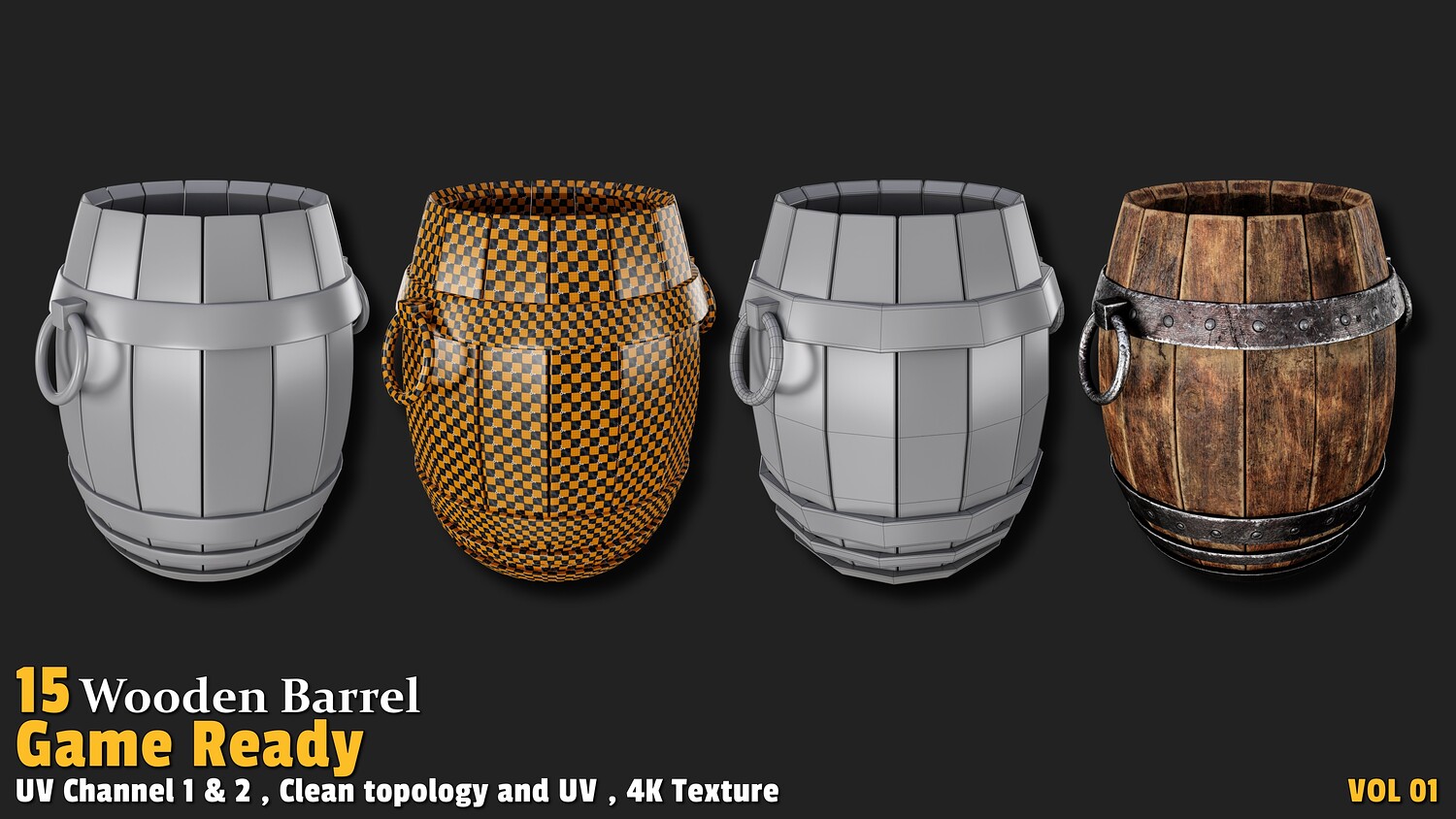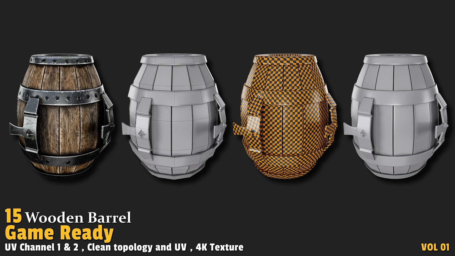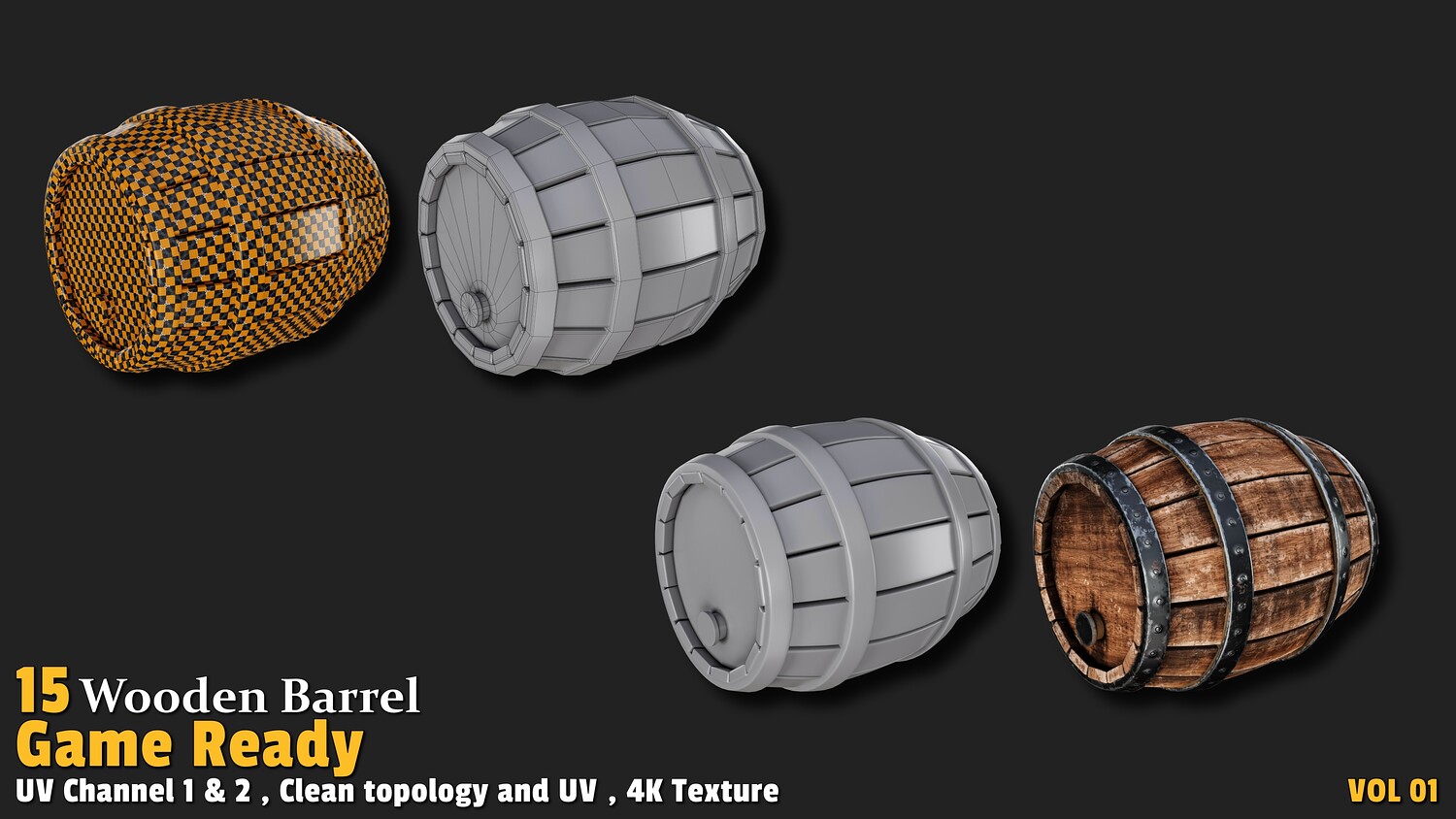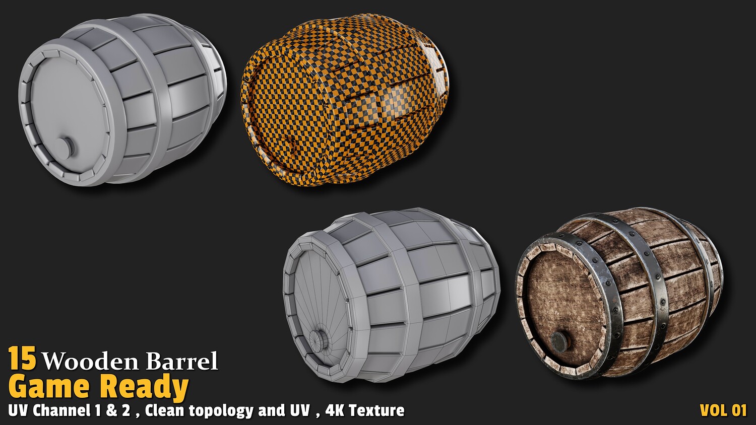 Polygon count: 1,000 to 3,000 per model Clean quad-based topology UV-unwrapped with 2 texture channels 4K textures (Base Color, Normal, ORM) Includes 15 unique wooden barrel designs Usage: These models offer versatile applications in gaming:
