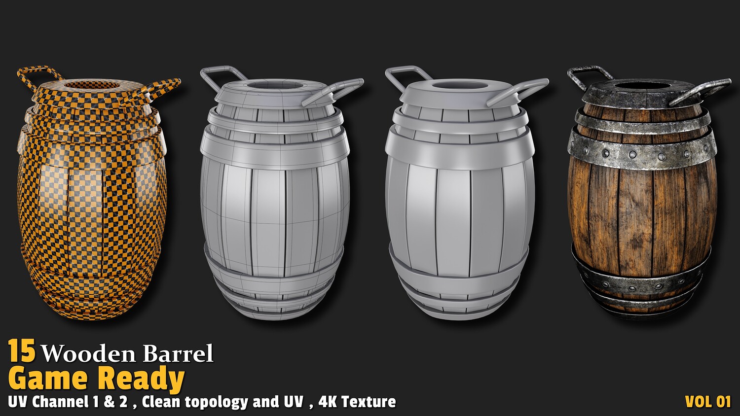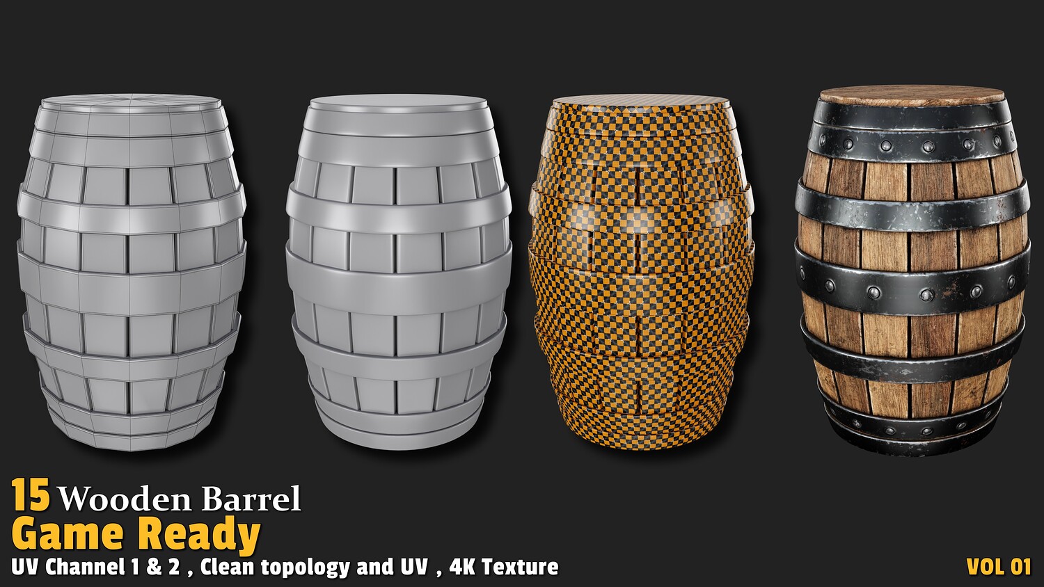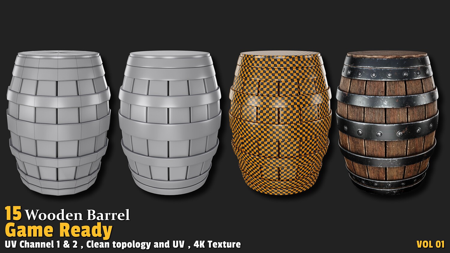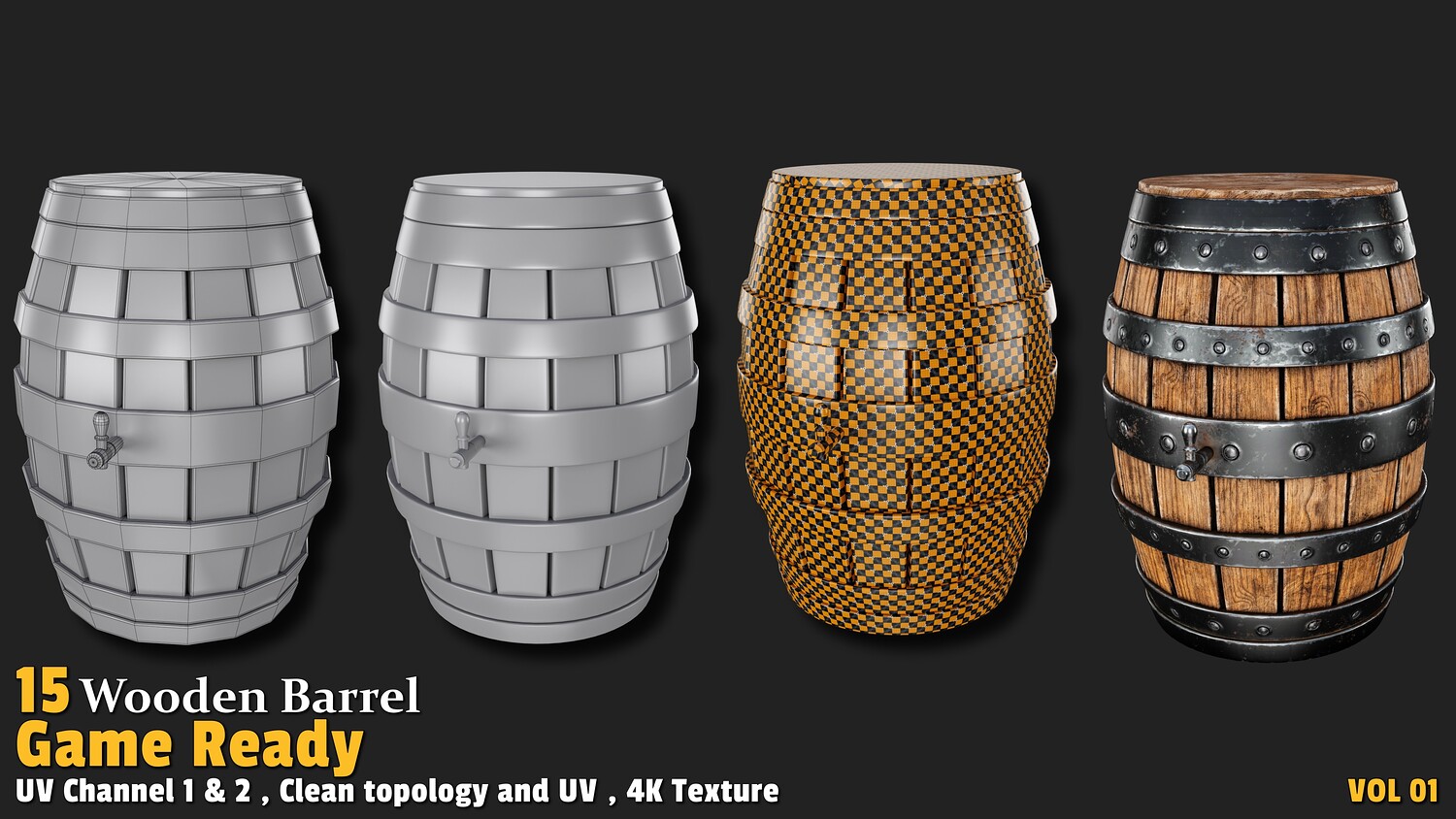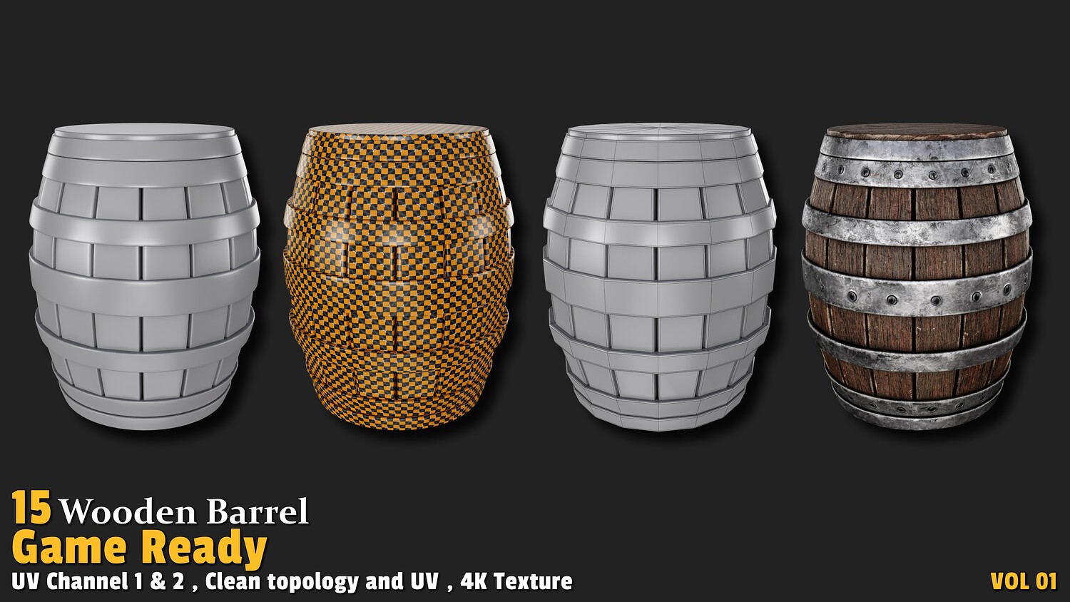 Polygon count: 1,000 to 3,000 per model Clean quad-based topology UV-unwrapped with 2 texture channels 4K textures (Base Color, Normal, ORM) Includes 15 unique wooden barrel designs Usage: These models offer versatile applications in gaming: