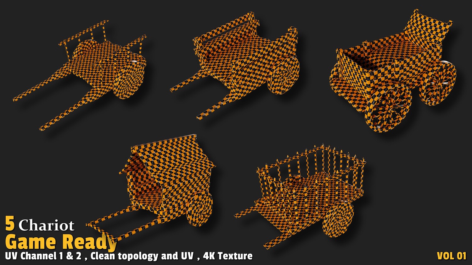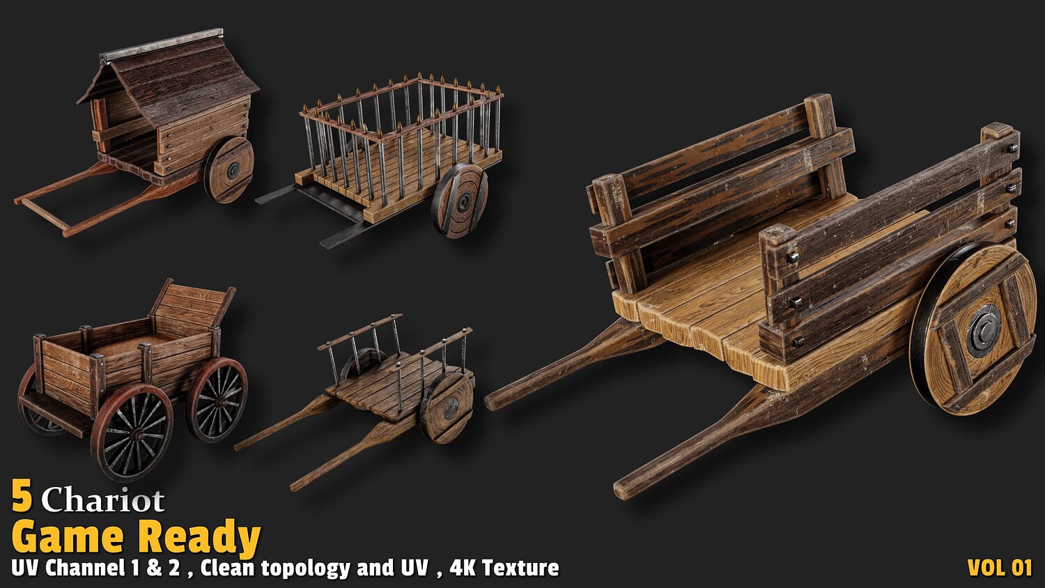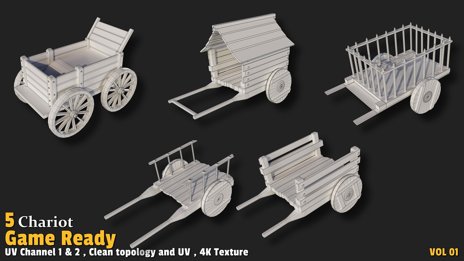 Polygon count: 4,000 to 13,000 per model Clean quad-based topology UV-unwrapped with 2 texture channels 4K textures (Base Color, Normal, ORM) Includes 5 unique chariot designs Usage: