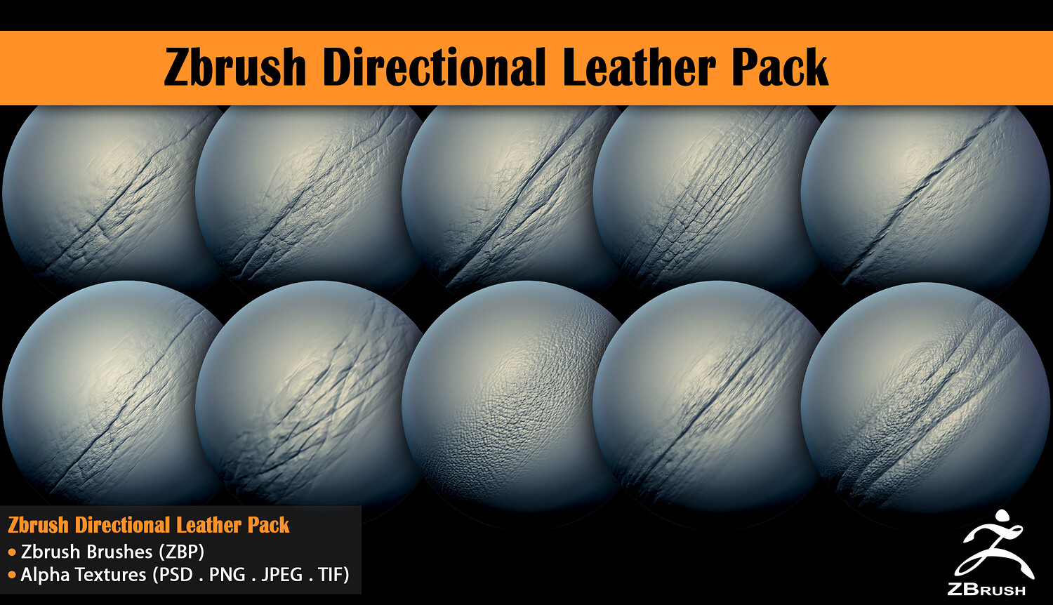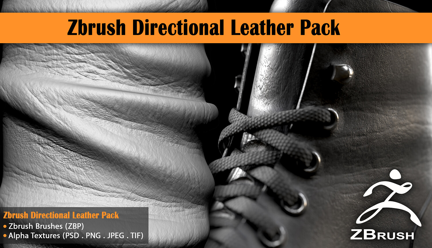 Zbrush Directional Leather Pack in software programs ZBrush are used to create realistic details on a 3D model's surface. Can using alphas in all software that supports alpha info about this Product :
