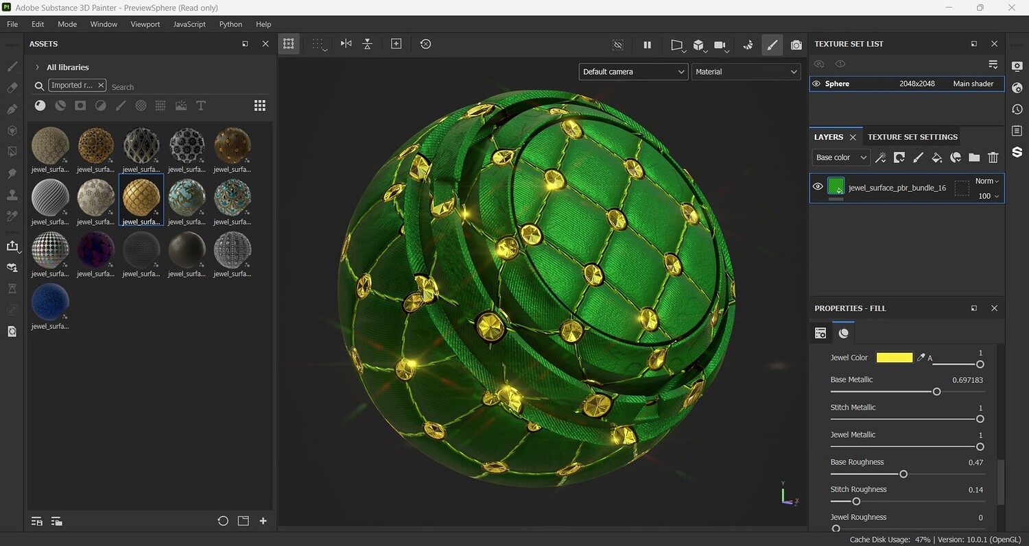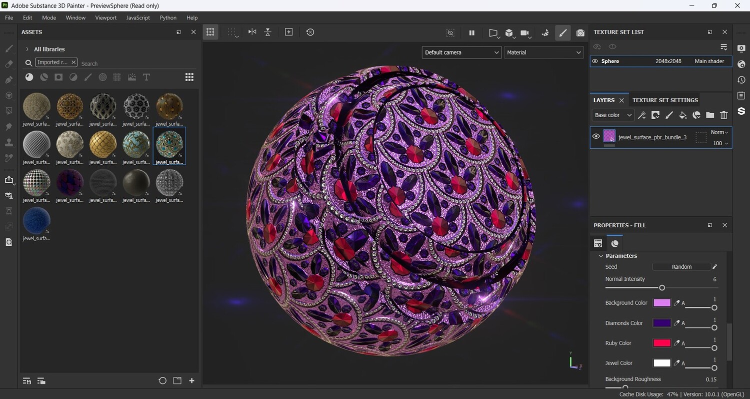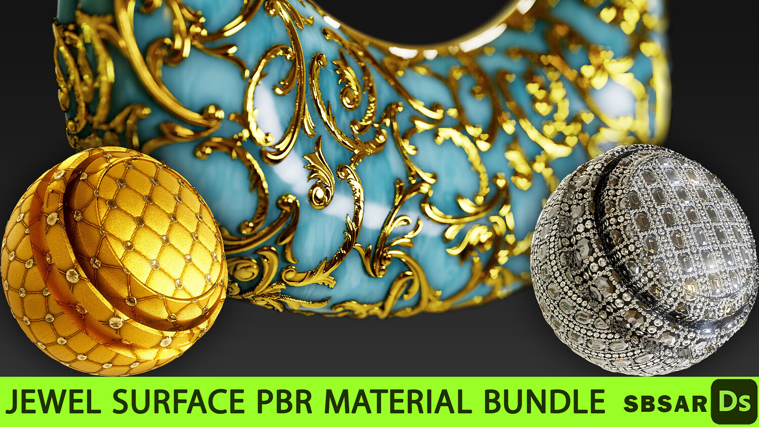 this bundle include 16 high quality and unique bling and jewel surface materials in two formats: jpg 2k texture sets and customizable sbsar files.