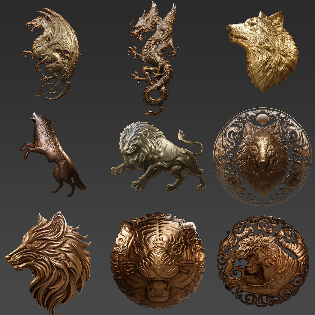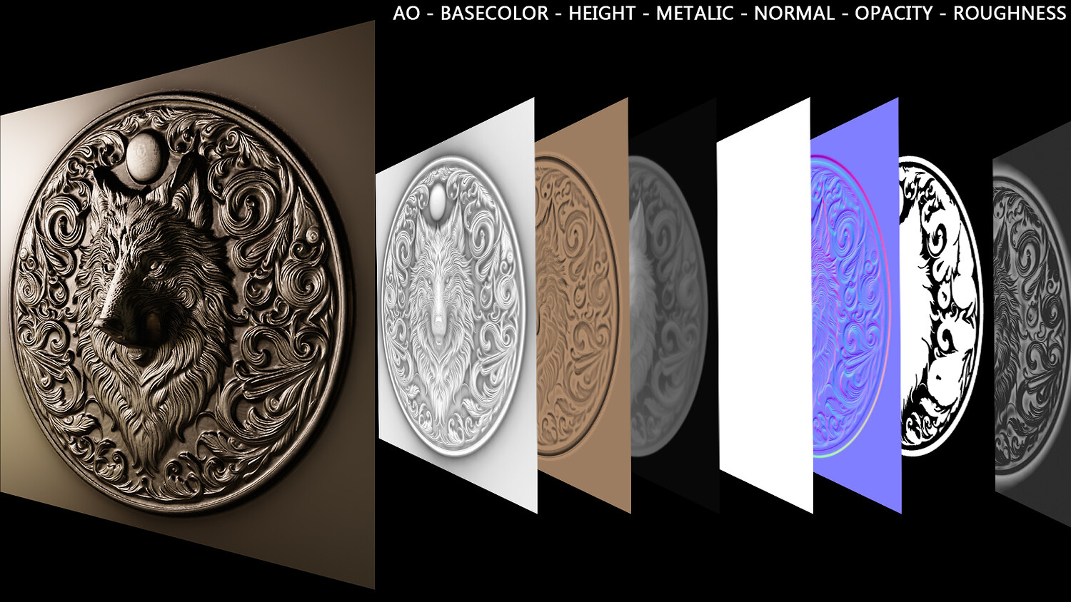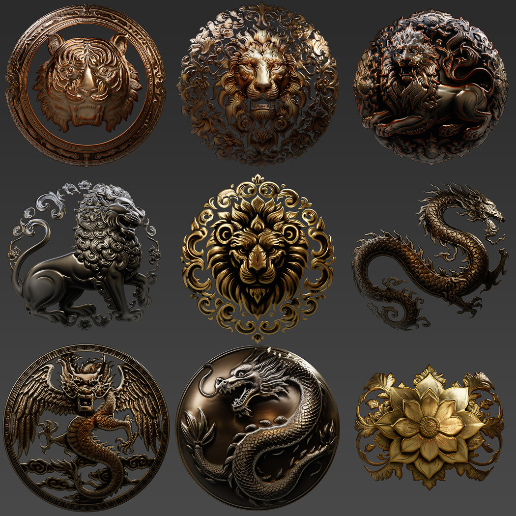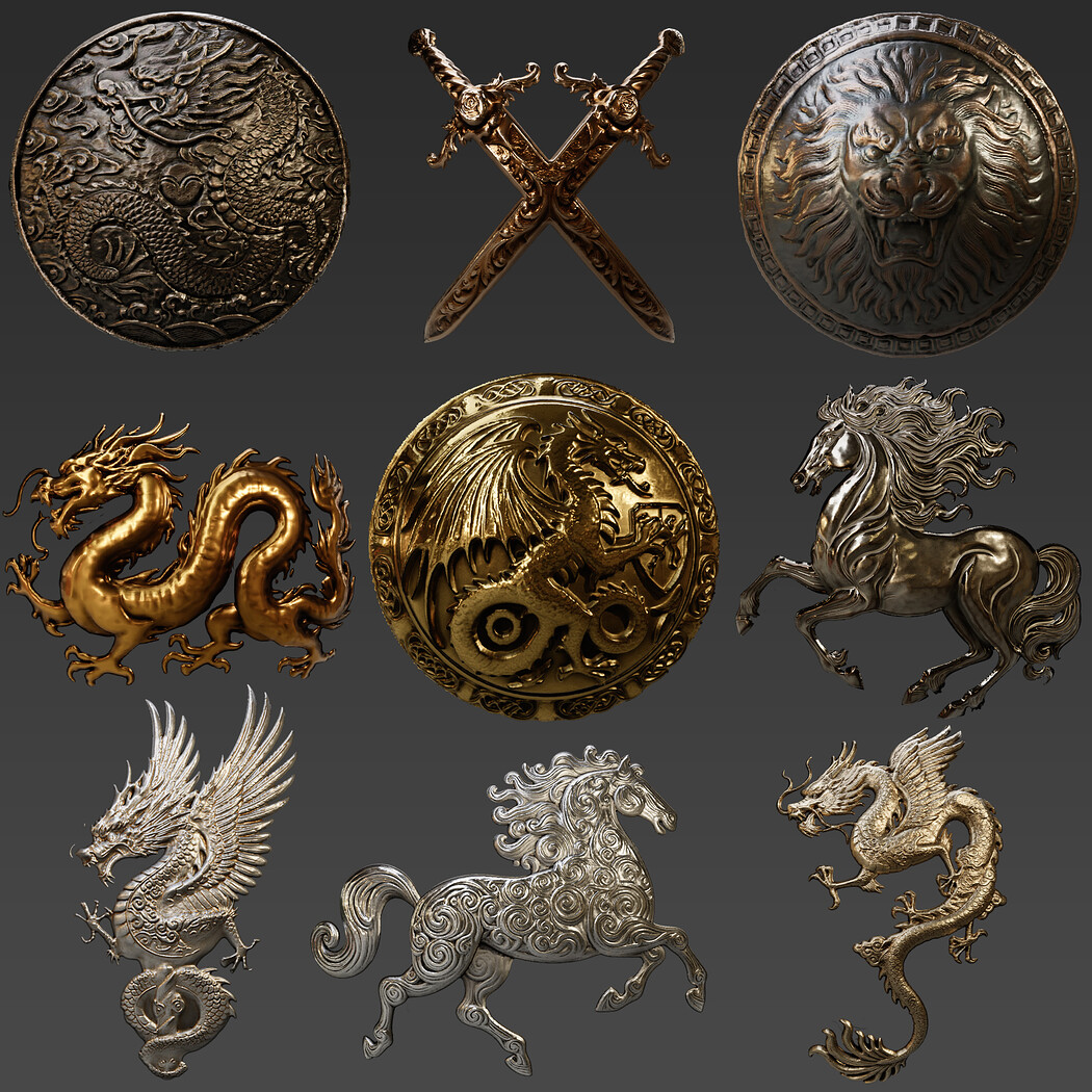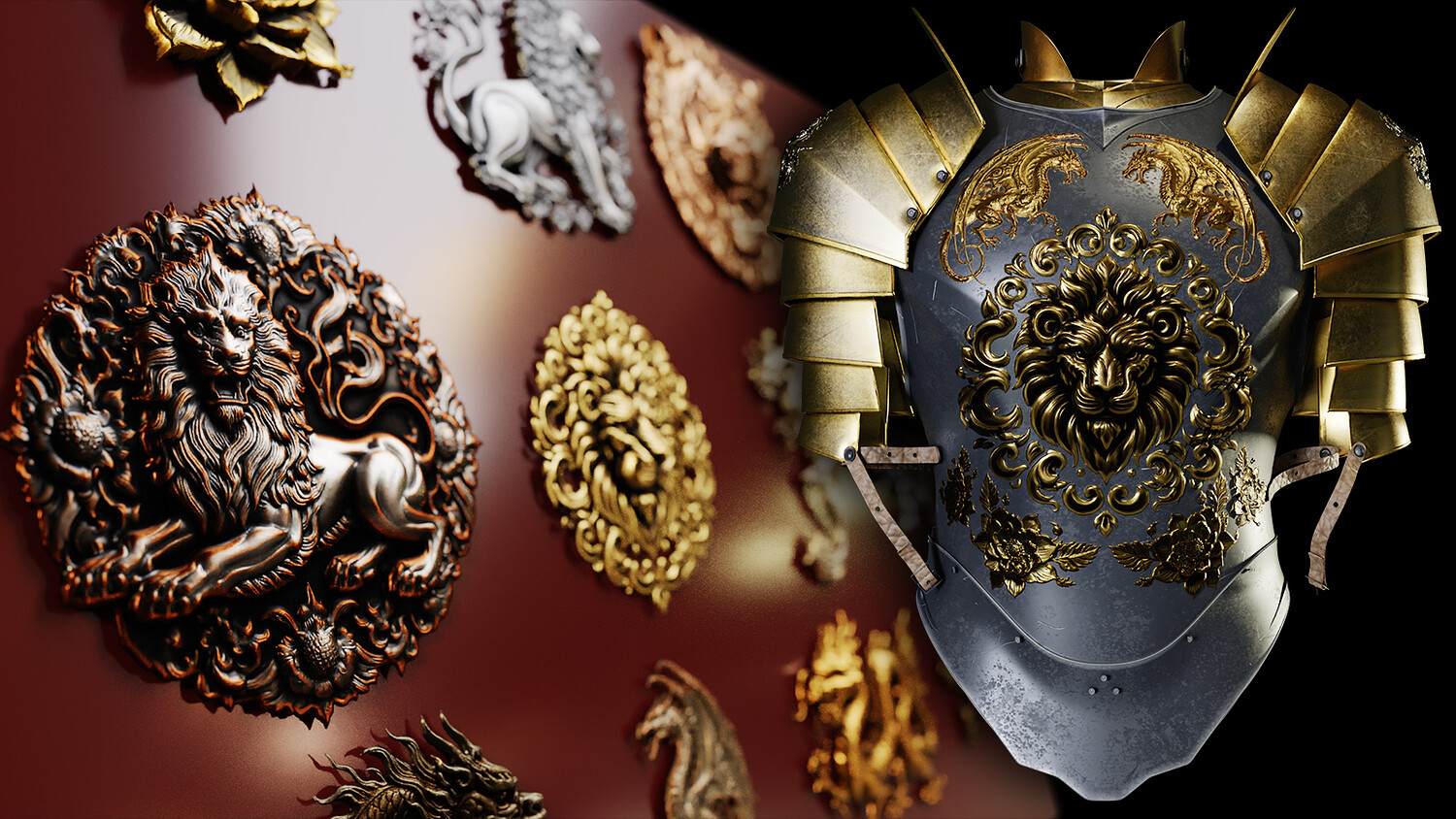 Carved PBR Decal Stencil Bundle includes 31 high quality medallion style carved metal sculptures as a PBR Decal Stencil in shapes of : horse ,lion, tiger, wolf, plants and swords