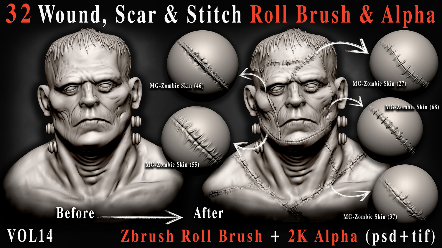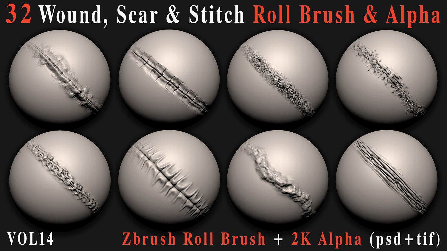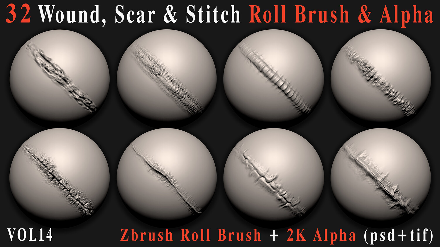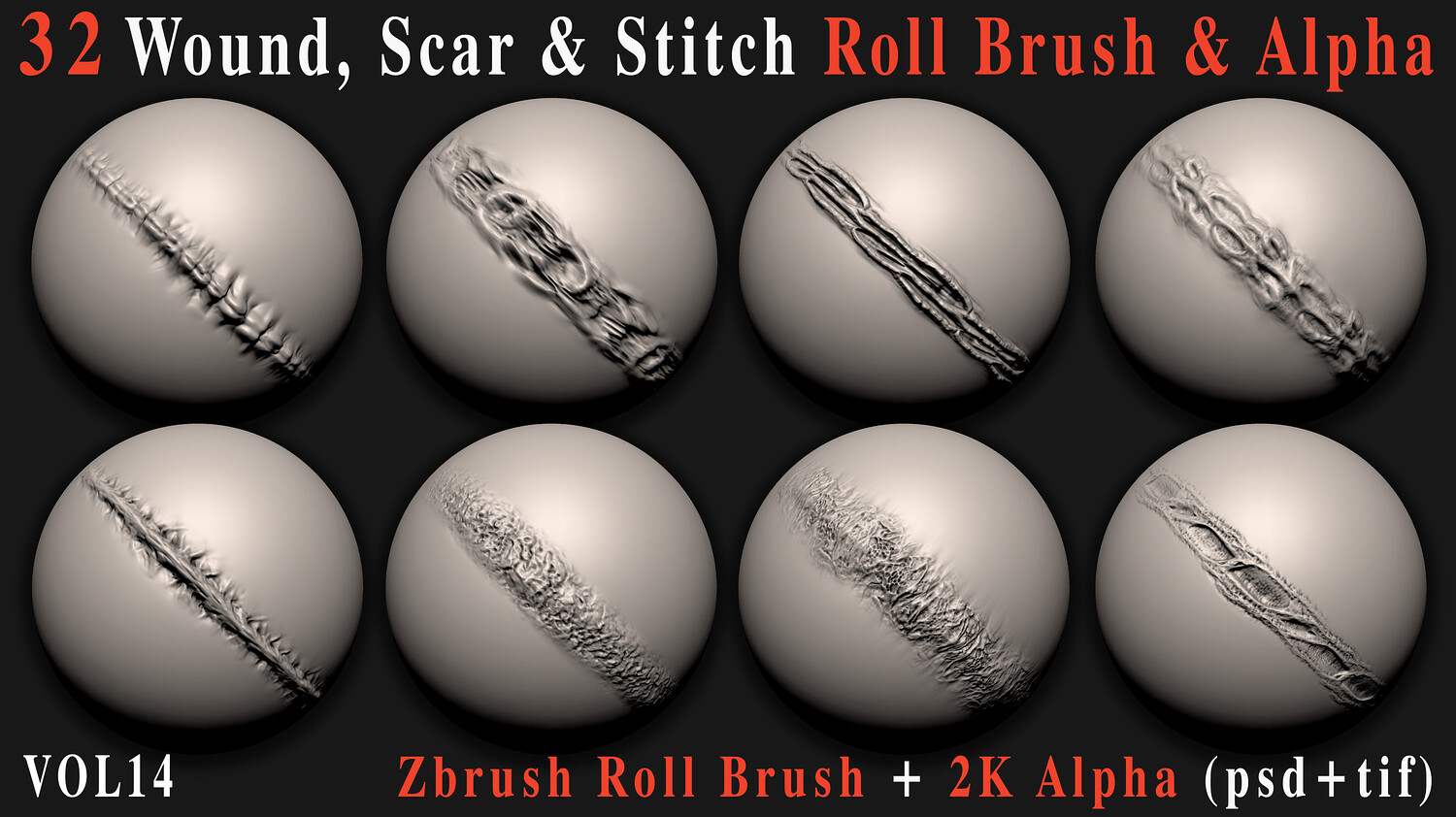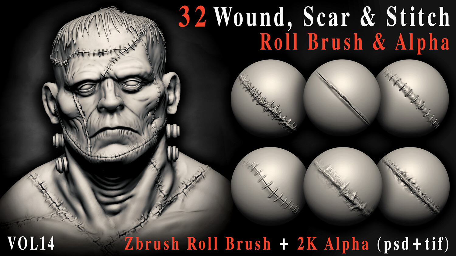 32 Wound, Scar & Stitch Roll Brushes + Alphas – Vol.14