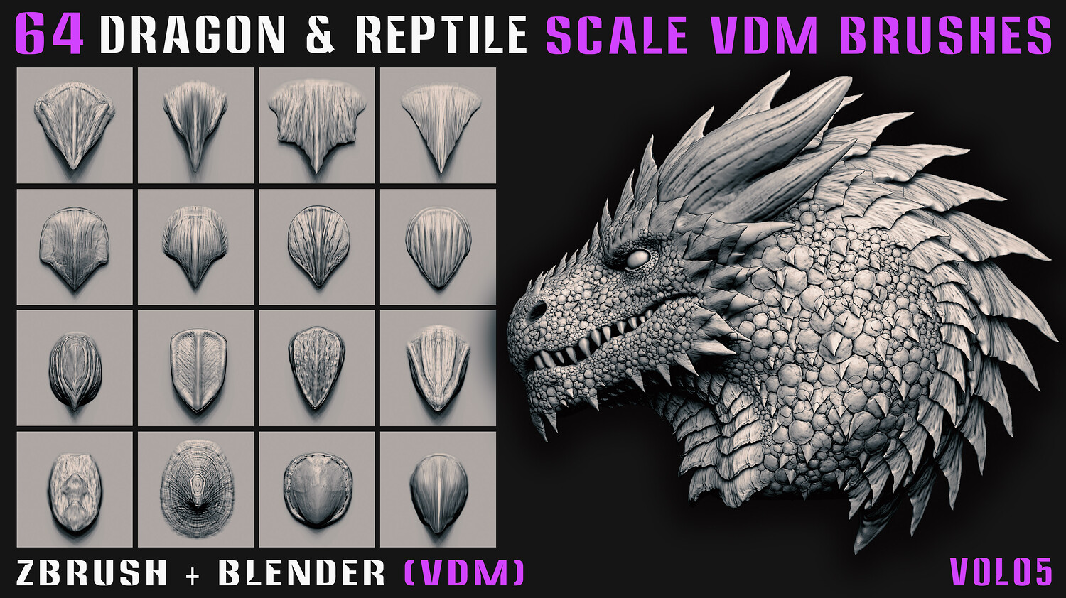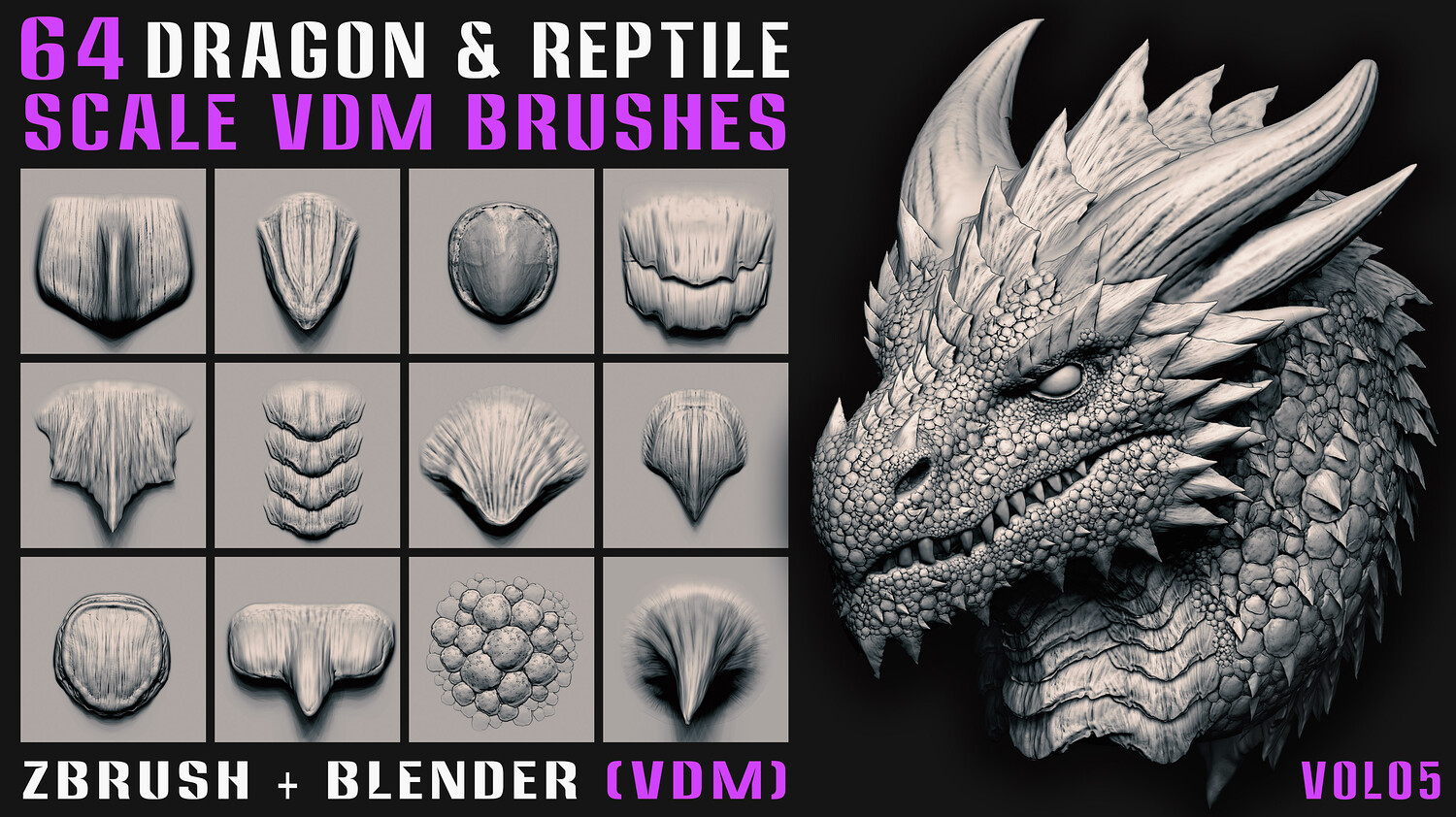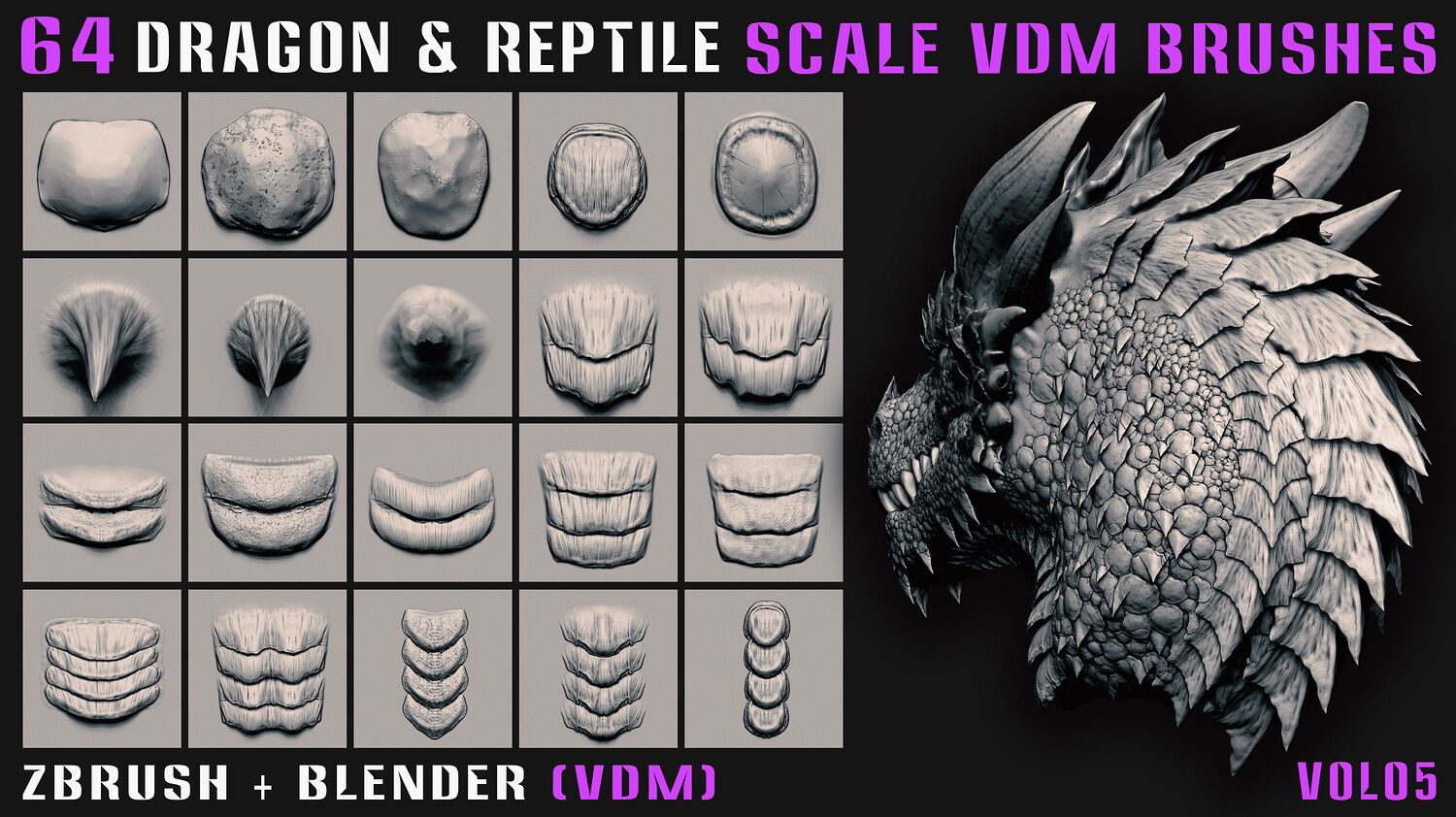 64 Dragon & Reptile Scale VDM Brushes (Zbrush+Blender) - Vol05