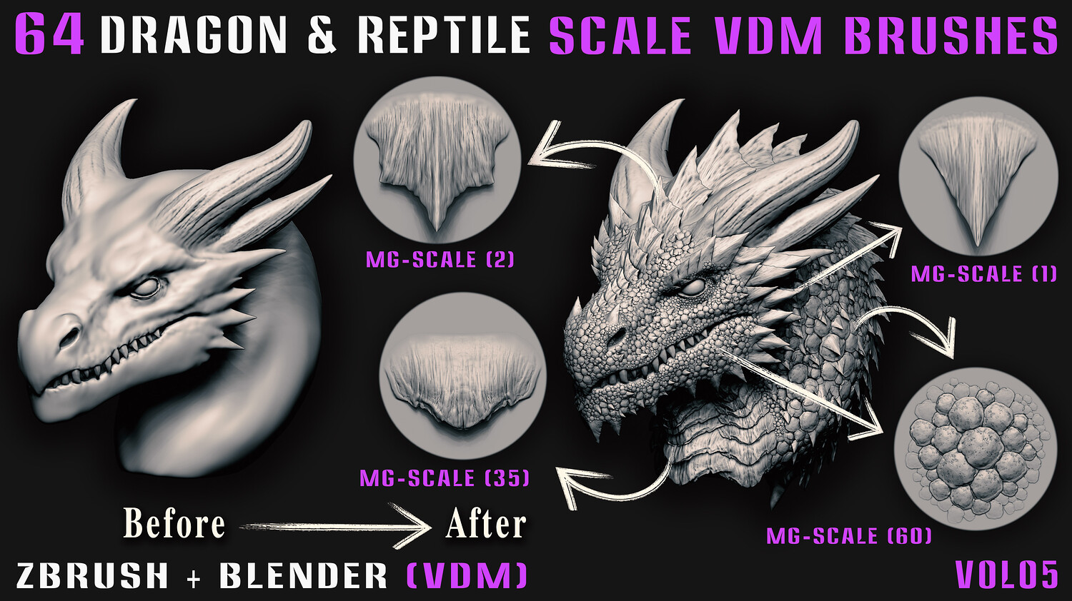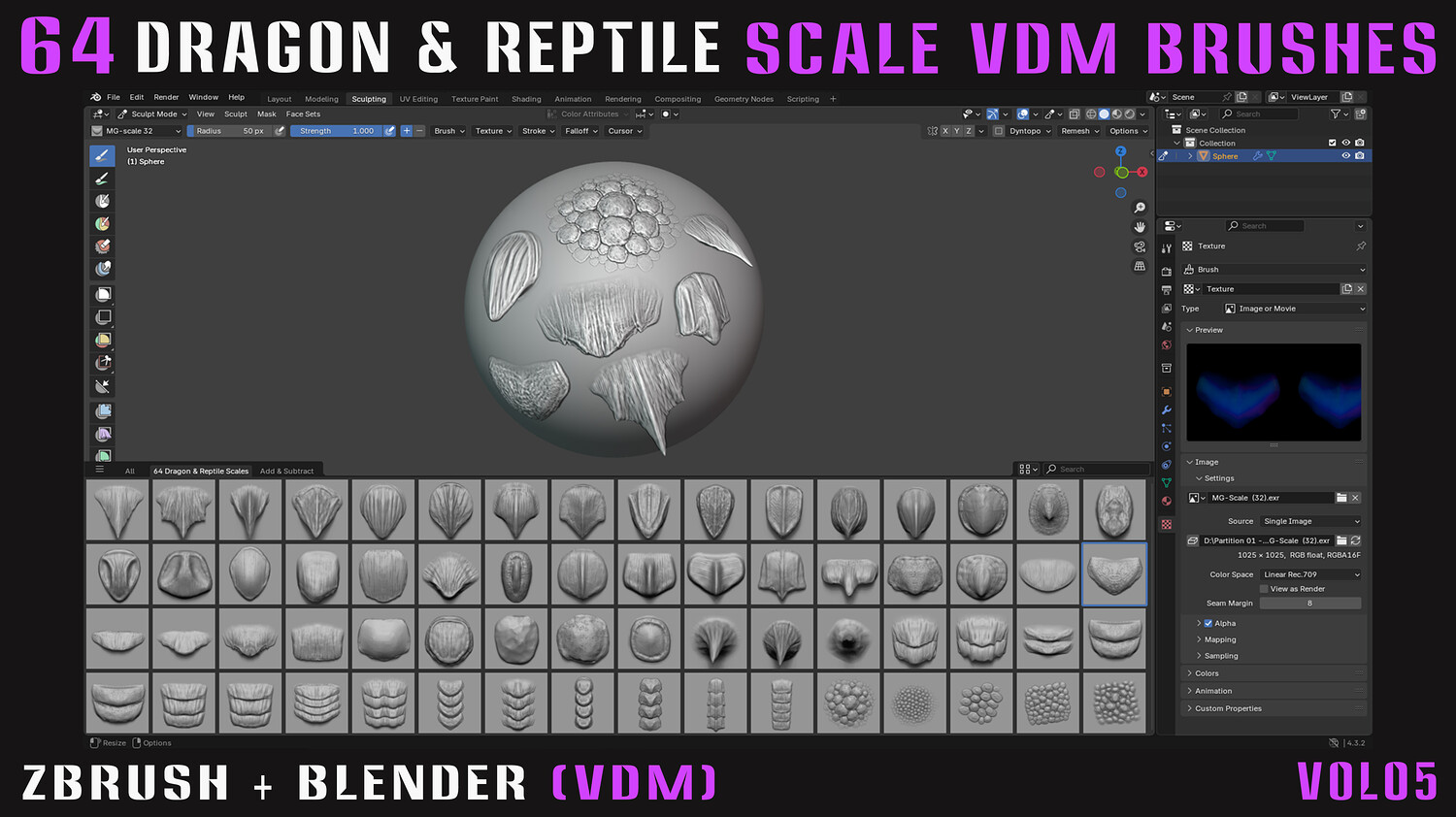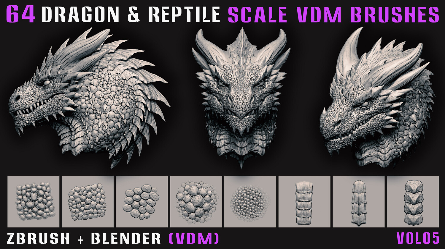 64 Dragon & Reptile Scale VDM Brushes (Zbrush+Blender) - Vol05