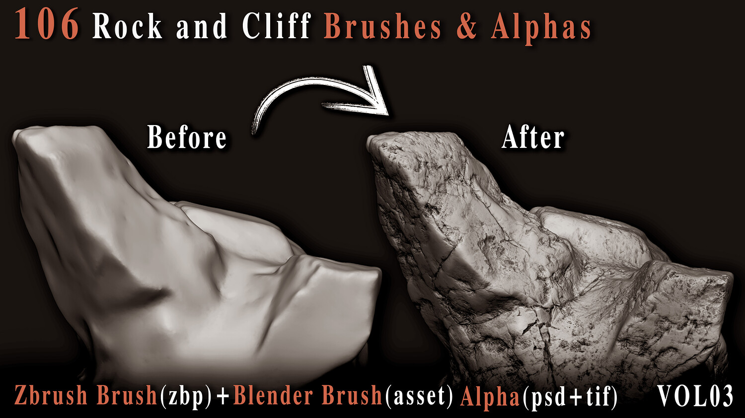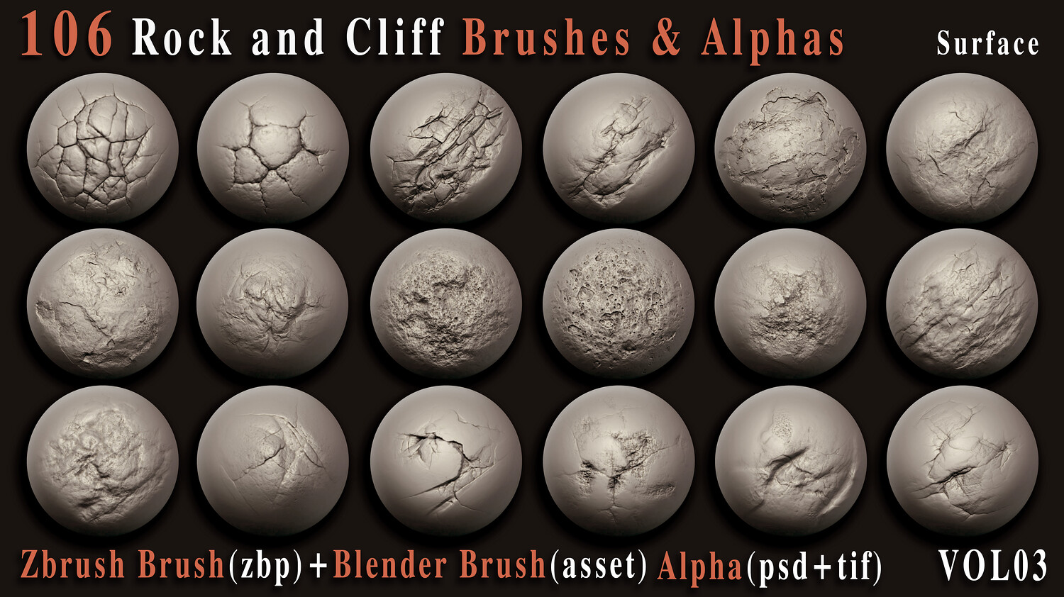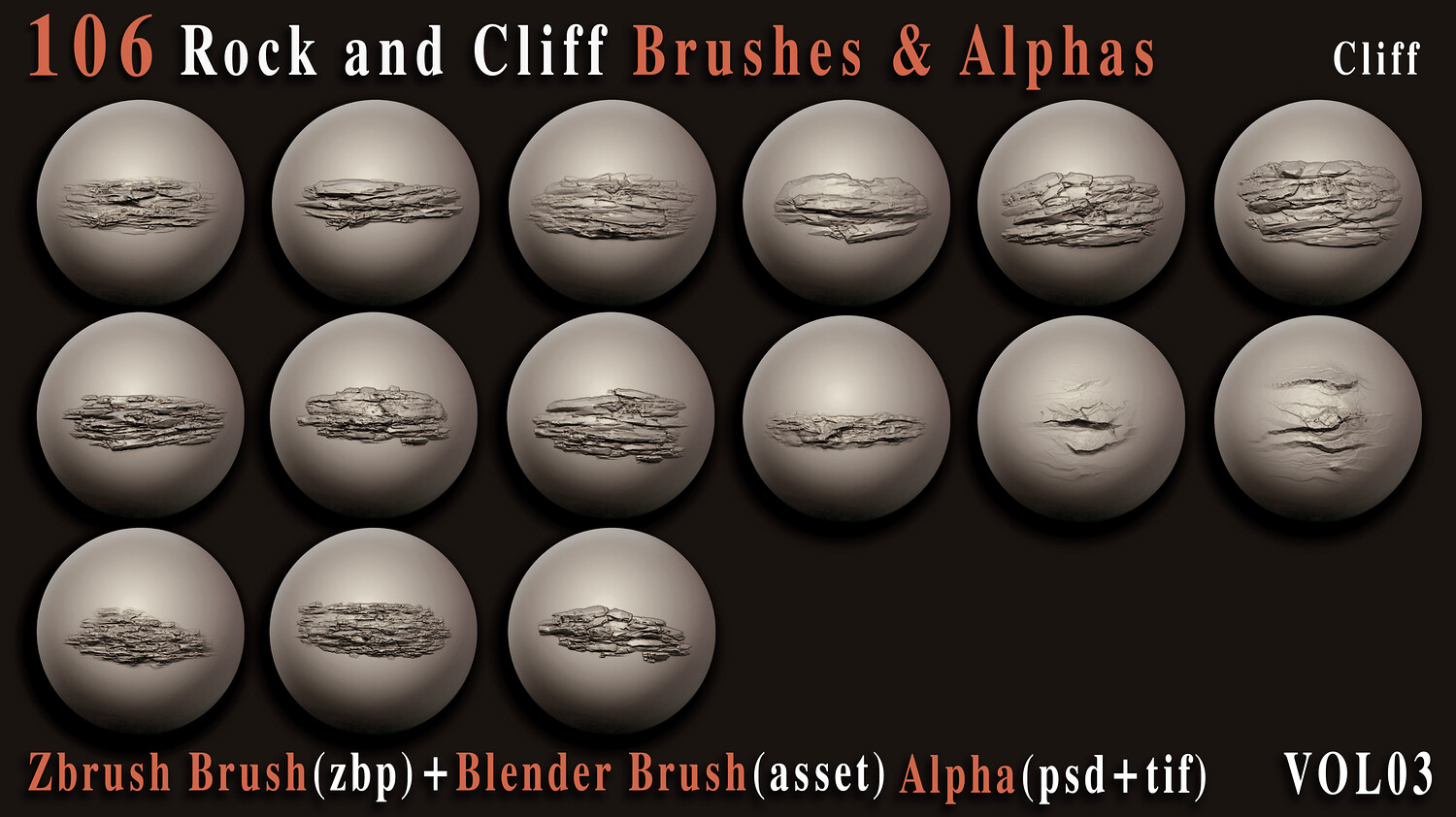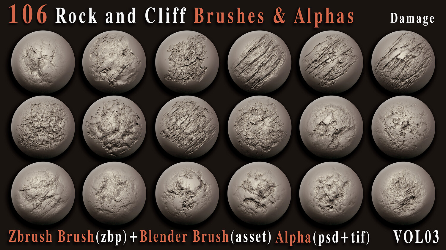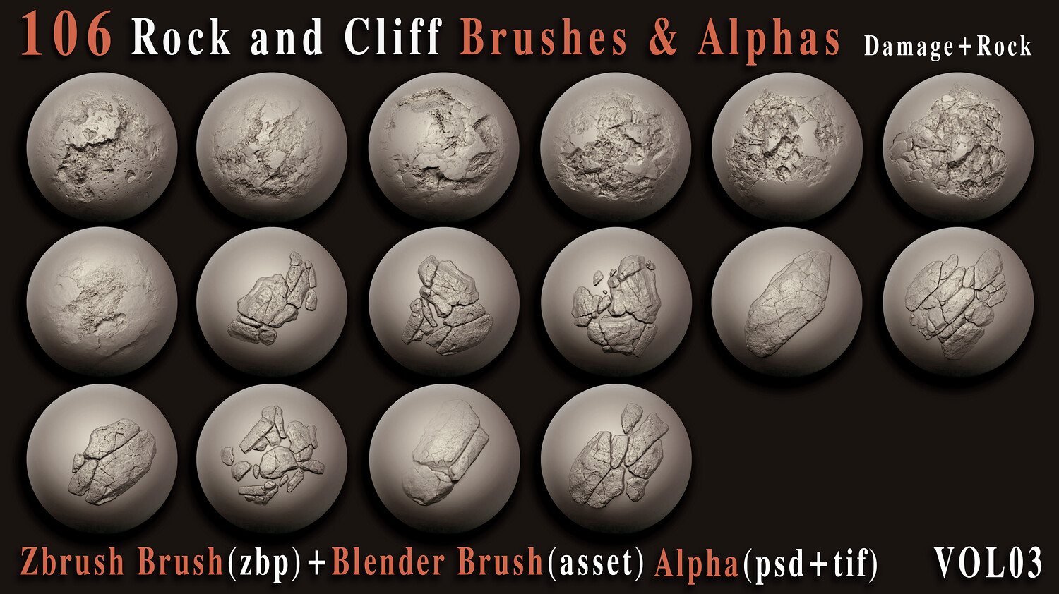 Enhance your 3D creations with this powerful collection of 106 high-quality rock and cliff brushes and alphas, carefully crafted to bring realistic surface depth and natural imperfections to your models. Whether you're building rugged environments, sculpting cliffs, or adding fine rock details, this versatile pack is designed to speed up your workflow and elevate your results. This set includes both VDM brushes for ZBrush + Blender and 2K alphas (PSD, TIFF) for flexible use across your favorite 3D software.
