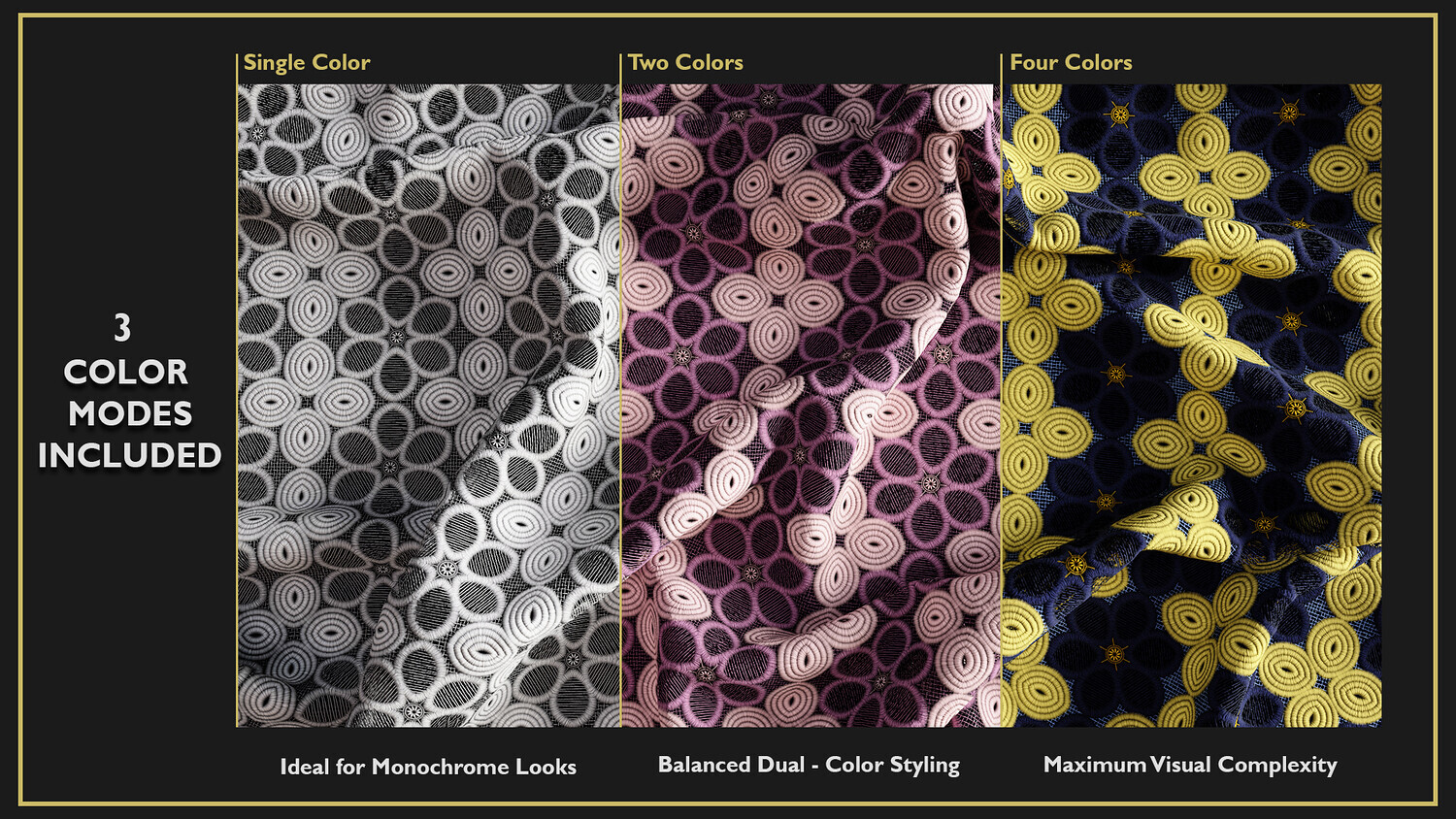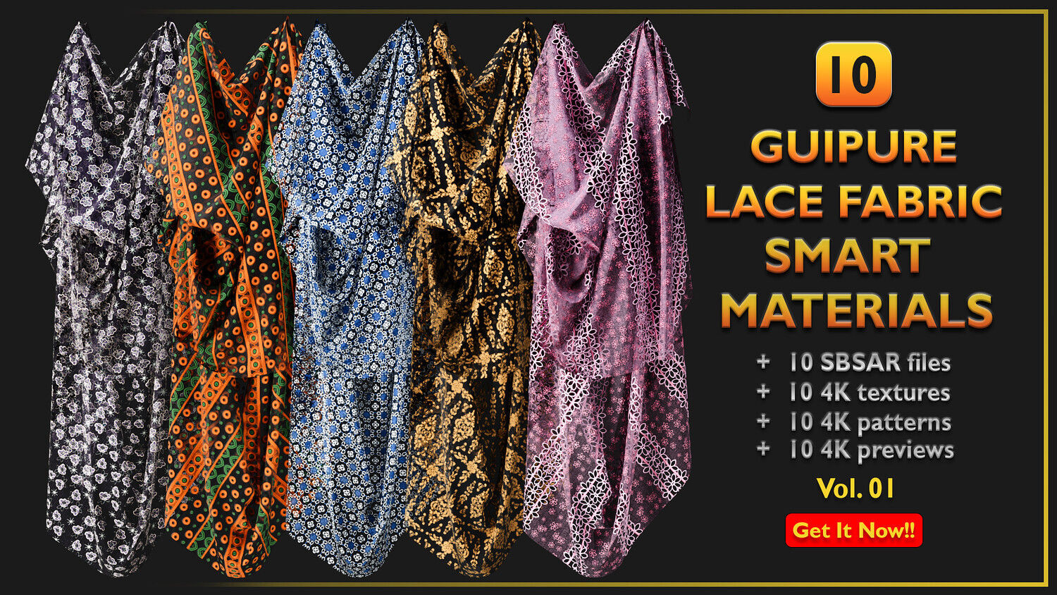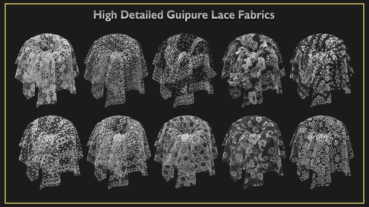 This product includes 10 Guipure Lace Fabric Smart Materials, 10 texture sets, and 10 4K previews.