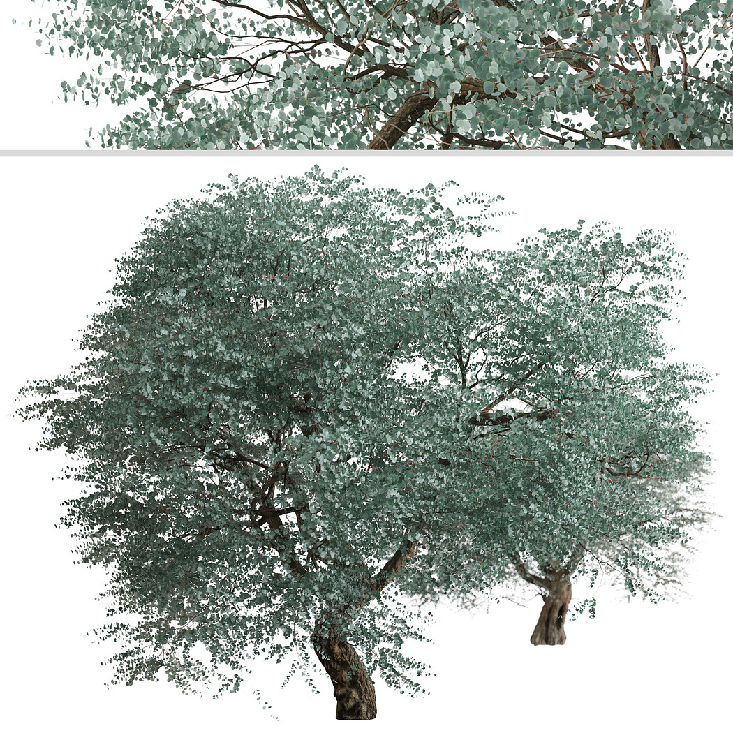 2 different Eucalyptus cinerea trees in the scene. Eucalyptus cinerea, commonly known as the Argyle apple, mealy stringbark or silver dollar tree, is a species of small- to medium-sized tree that is endemic to Australia. It can grow rapidly (6-8 feet in one season). The leaves are round, fragrant and an attractive silver color, hence the common name, silver dollar tree. The bark is reddish brown and peels on smaller stems and becomes gray and stringy on the trunk as the tree matures. It is grown primarily for its foliage but rarely produces flowers. The foliage is fragrant and is frequently used in floral arrangements. Polygons (Total number of scene): 1,966,680 Verts (Total number of scene): 2,198,012 Eucalyptus cinerea1: 8/50 m Eucalyptus cinerea2: 9/50 m In the archive: 3ds max (V-ray-2014), FBX, OBJ, Blender and ... * Features: - Optimized for Distant and Closeup Views - Clean Topology - Unwrapped Overlapping - Real-World Scale - Transformed into zero - Objects Named - Materials Named - Units: Centimeters