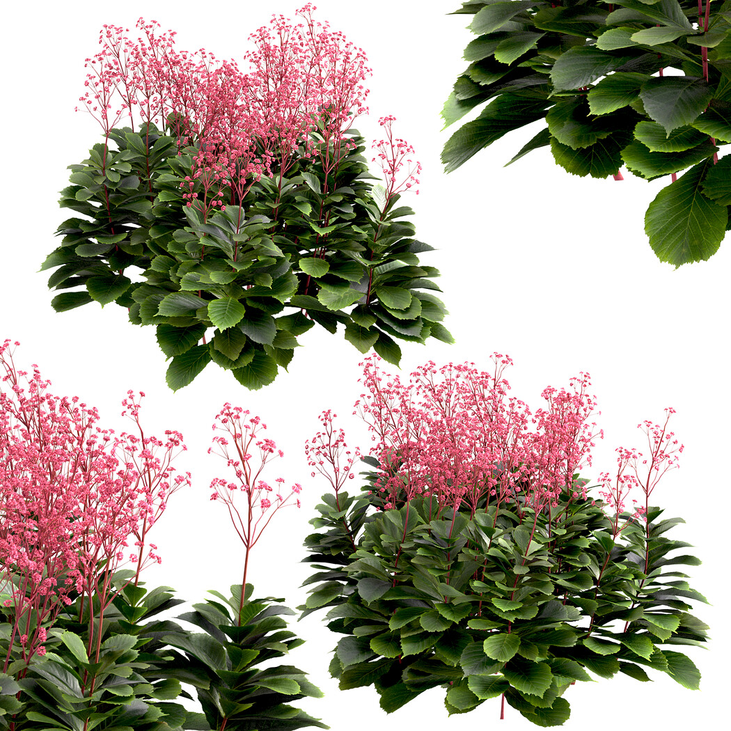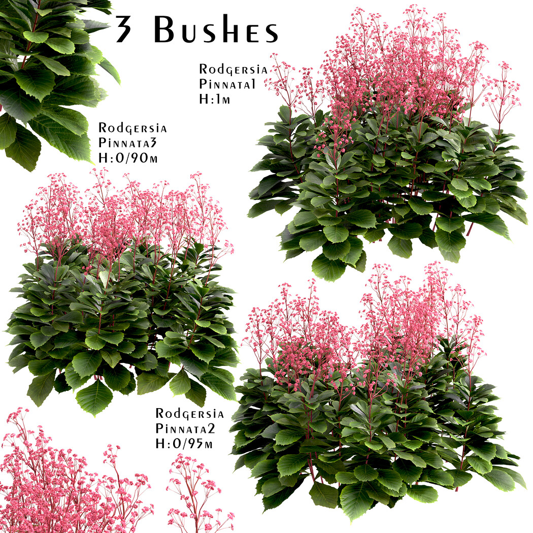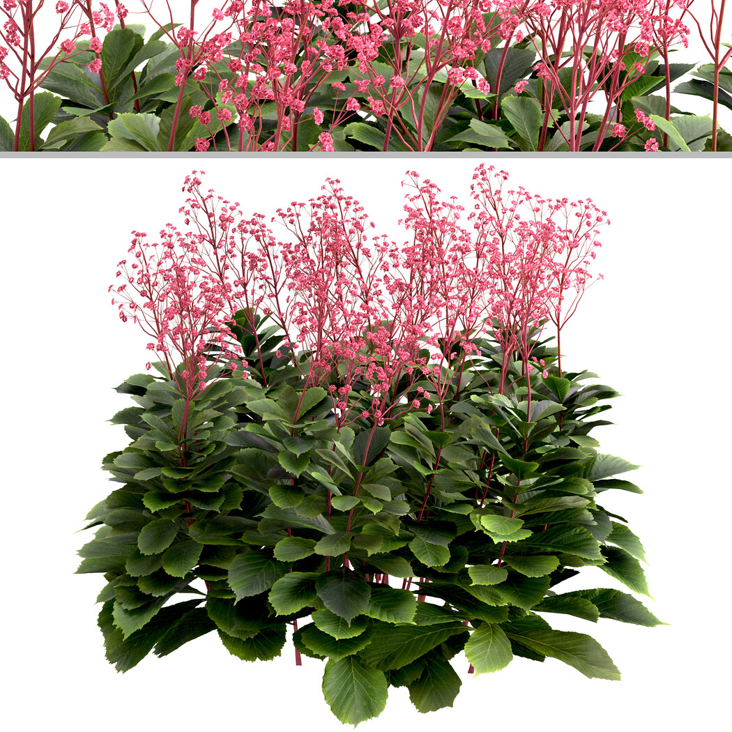 3 different Rodgersia pinnata bushes in the scene. Rodgersia pinnata is a species of flowering plant in the family Saxifragaceae, native to the Sichuan and Yunnan provinces of China. It is a robust, herbaceous perennial growing to 120 cm (47 in) tall by 75 cm (30 in) broad, with textured palmate / pinnate leaves up to 90 cm (35 in) long, with 5-9 leaflets. Rodgersia pinnata 'Superba' is a deciduous herbaceous perennial with an architectural habit. It has smoothly textured foliage which is bronze in Spring then turns green in summer and autumn. The large leaves emerge from thick rhizomes, are textured and have a distinctive pinkish-bronze coloring when young. This plant has the most diverse leaf form of any of the Rodgersia species. Polygons (Total number of 3 bushes): 1,956,302 Verts (Total number of 3 bushes): 1,473,050 Rodgersia pinnata1: 1 m Rodgersia pinnata2: 0/95 m Rodgersia pinnata3: 0/90 m In the archive: 3ds max (V-ray-2014), FBX and ... * Features: - Optimized for Distant and Closeup Views - Clean Topology - Unwrapped Overlapping - Real-World Scale - Transformed into zero - Objects Named - Materials Named - Units: Centimeters
