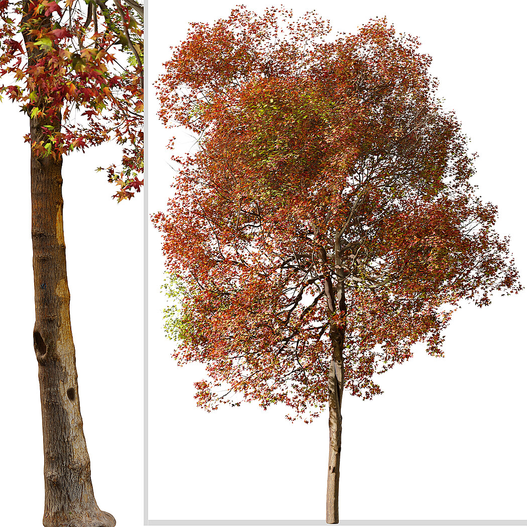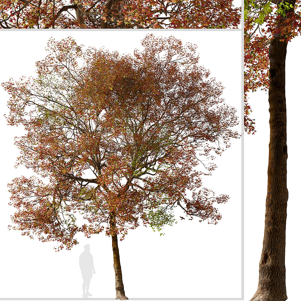 The American sweetgum — with its star-shaped leaves, neatly compact crown, interesting fruit, and twigs with unique corky growths called wings — is an attractive shade tree. It has become a prized specimen in parks, campuses, and large yards across the world. Deep, glossy green star-shaped leaves mark the Sweetgum. Leaves turn yellow-purple-red in the fall, and stay on the tree quite late. Its shape is pyramidal, becoming more rounded with age.