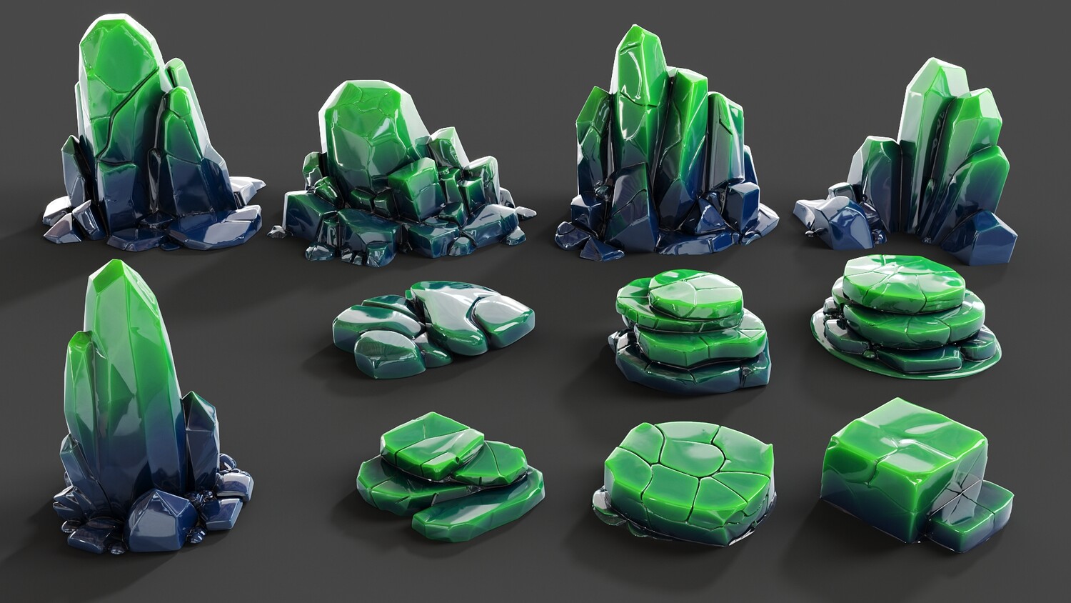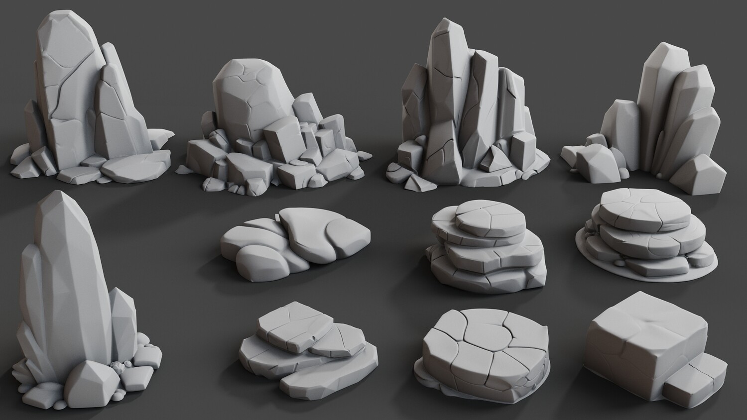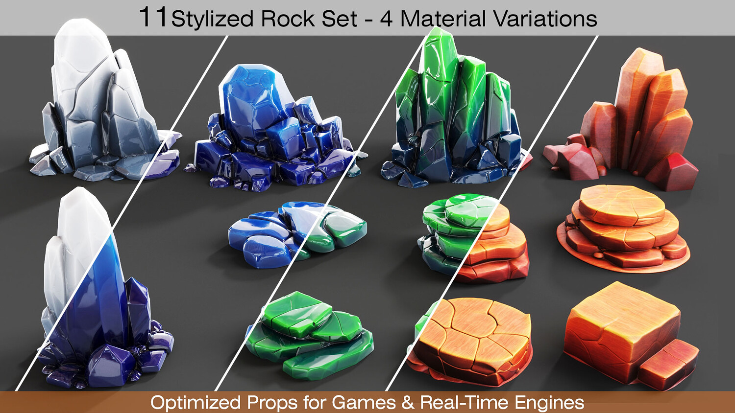 Stylized Rock Set featuring 11 unique stylized rock assets with 4 different material variations. Perfect for fantasy environments, stylized games, and real-time projects.