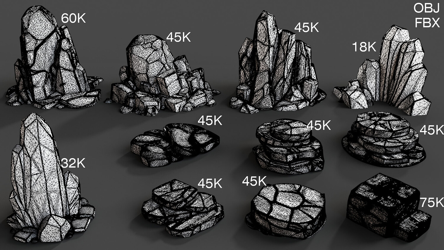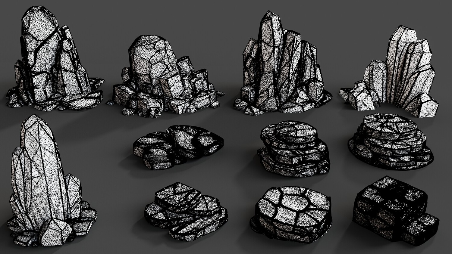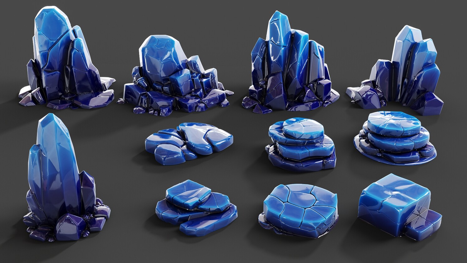 Stylized Rock Set featuring 11 unique stylized rock assets with 4 different material variations. Perfect for fantasy environments, stylized games, and real-time projects.