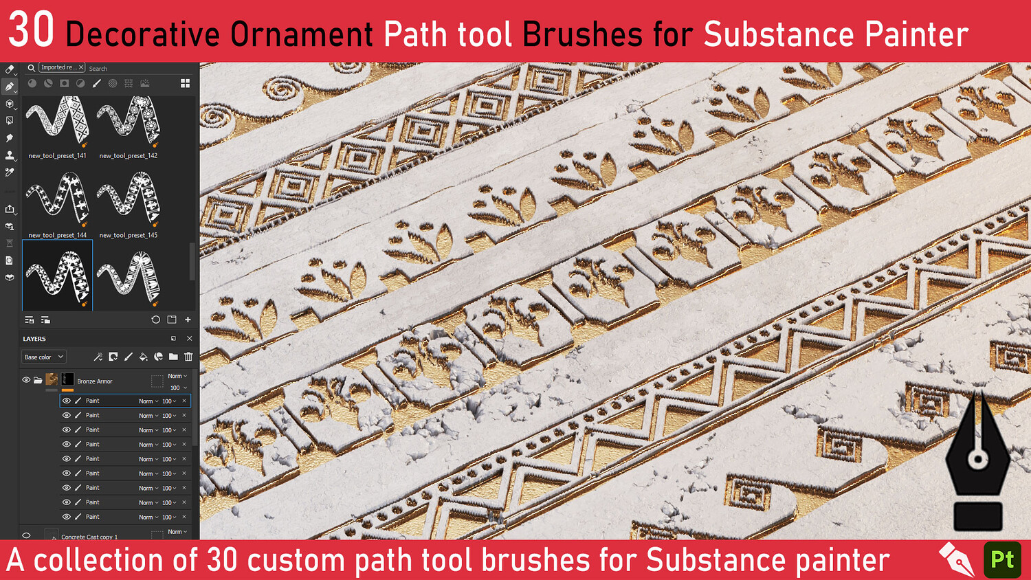 A collection of 30 custom path tool brushes for Substance Painter, designed to add detailed ornaments, trims, and decorative patterns to your models. These brushes work as mask tools(watch the video), allowing you to apply any material of your choice (gold, metal, stone, wood, fabric, etc.) for maximum flexibility.