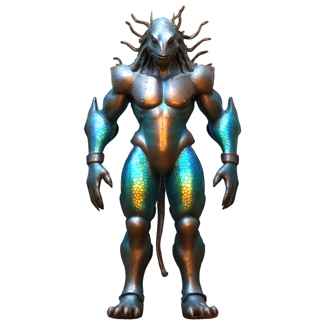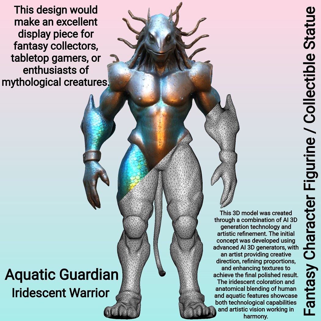 This 3D model was created through a combination of AI 3D generation technology and artistic refinement. The initial concept was developed using advanced AI 3D generators, with an artist providing creative direction, refining proportions, and enhancing textures to achieve the final polished result. The iridescent coloration and anatomical blending of human and aquatic features showcase both technological capabilities and artistic vision working in harmony.