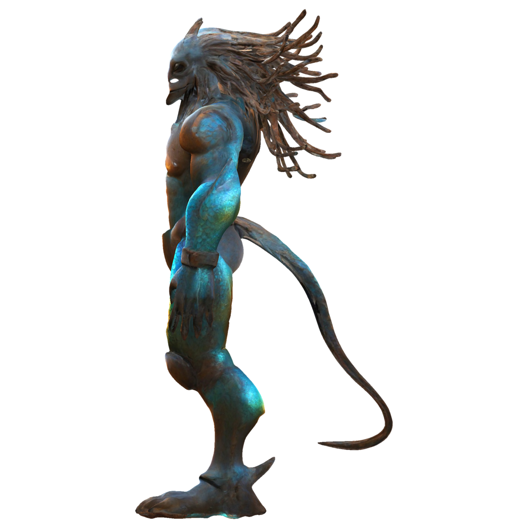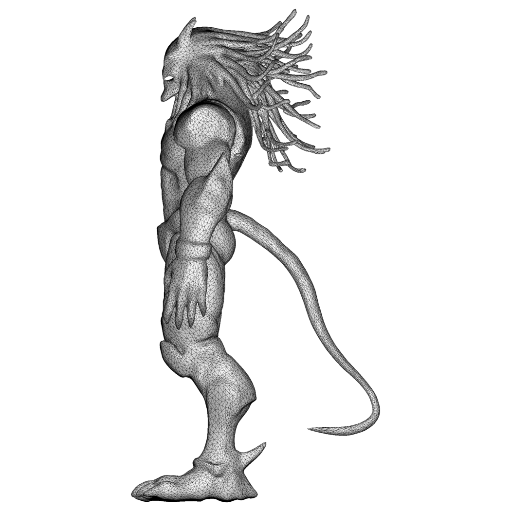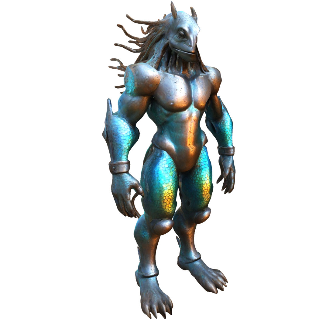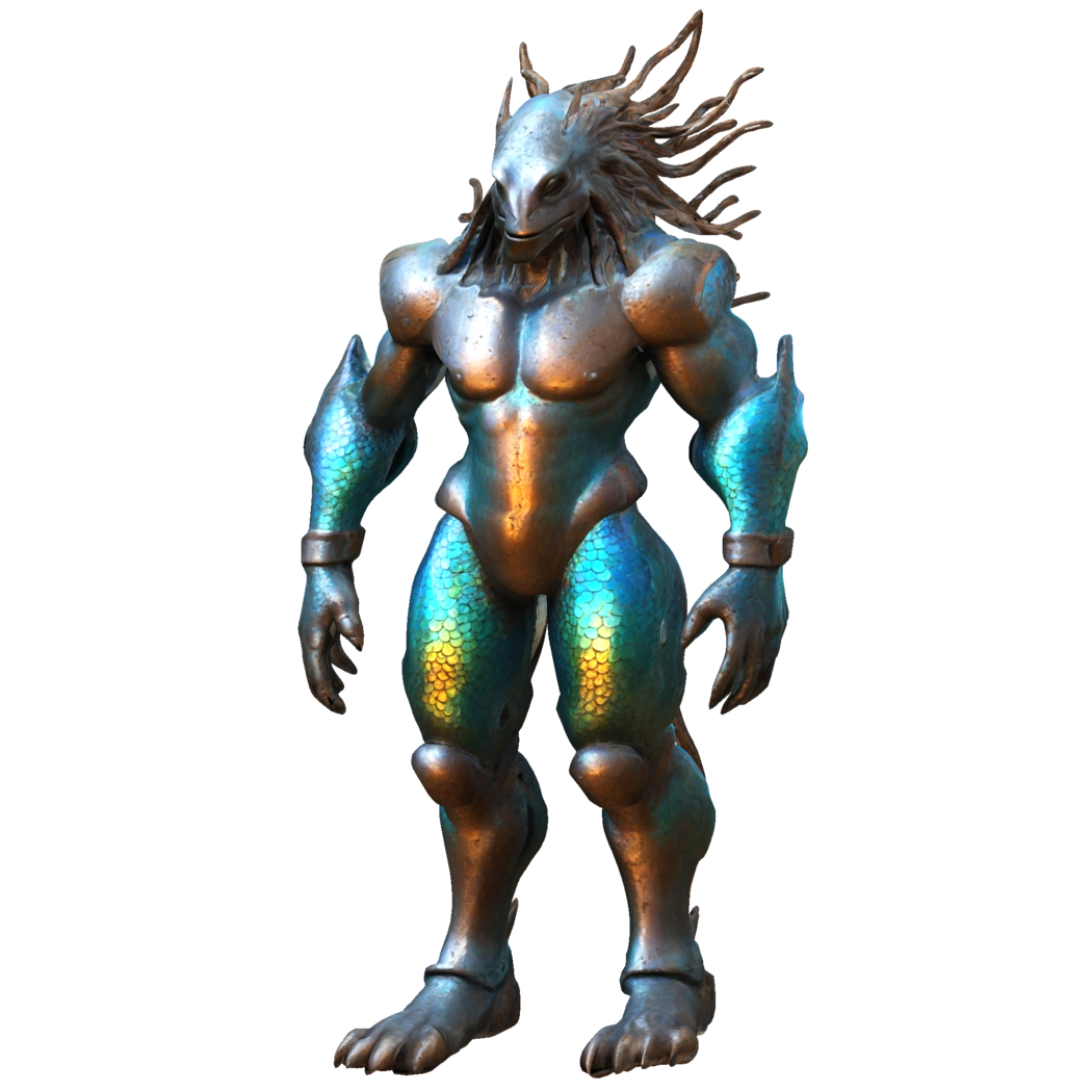 This stunning 3D model depicts a humanoid aquatic warrior with striking iridescent scales and unique anatomical features. The character has a sleek, muscular build with a blend of human and amphibious characteristics. Its head features elongated tentacle-like appendages that resemble dreadlocks, and a smooth, somewhat alien face with a distinctive nose and mouth structure.