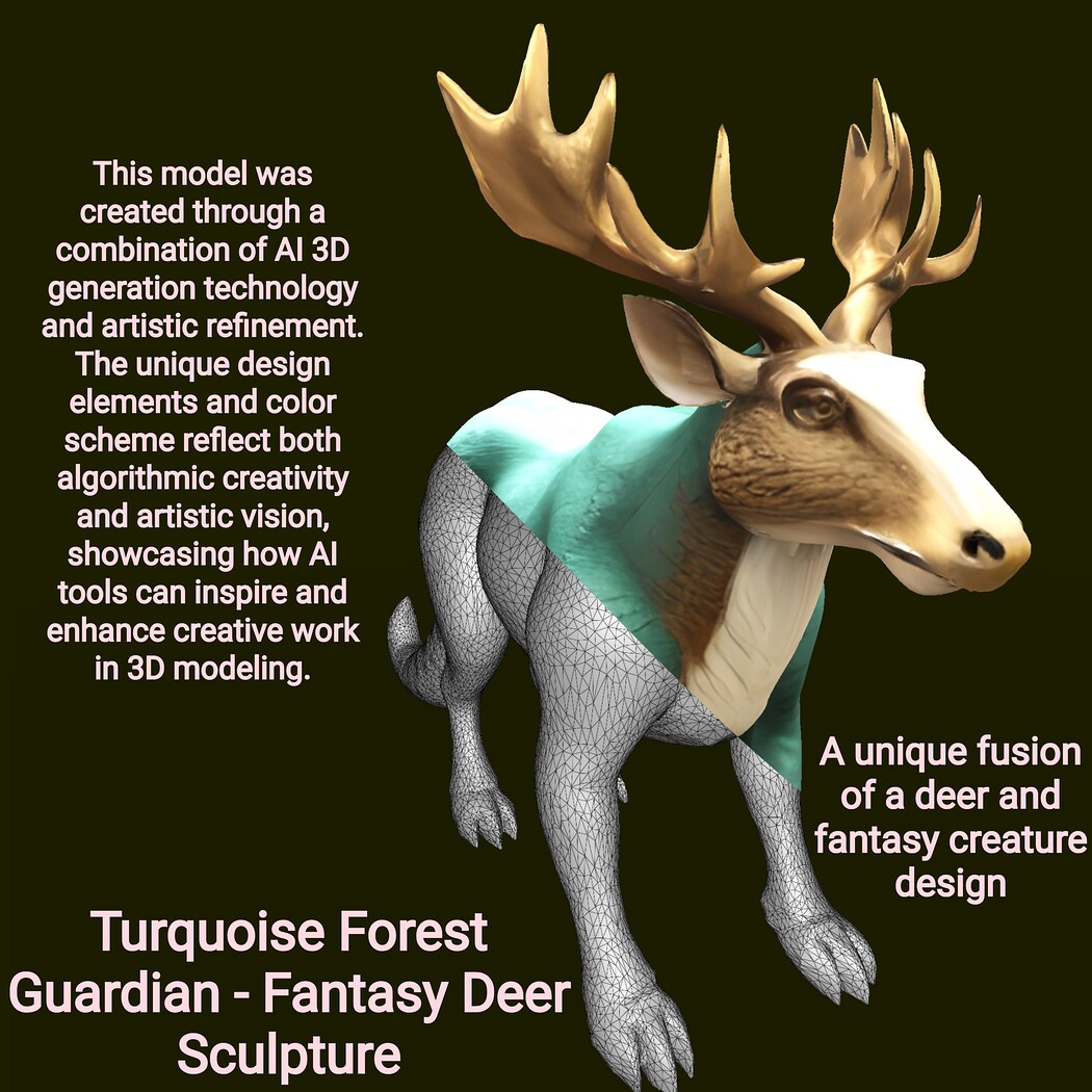 AI Disclosure: This model was created through a combination of AI 3D generation technology and artistic refinement. The unique design elements and color scheme reflect both algorithmic creativity and artistic vision, showcasing how AI tools can inspire and enhance creative work in 3D modeling.