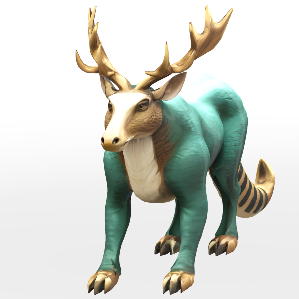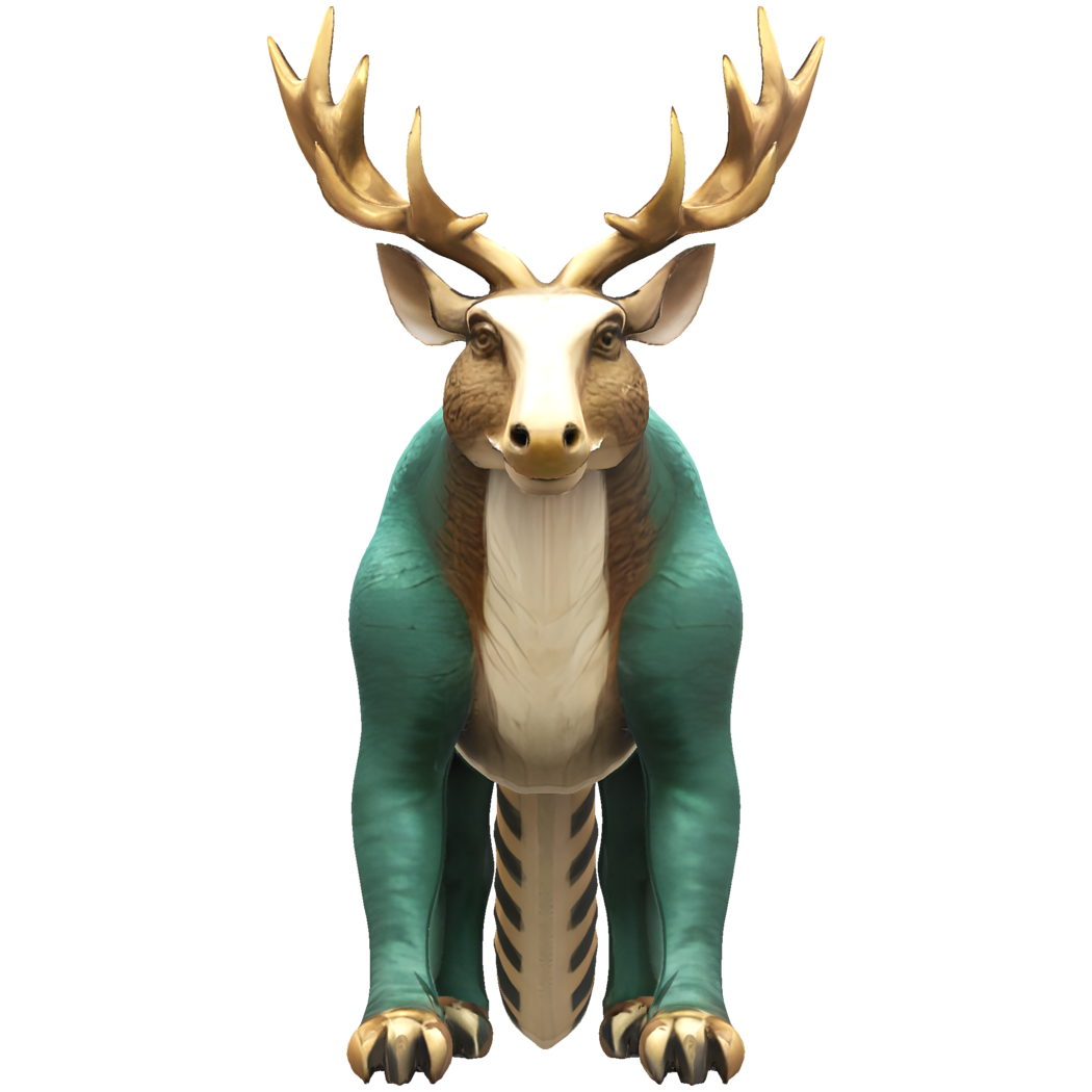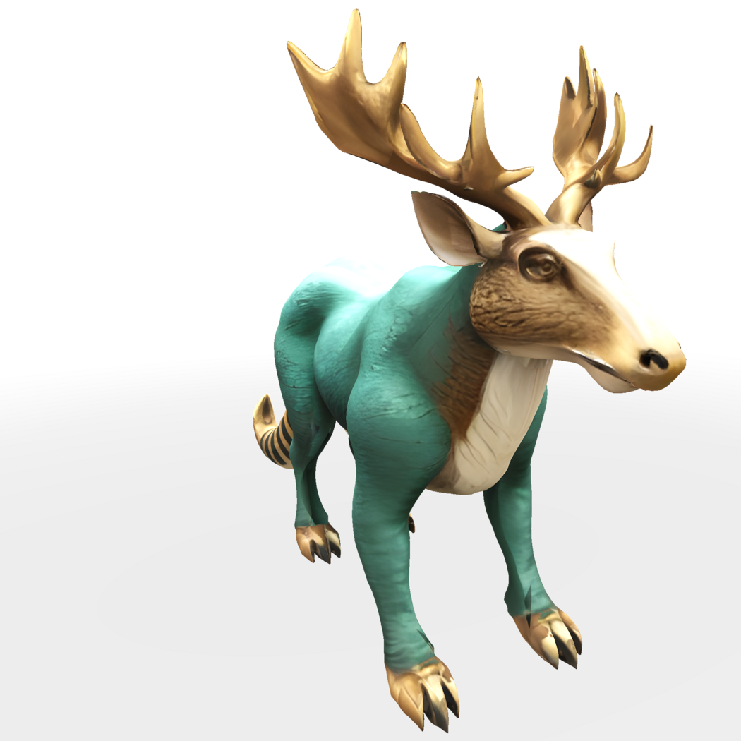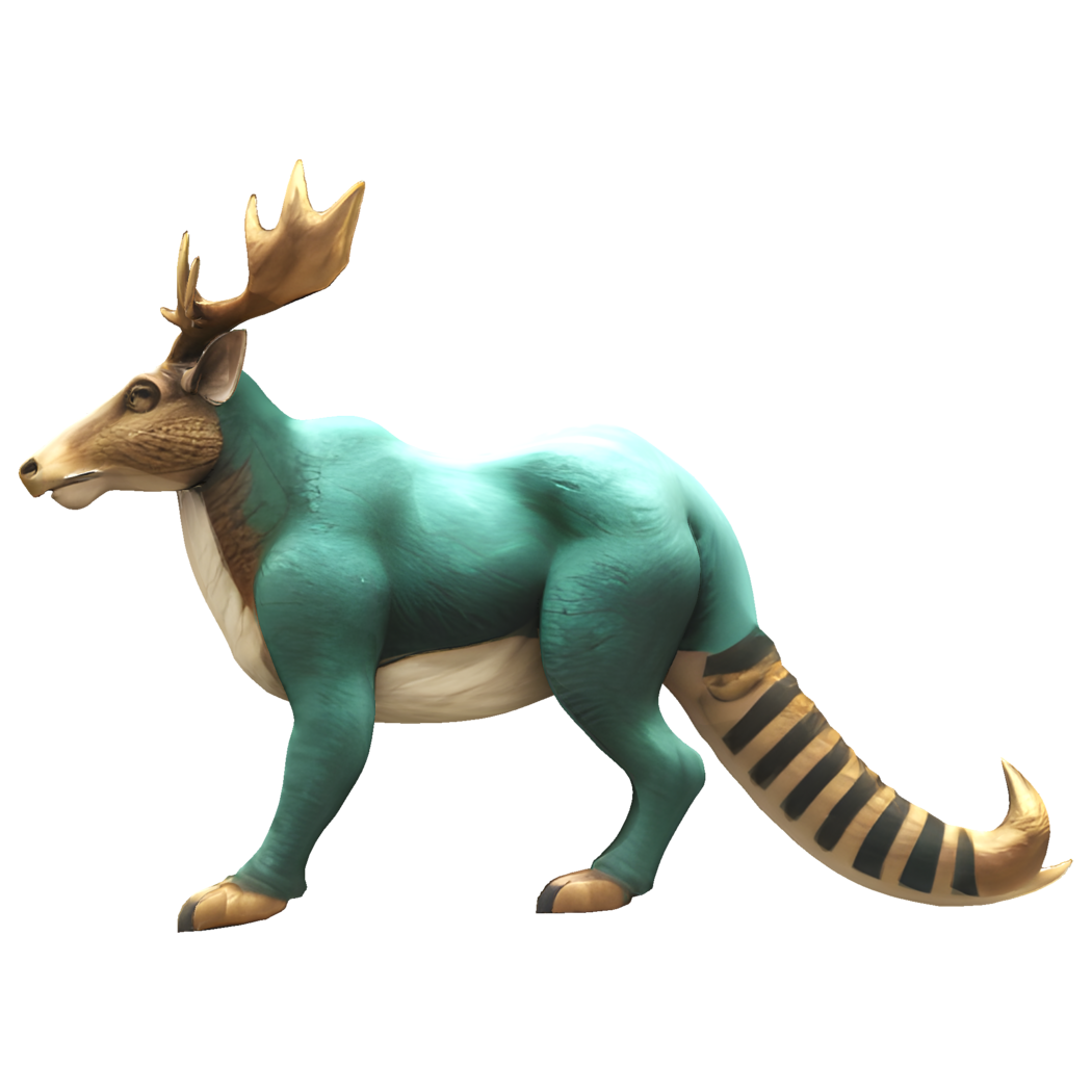 This enchanting 3D model features a unique fusion of a deer and fantasy creature design. The model sports magnificent golden antlers and a distinctive turquoise-colored body, creating a striking contrast. The creature has the majestic head of a deer with detailed facial features, complemented by a cream-colored chest area. What makes this design particularly special is its fantasy elements - the body is muscular with a unique texture, and it features a striped tail reminiscent of mystical creatures. The design maintains a perfect balance between realism and fantasy.