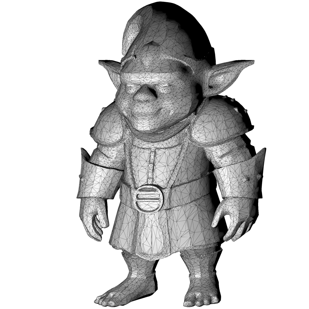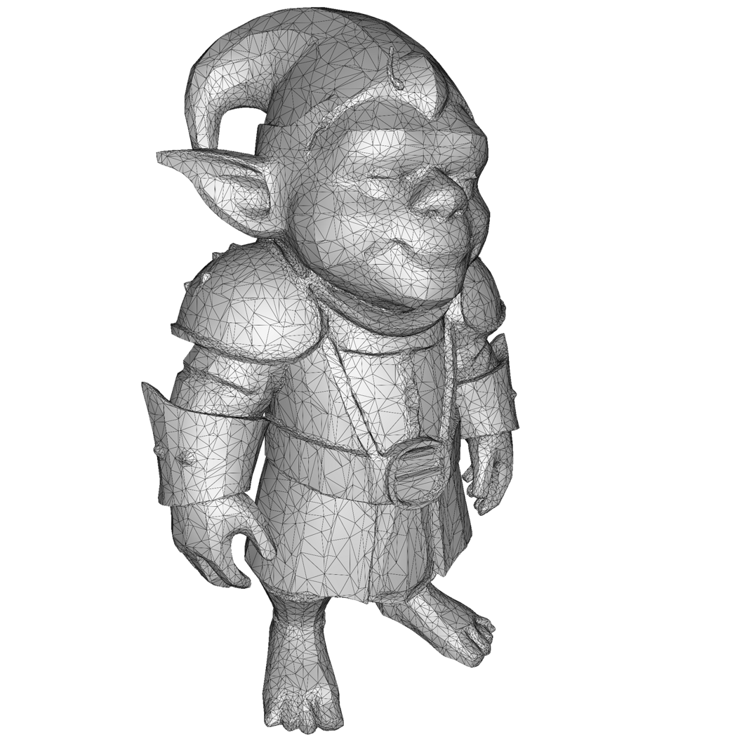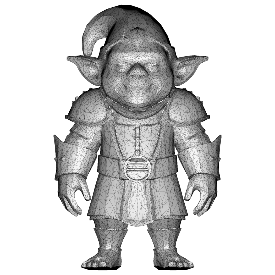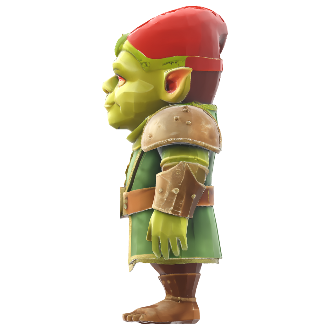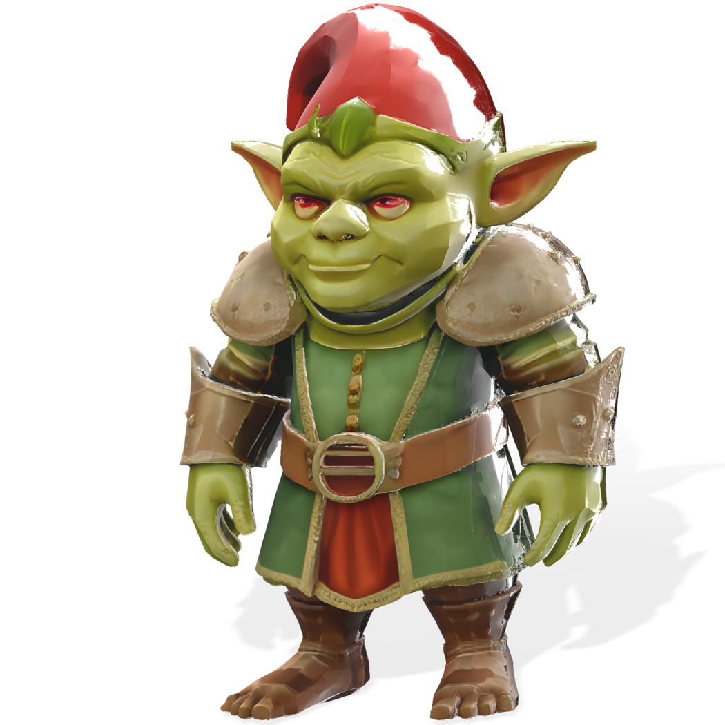 This delightful 3D model features a mischievous-looking goblin character dressed in medieval fantasy attire. The character sports a distinctive green complexion, pointed ears, and a playful smirk. They're wearing a detailed outfit consisting of a green tunic with red accents, brown leather armor pieces on the shoulders, and a prominent belt with a circular buckle. The model includes nice details like the red Santa-style hat and bare feet, giving it a whimsical touch.
