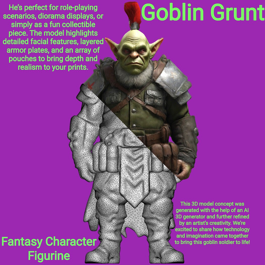 AI Use Disclosure This 3D model concept was generated with the help of an AI 3D generator and further refined by an artist’s creativity. We’re excited to share how technology and imagination came together to bring this goblin soldier to life!