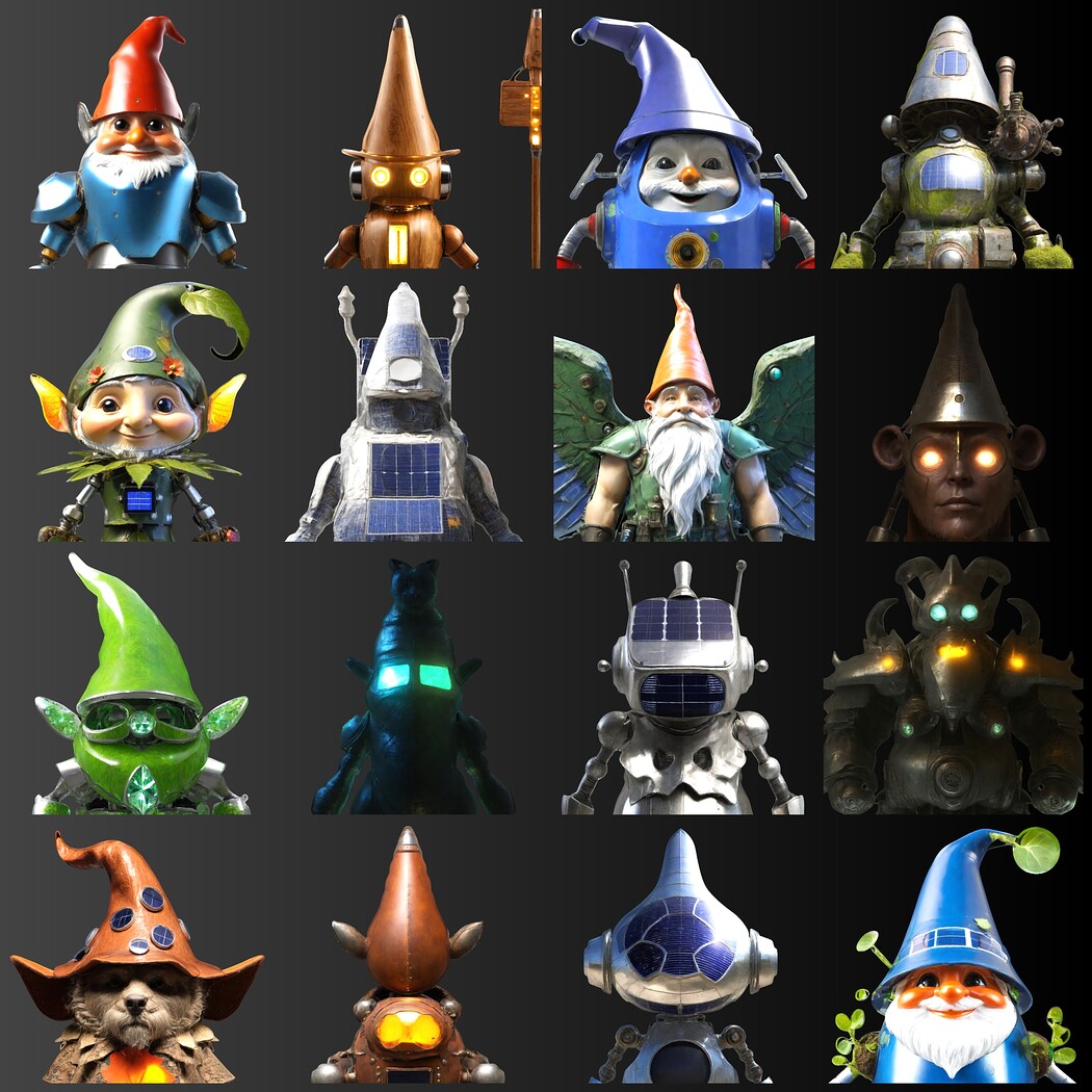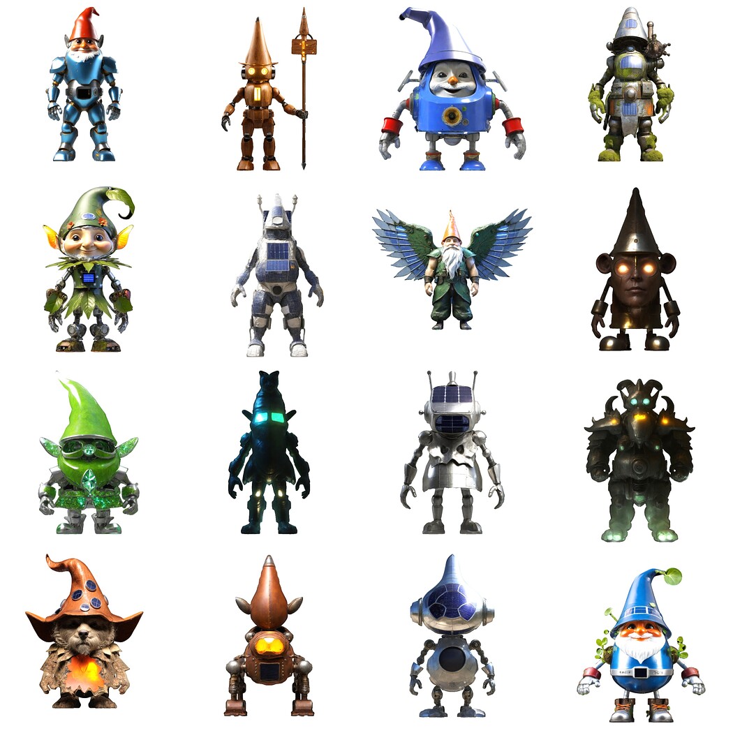 This collection features 16 unique guardian characters, each with distinctive personalities and design elements: - Classic gnomes with pointed hats and mystical features - Mechanical/robotic variants with illuminated elements - Nature-inspired guardians with organic components - Battle-ready defenders with weapons and armor - Solar-powered sentinels with technological enhancements
