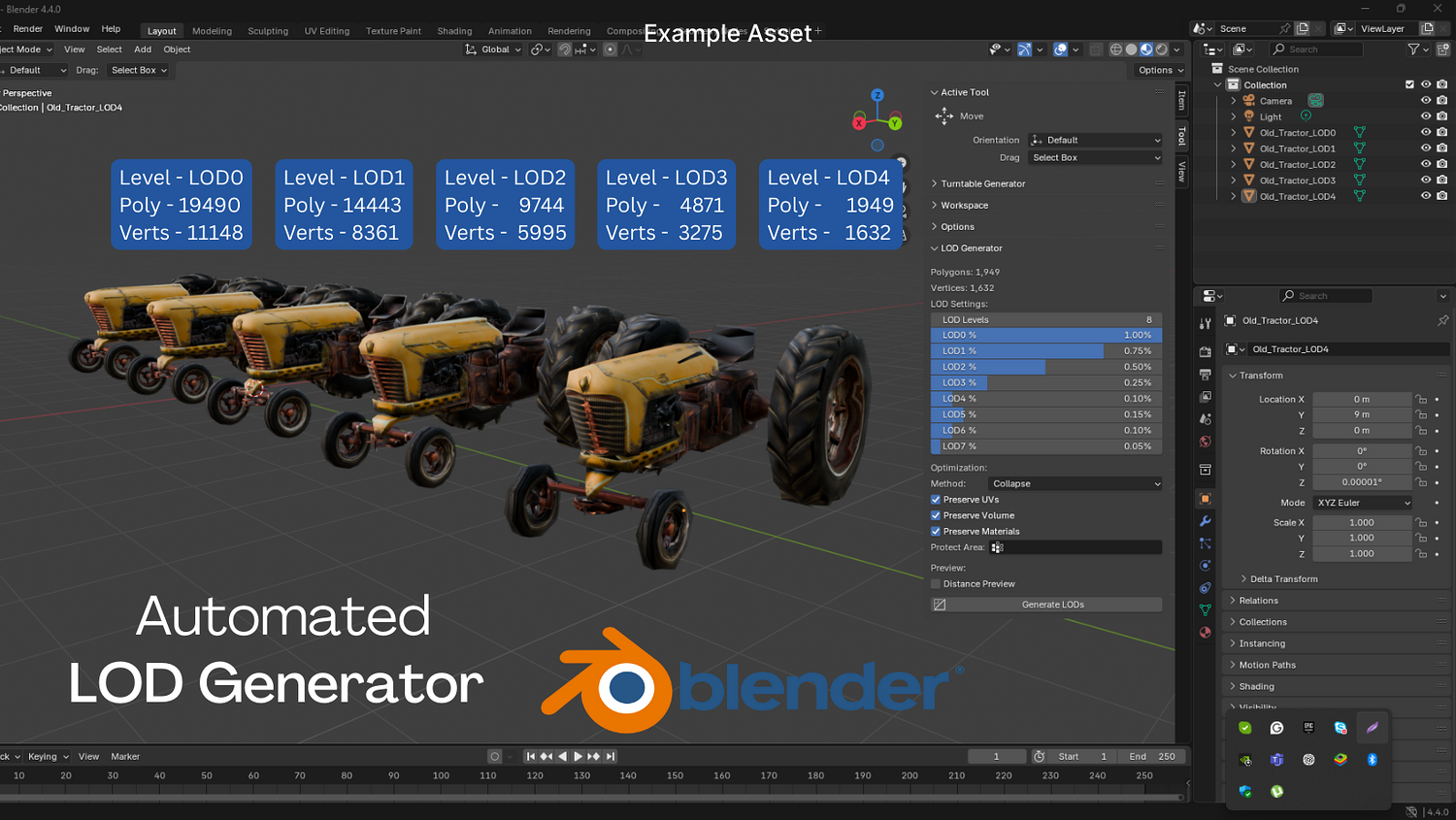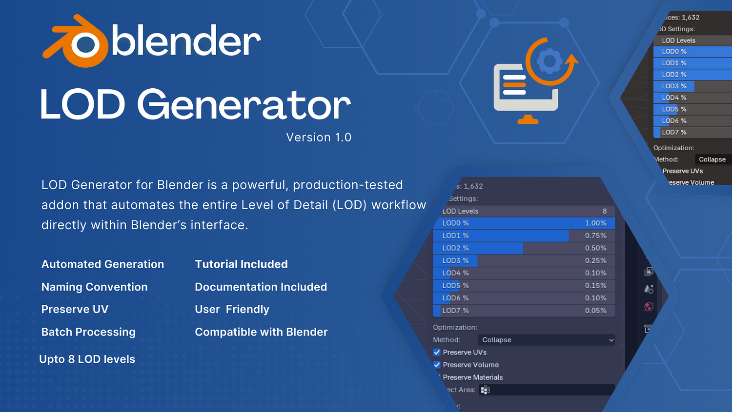 👀 Real-time distance preview support in the camera view 📉 Displays poly and vertex count for selected objects 🧠 Preserve UVs, volume, and materials during mesh decimation 🧩 Clean and simple UI inside the N-panel (press N to access) 📁 Auto-naming system (_lodX appended to object names) 🔄 Works on multiple selected objects for batch LOD generation