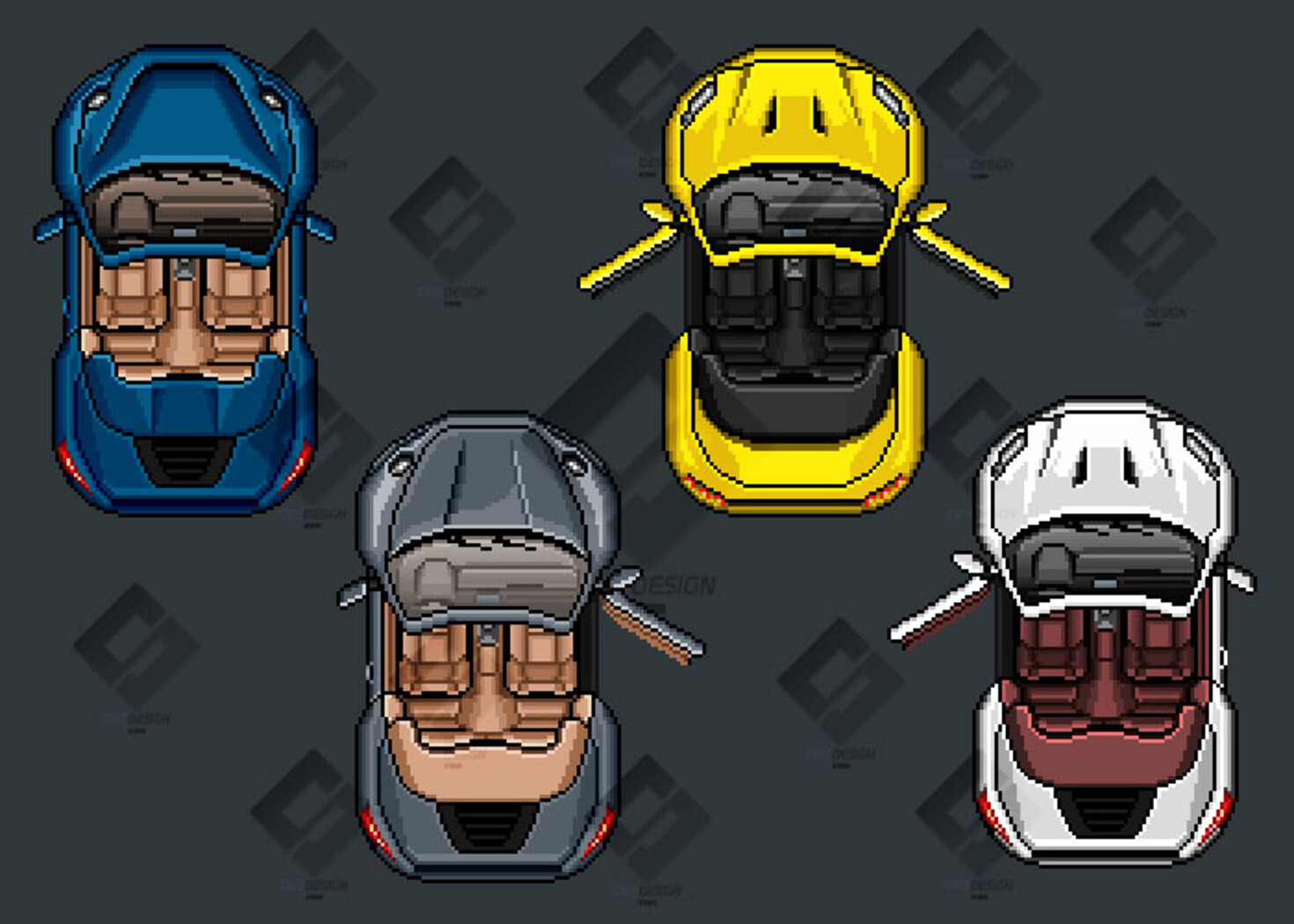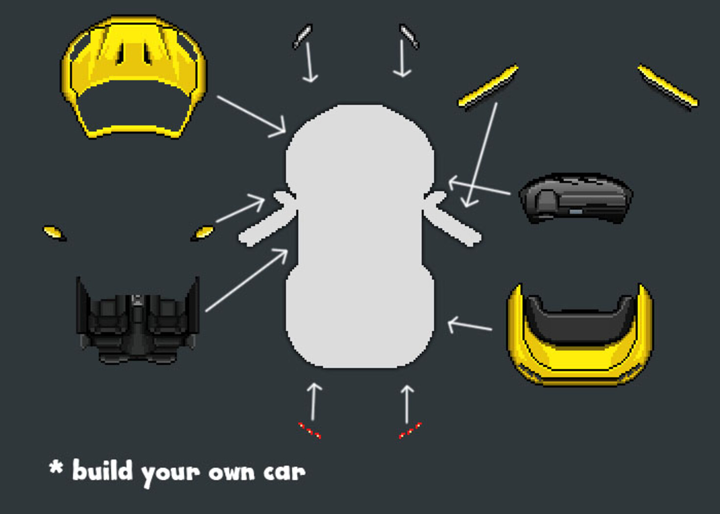 4 builder's guide 4 car interior 4 windshield 3 headlights 3 taillights 6 color variations for the car door (open) 6 color variations for the car door (close) 11 color variations for the side mirror (open) 11 color variations for the side mirror (close) 3 design variations for the hood with 5 different colors 3 design variations for the trunk with 5 different colors
