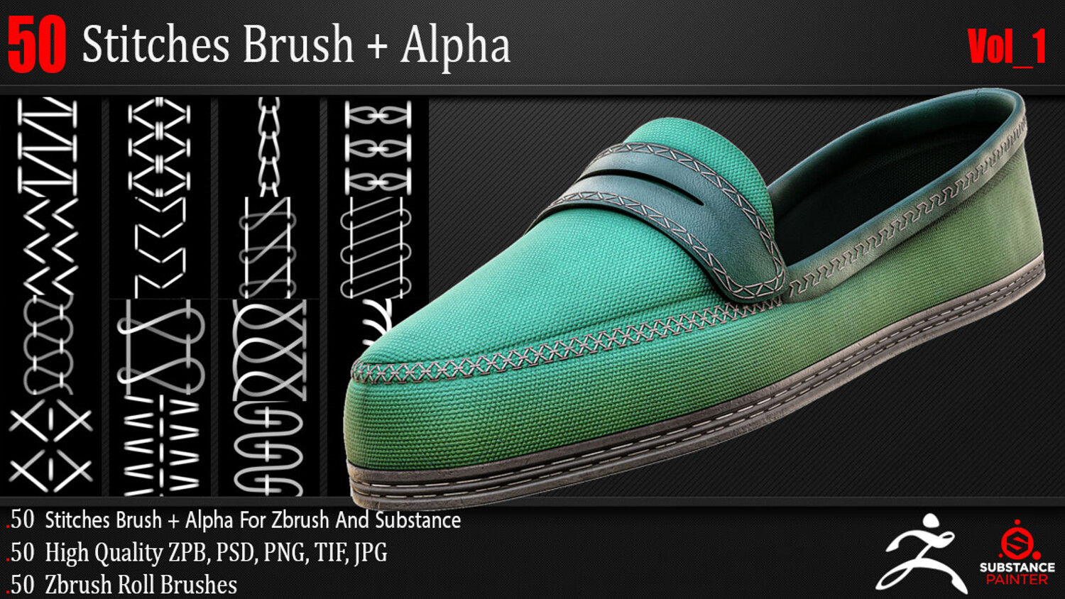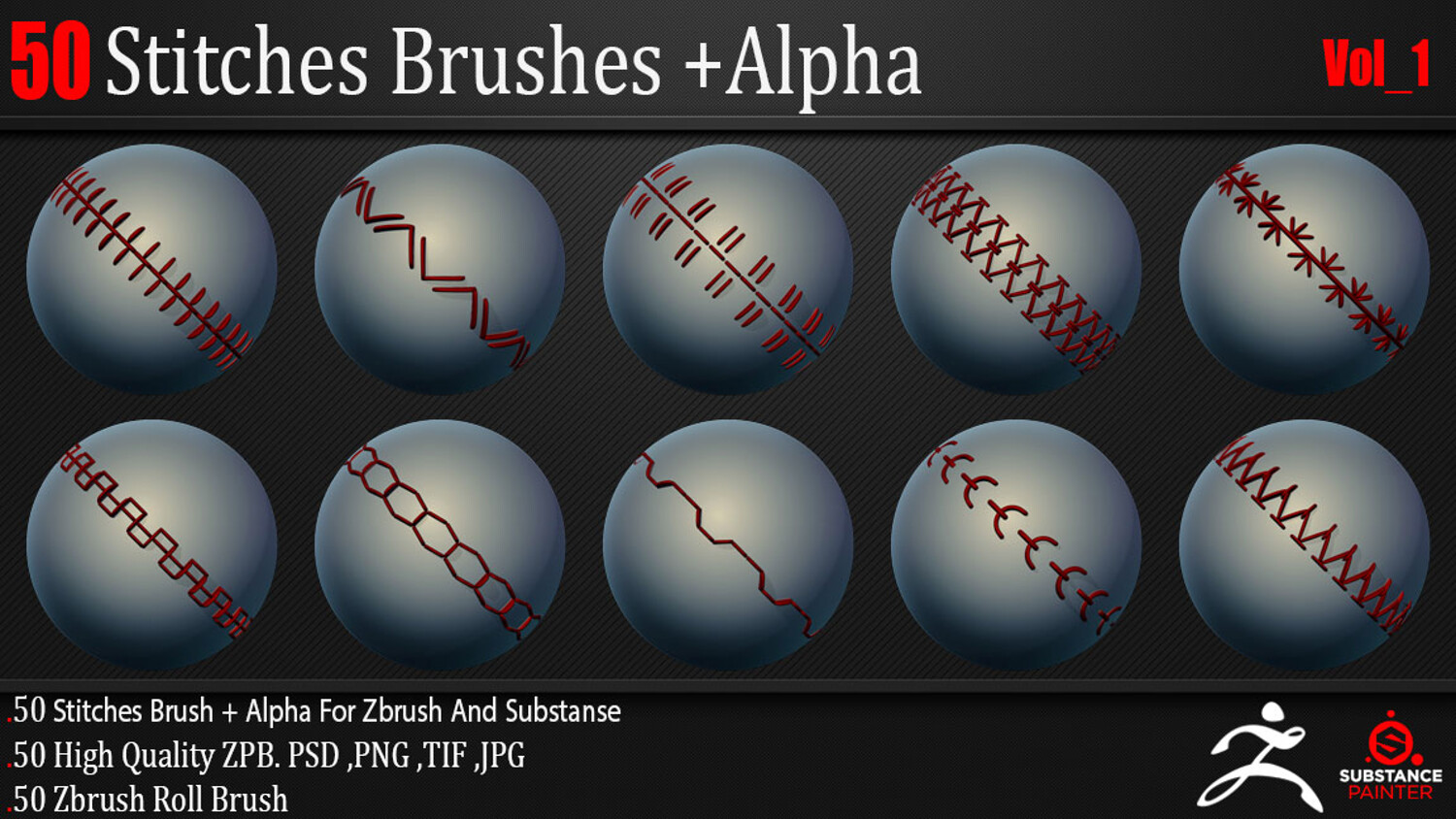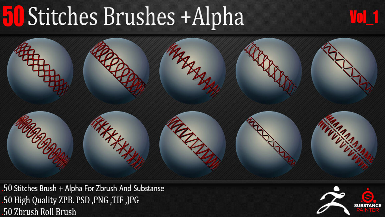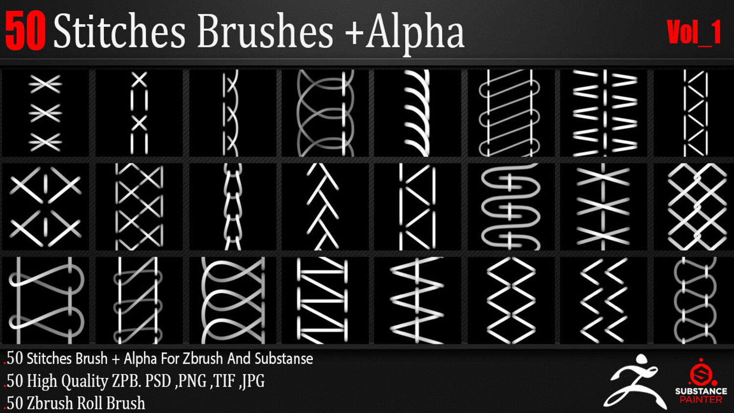 50 Stitches Alpha in PSD, JPG, TIF, and PNG 50 Stitches Brush for ZBrush 50 Stitches Brush for Substance Brush (sppr) 50 Stitches Brush Preview