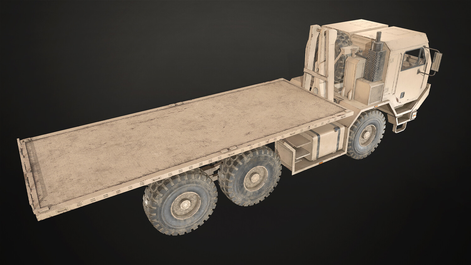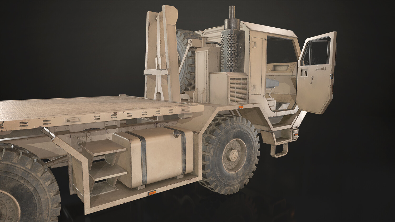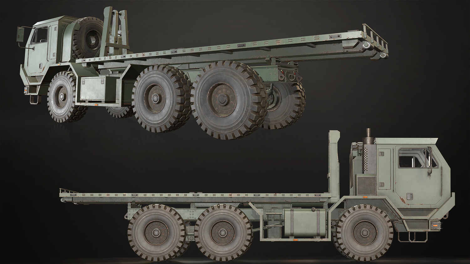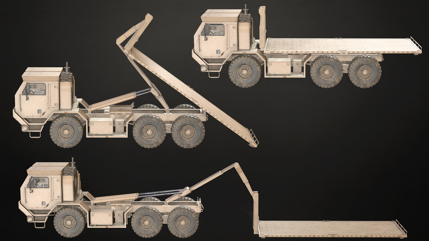 - All doors, wheels, steering wheel and shifter are separate objects and can be easily rigged/animated. Flatbed parts such as bed, arm and hydraulic cylinders also separated, ready to rig/animate (model NOT animated). It can all be detached if desired to use only truck chassis.